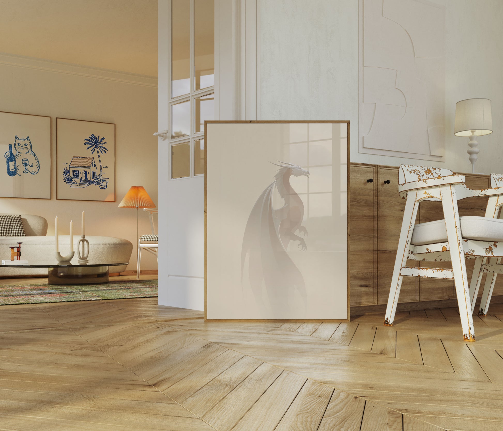 Sumérgete en el elegante y místico mundo de esta obra minimalista de dragón. Representada en suaves tonos beige monocromáticos, el dragón emerge con elegantes curvas y delicados detalles, capturando una poderosa serenidad sobre un fondo discreto. Esta impresionante ilustración invita al espectador a un mundo onírico donde criaturas míticas coexisten en pura y elegante simplicidad.