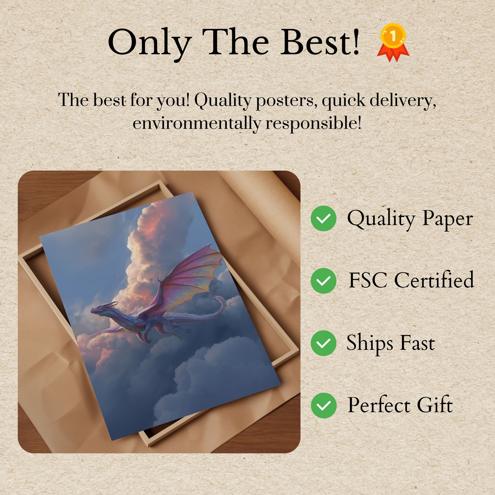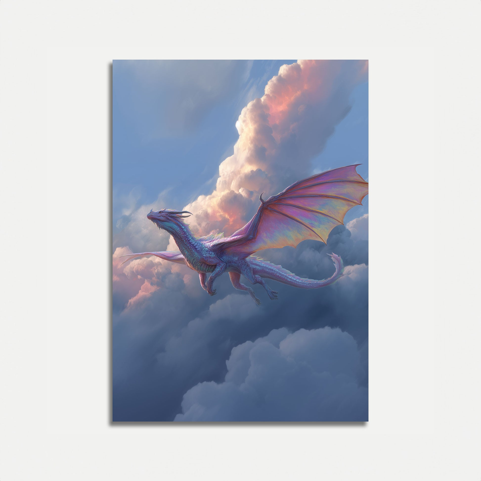 Surca un cielo de ensueño con este fascinante póster de dragón, que presenta una criatura azul luminiscente deslizándose entre nubes ondulantes bañadas en suaves tonos rosa y azul. Las escamas iridiscentes del dragón brillan con mágicos tonos púrpura y perla, creando una escena impresionante de belleza mítica y una atmósfera serena y maravillosa.