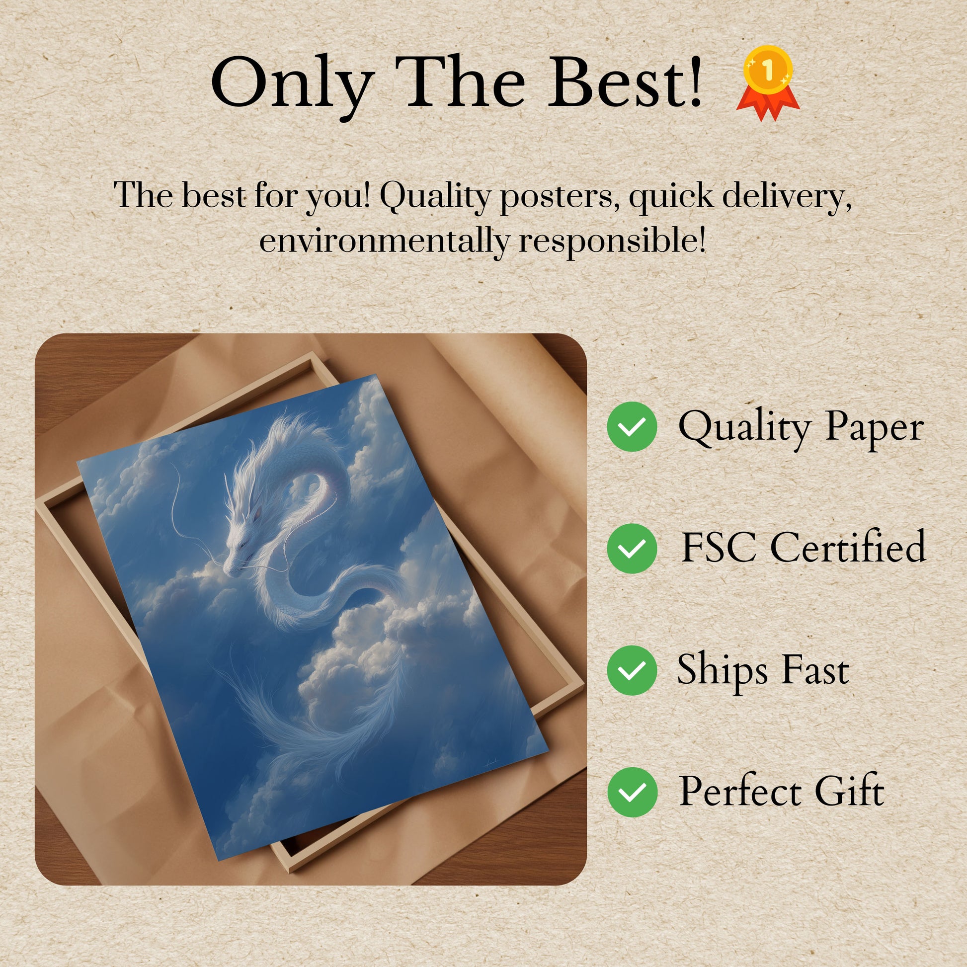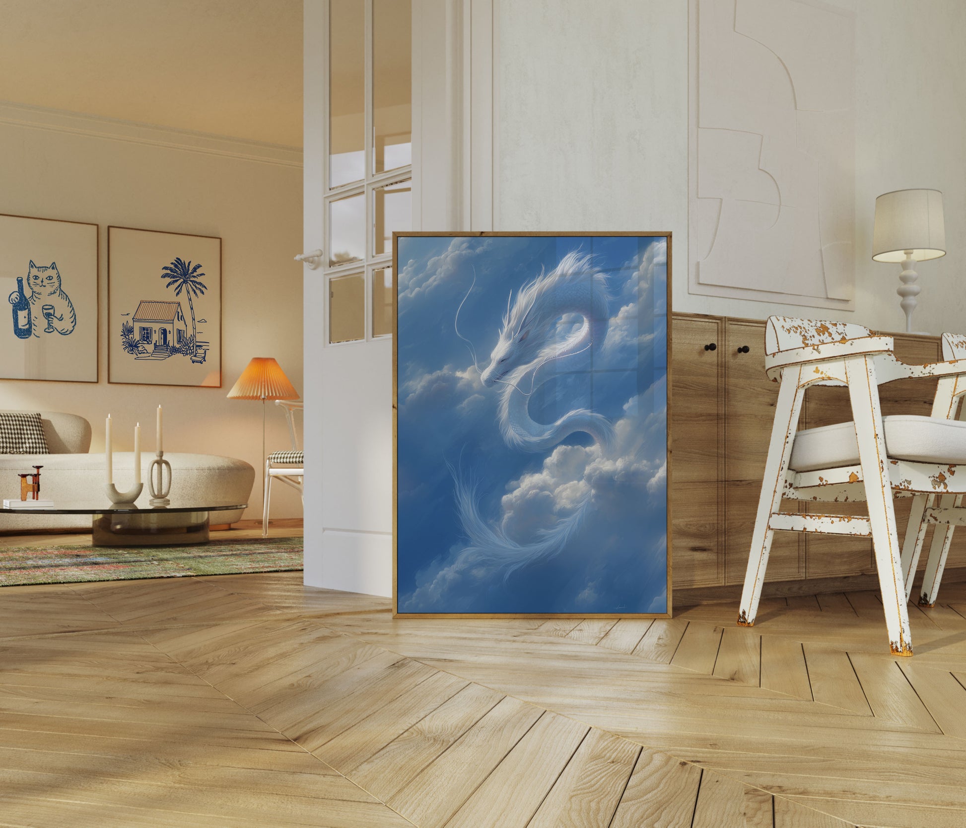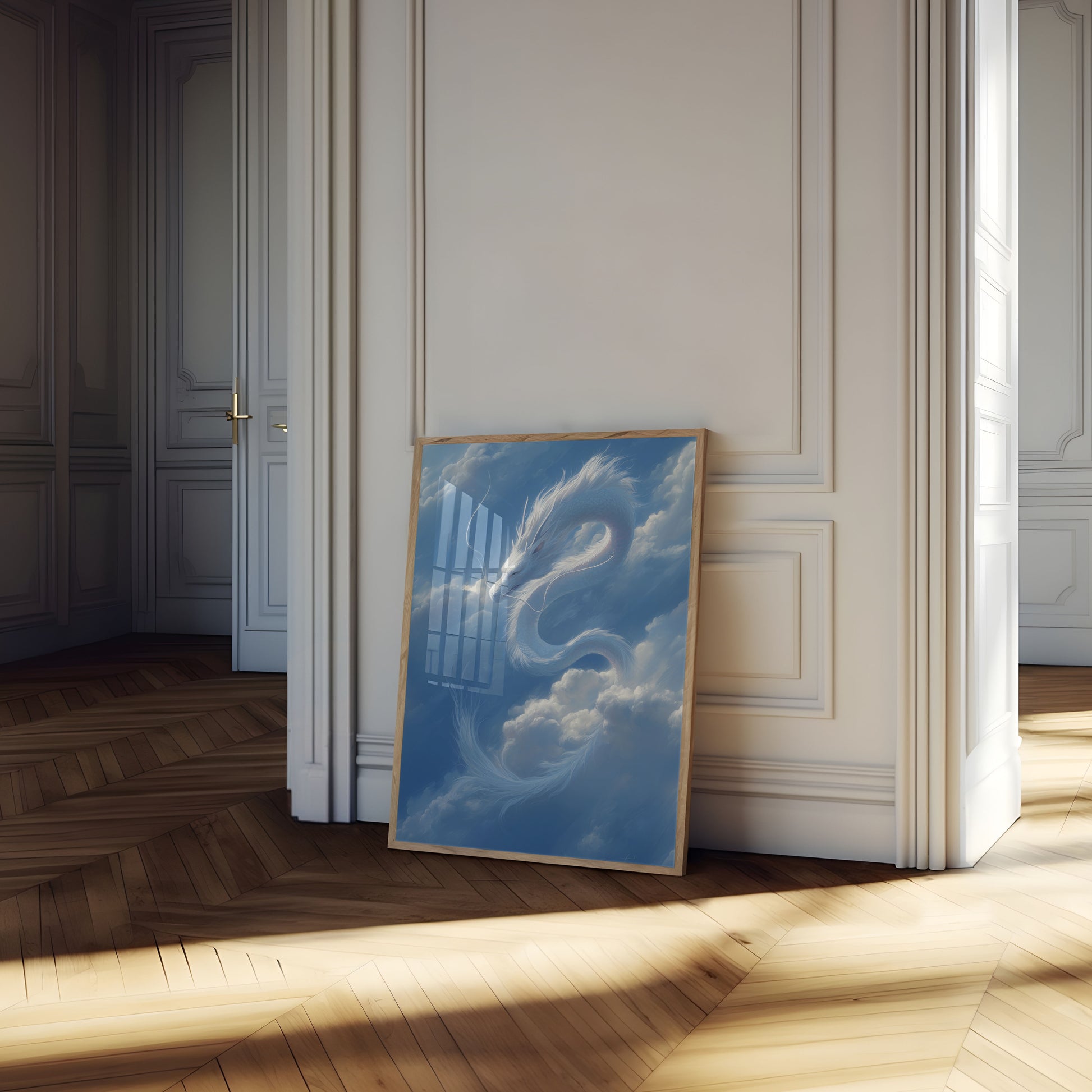 Sumérgete en un reino de maravillas celestiales con este fascinante dragón blanco que surca cielos azules luminosos. Delicada y etérea, su forma vaporosa parece tejida de nubes y luz, mientras su cuerpo sinuoso danza entre ondulantes cúmulos. Cada escama emplumada y su tenue zarcillo capturan una sensación de gracia mítica y serenidad que transporta al espectador a una dimensión onírica de pura imaginación.