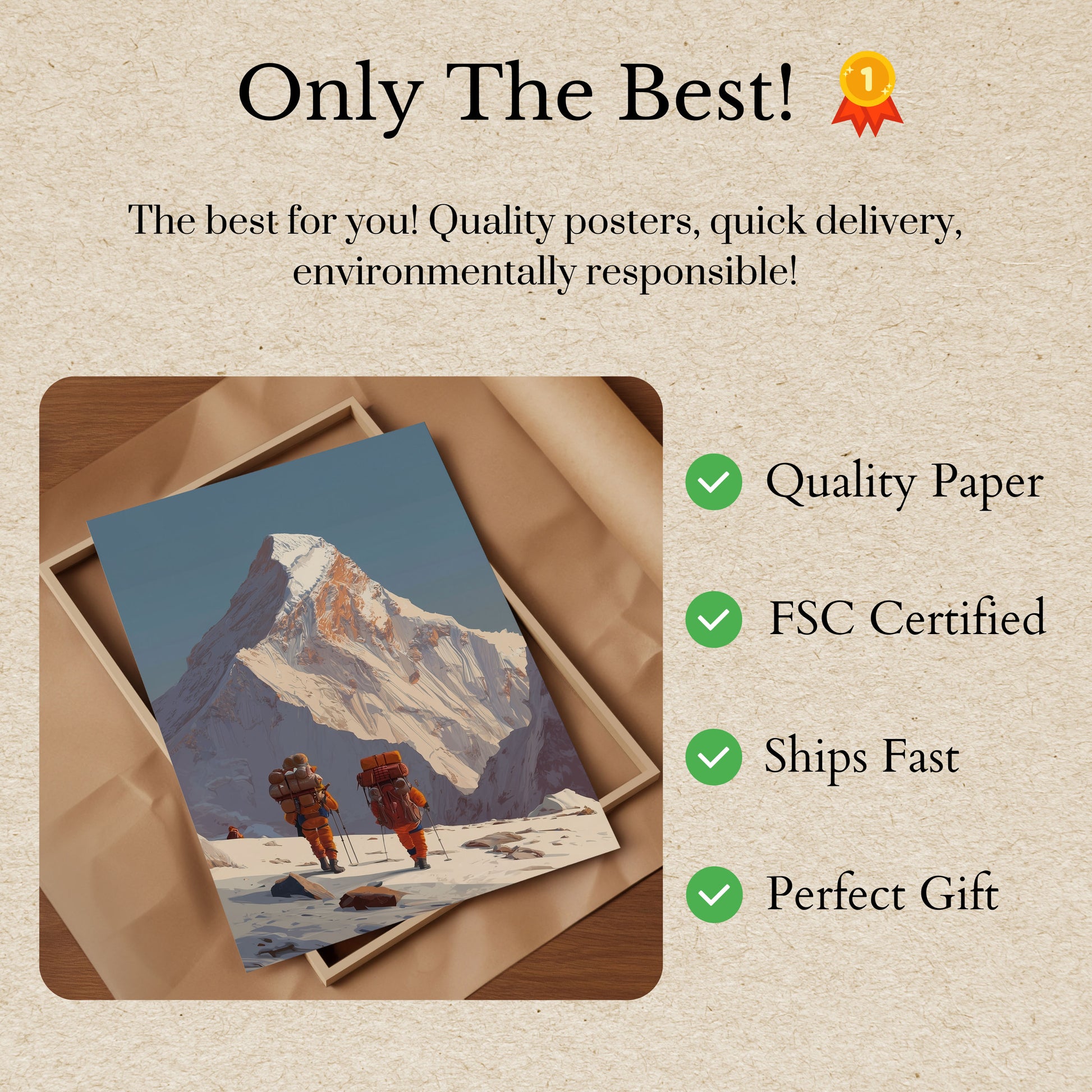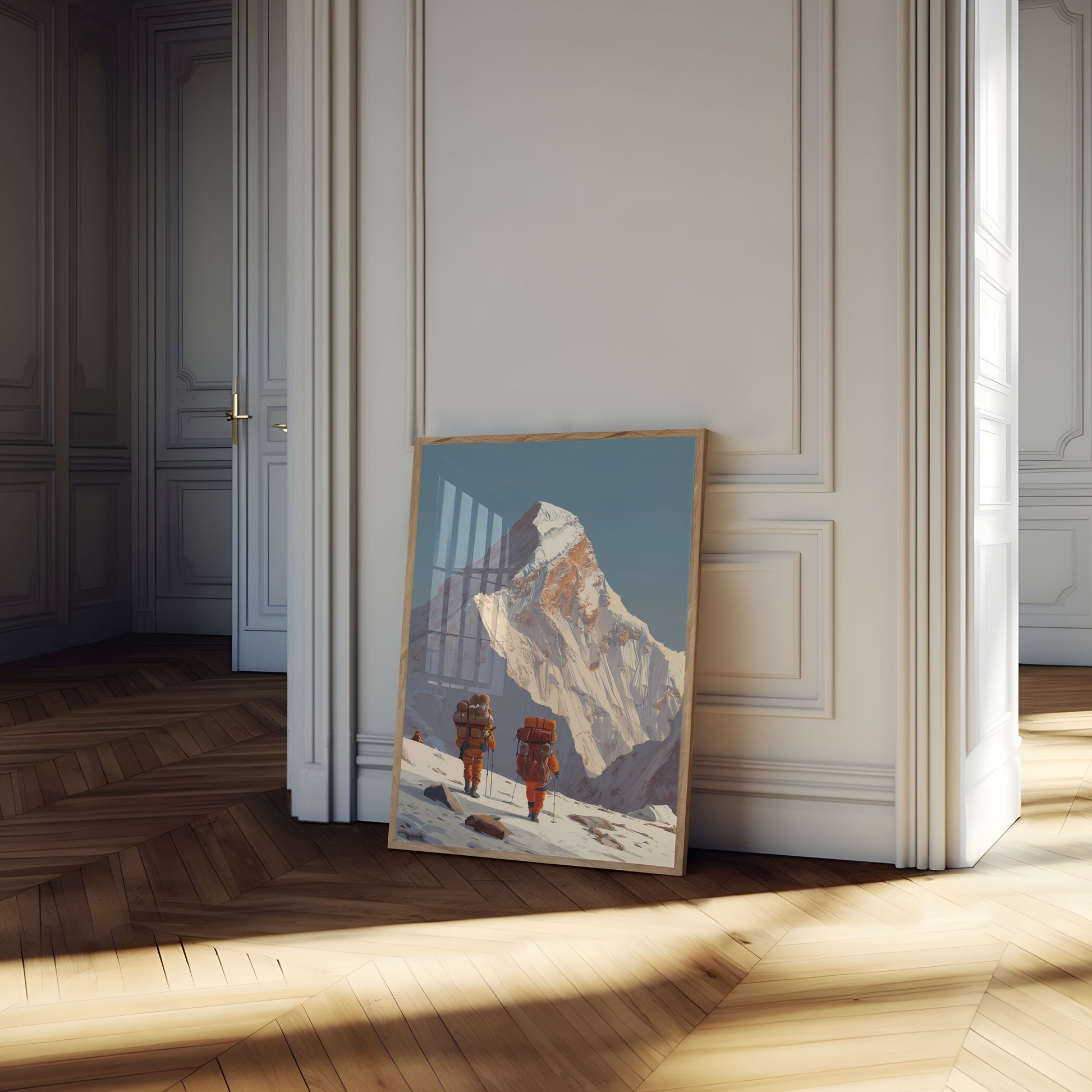 Experience the breathtaking majesty of high-altitude mountaineering with this stunning art print capturing two climbers against the dramatic backdrop of a snow-covered Himalayan peak. Rendered in a crisp, realistic style with warm orange climbing suits contrasting against the icy white mountain and cool blue sky, this image evokes the raw beauty, challenge, and human determination of alpine exploration. The meticulous details of the mountaineers' gear and the imposing mountain landscape create a powerful visual narrative of adventure and human endurance.