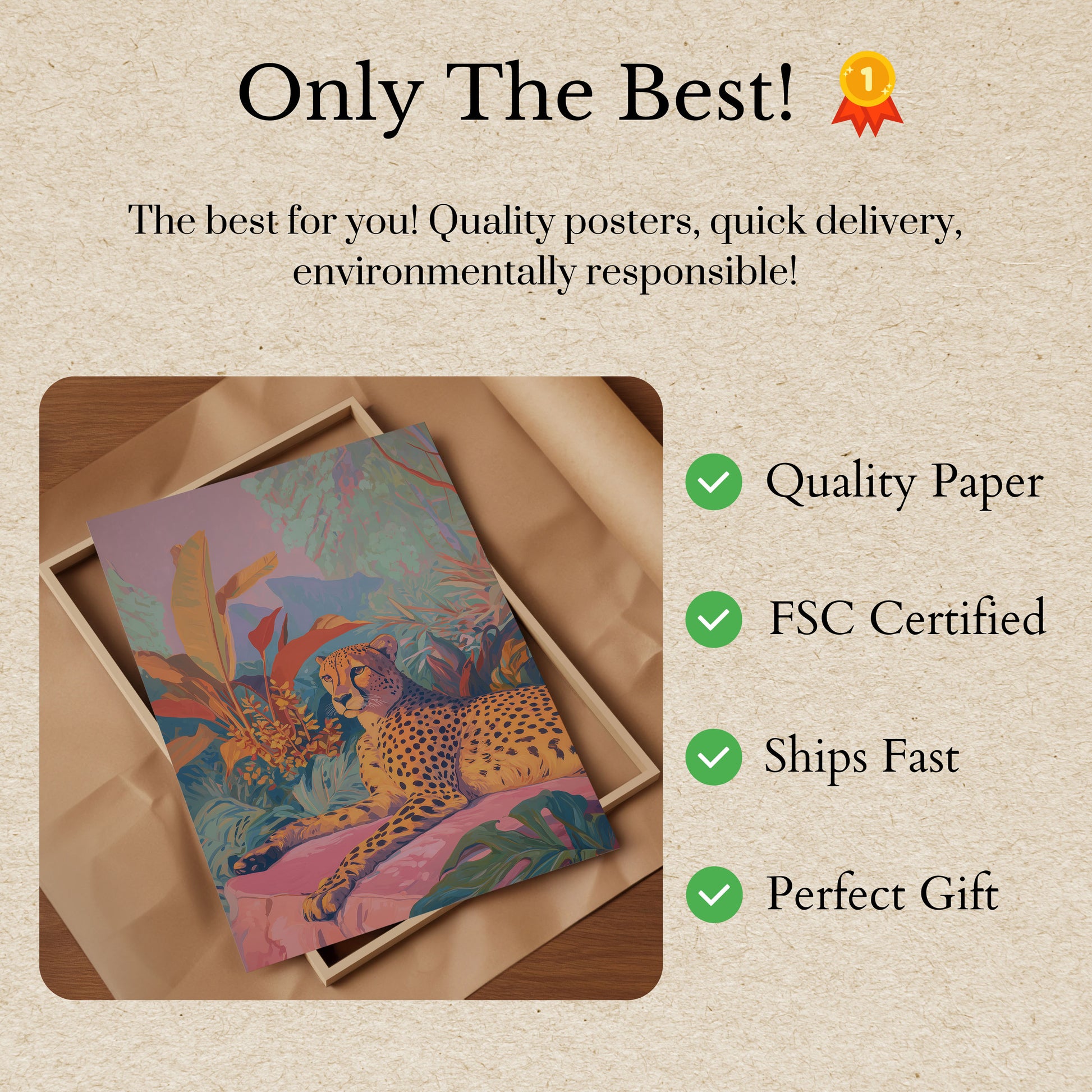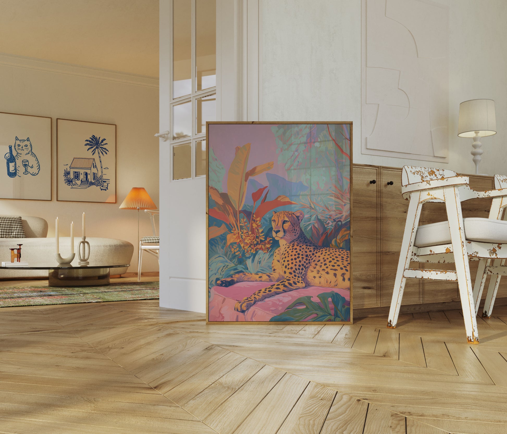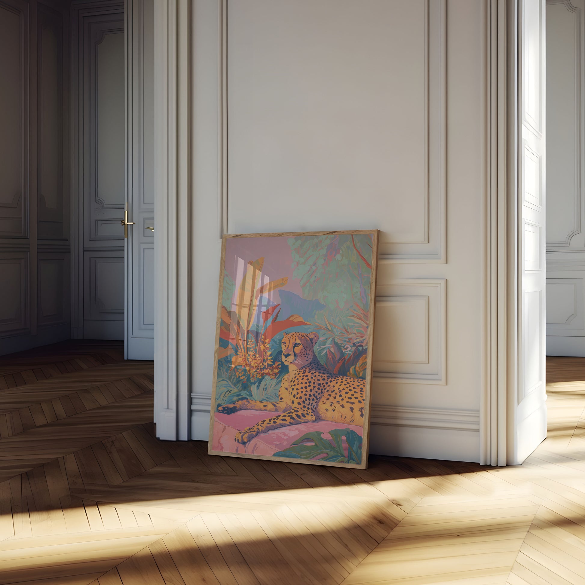 Sumérgete en un vibrante paraíso tropical donde un majestuoso guepardo descansa en un paisaje de ensueño de suaves tonos pastel y exuberante vegetación. Esta impresionante obra de arte captura la serenidad del gran felino, rodeado de hojas de plátano doradas y tonos neblinosos del bosque que crean una atmósfera encantadora, casi surrealista. La rica y cálida paleta de colores y los intrincados detalles botánicos invitan al espectador a un mundo fascinante donde la vida silvestre y la imaginación convergen en una hermosa armonía.