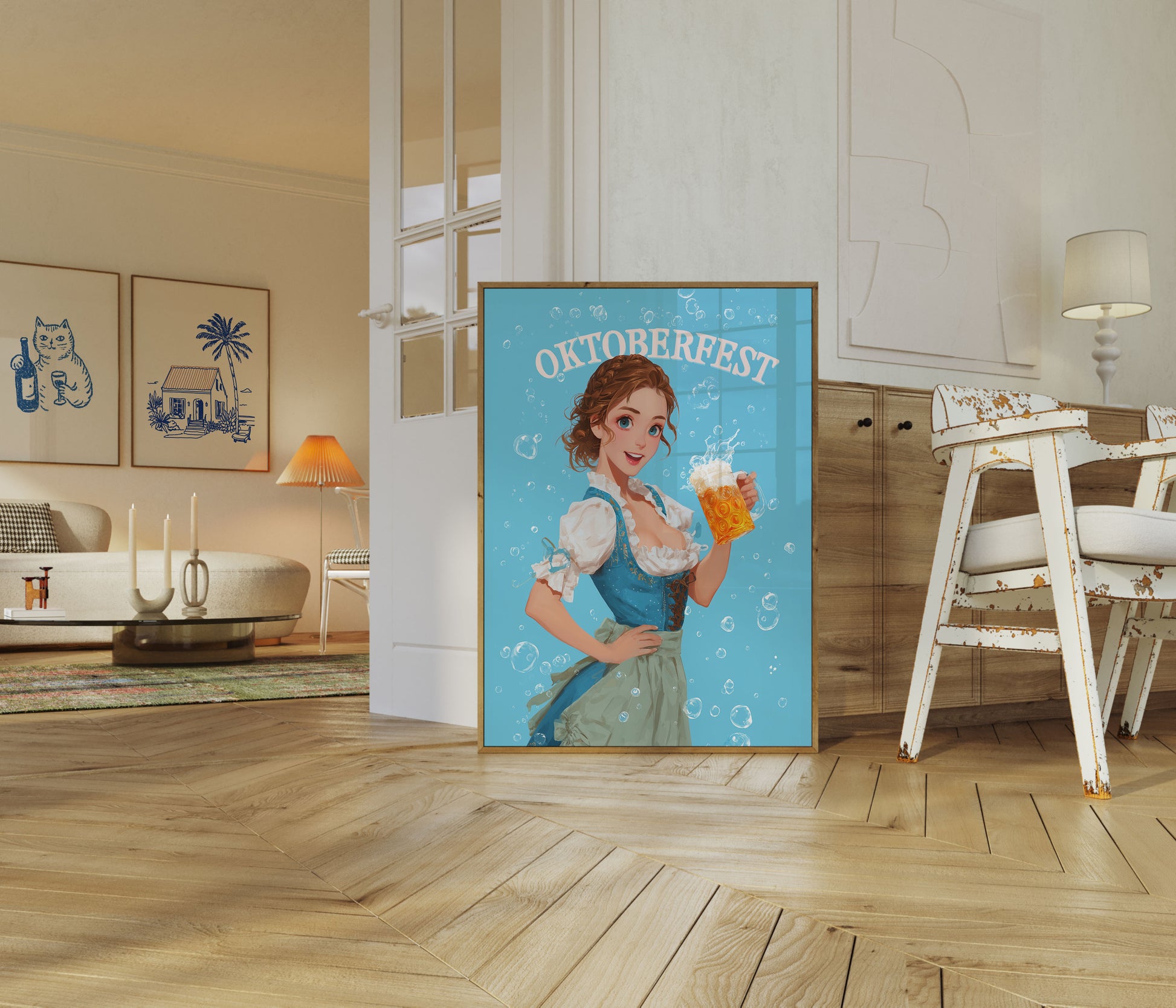 Dive into the vibrant world of Oktoberfest with this charming illustration featuring a cheerful woman in traditional Bavarian attire. Dressed in a blue dirndl with elegant white blouse, she holds a frothy beer stein amidst a playful background of bubbles and a soft blue backdrop. The artwork captures the joyful spirit of the famous German beer festival, with delicate details and a warm, inviting color palette that brings the celebration to life.