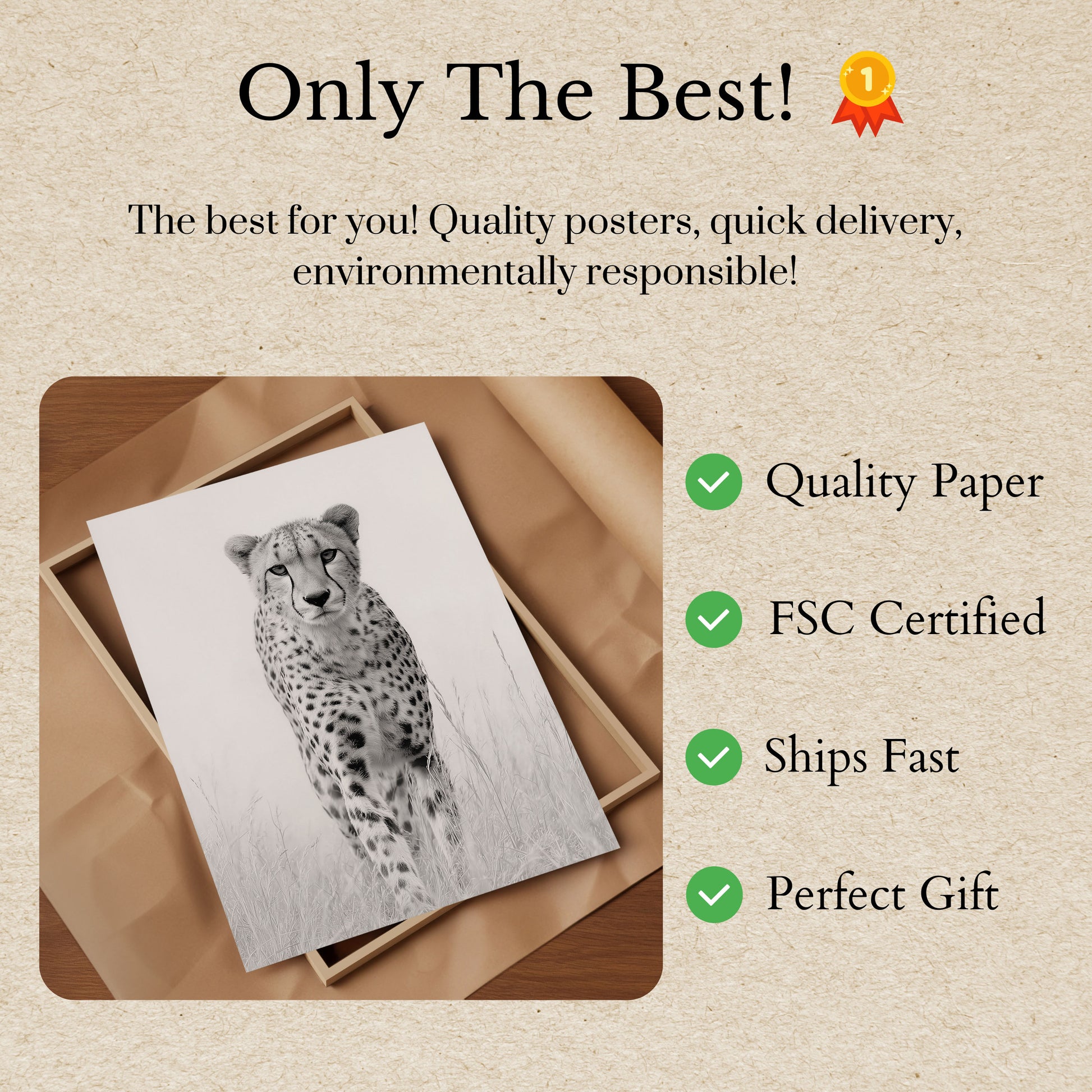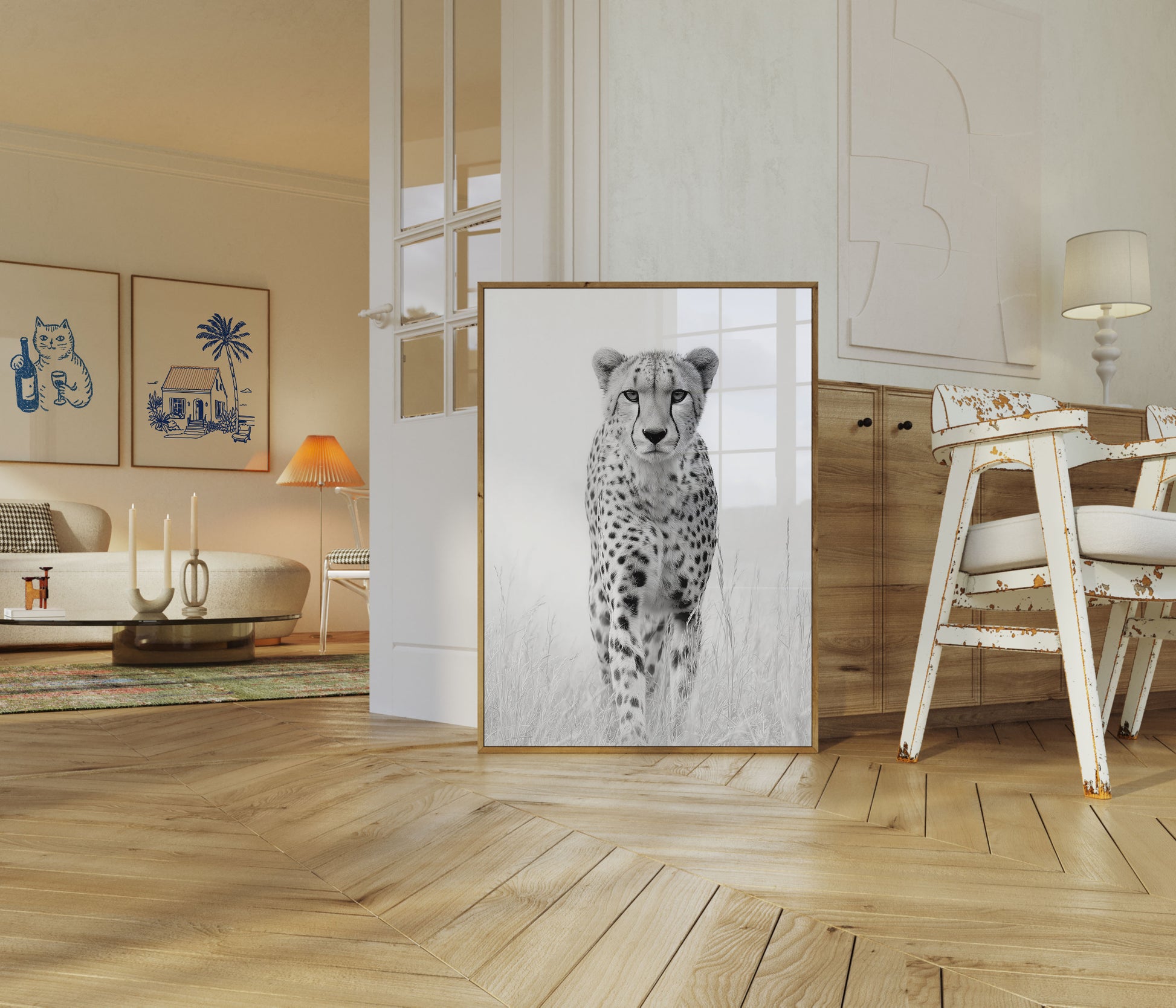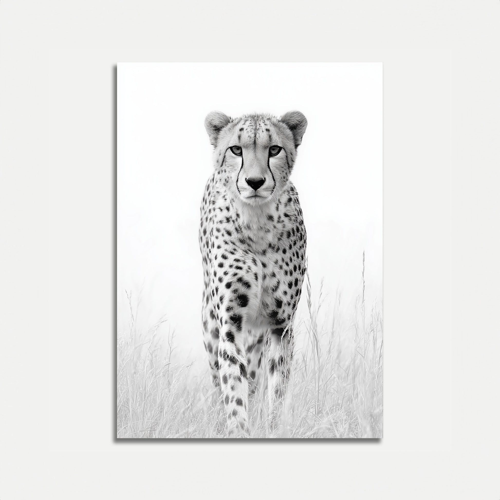 Captura la elegancia pura del mundo natural con este impresionante retrato de guepardo en blanco y negro. Con un fondo de pastizal suave y brumoso, esta impactante imagen muestra la intensa mirada del guepardo y su distintivo pelaje moteado con un detalle impresionante. La representación monocromática resalta cada curva muscular y el delicado patrón del pelaje, creando una imagen cautivadora que evoca la belleza indómita de la naturaleza.