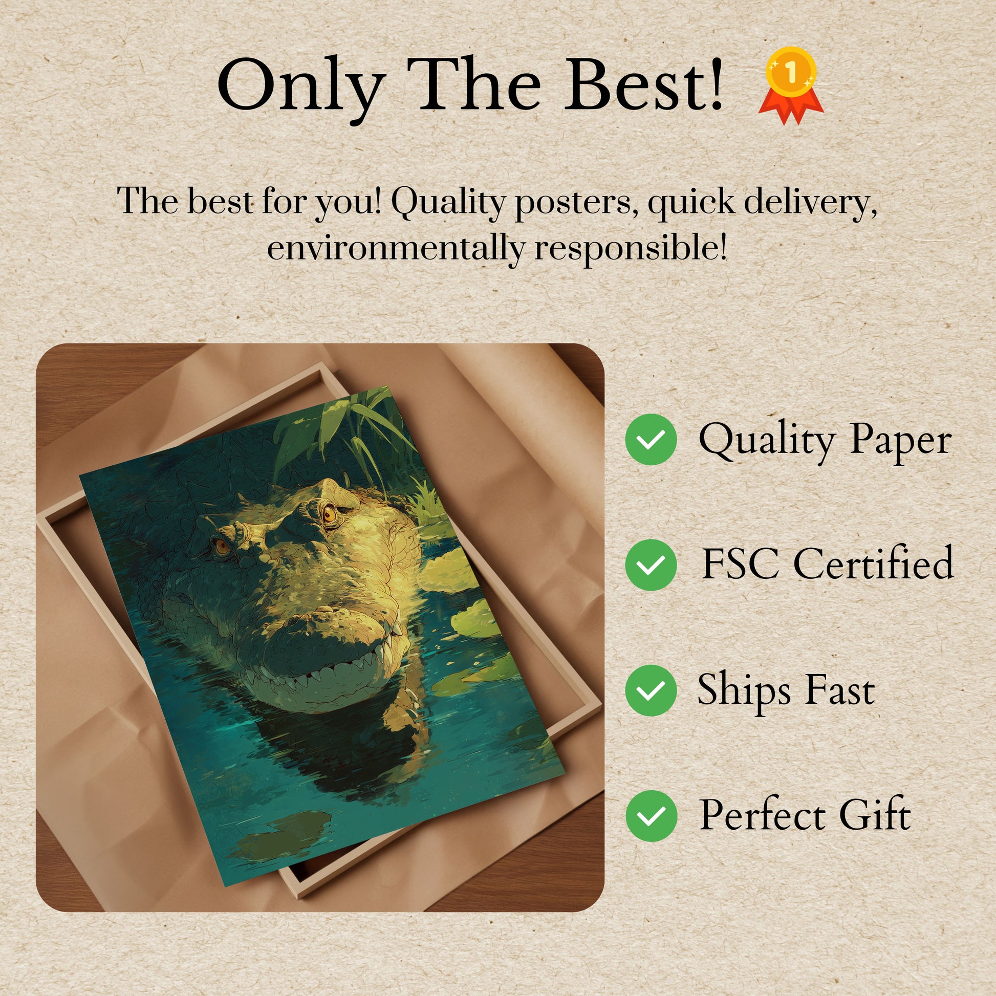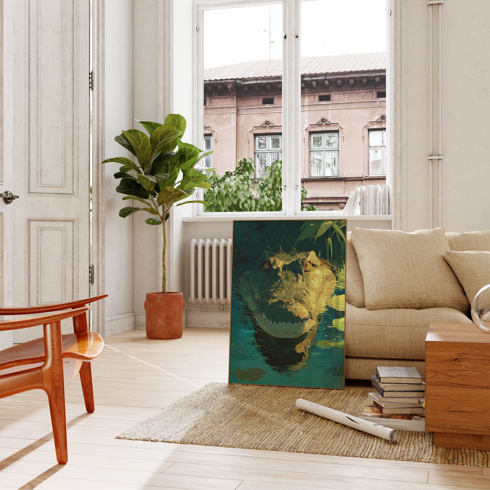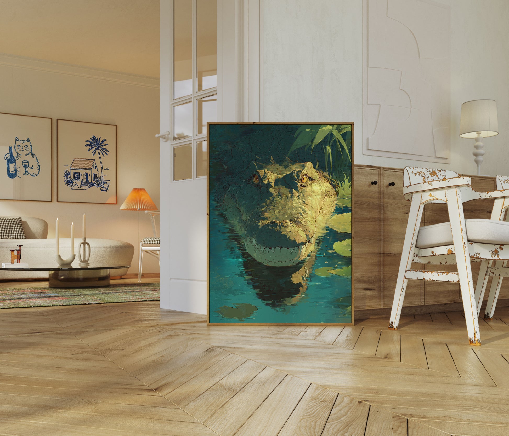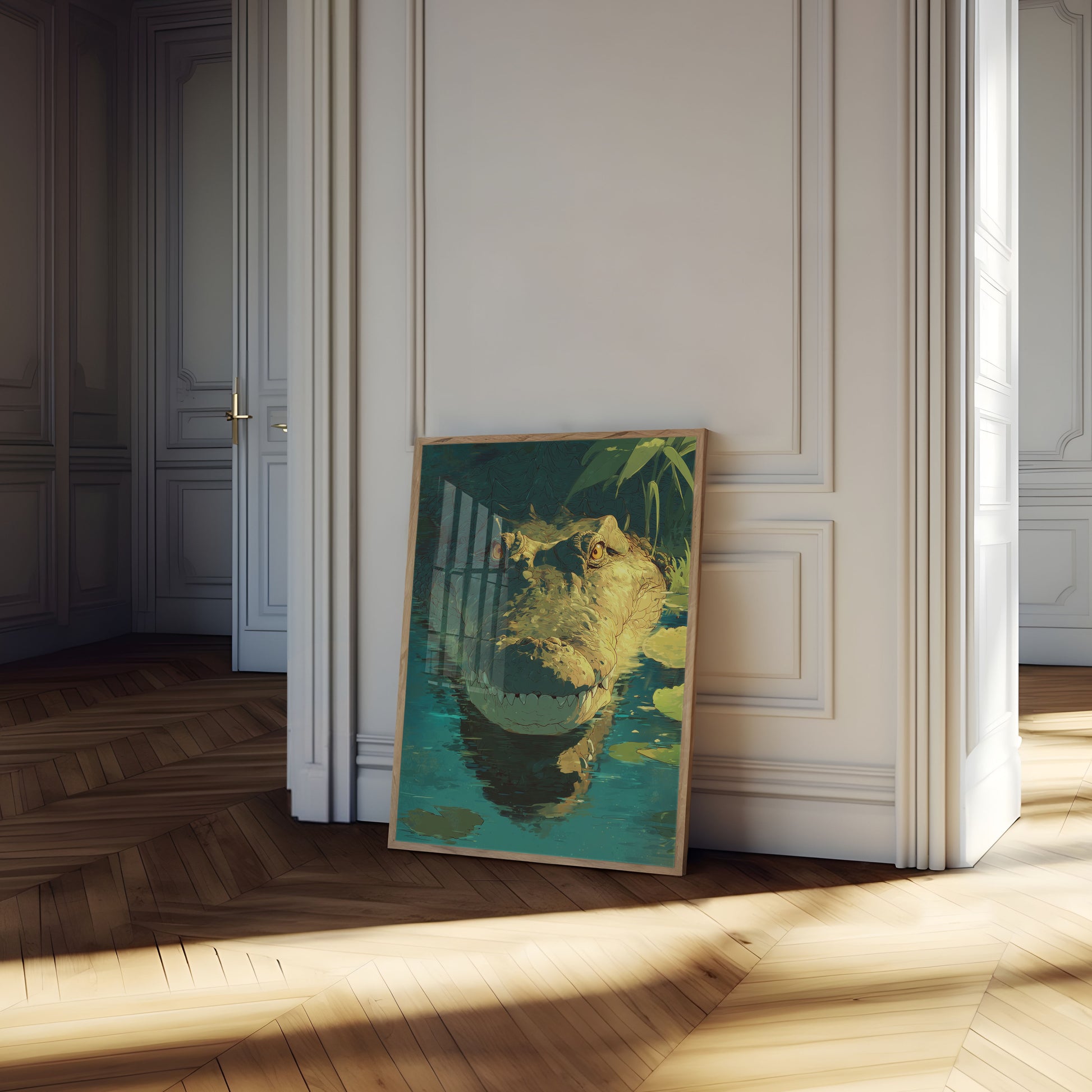 Sumérgete en el fascinante mundo de este impresionante retrato de cocodrilo, donde penetrantes ojos dorados se funden con una forma reptiliana texturizada y bañada por el sol. La obra captura la fuerza bruta y la belleza ancestral de este depredador prehistórico, suspendido en un tranquilo paisaje acuático verde azulado salpicado de delicados nenúfares. Cada escama y contorno narra una historia de supervivencia, creando una narrativa visual sobrecogedora que te transporta a las misteriosas profundidades.