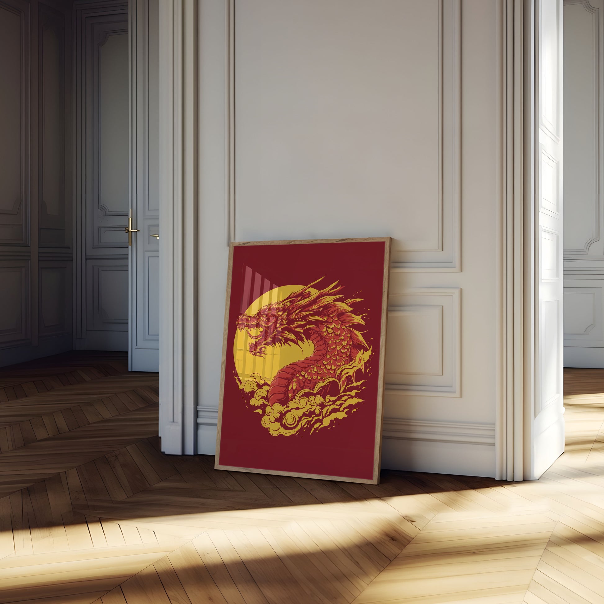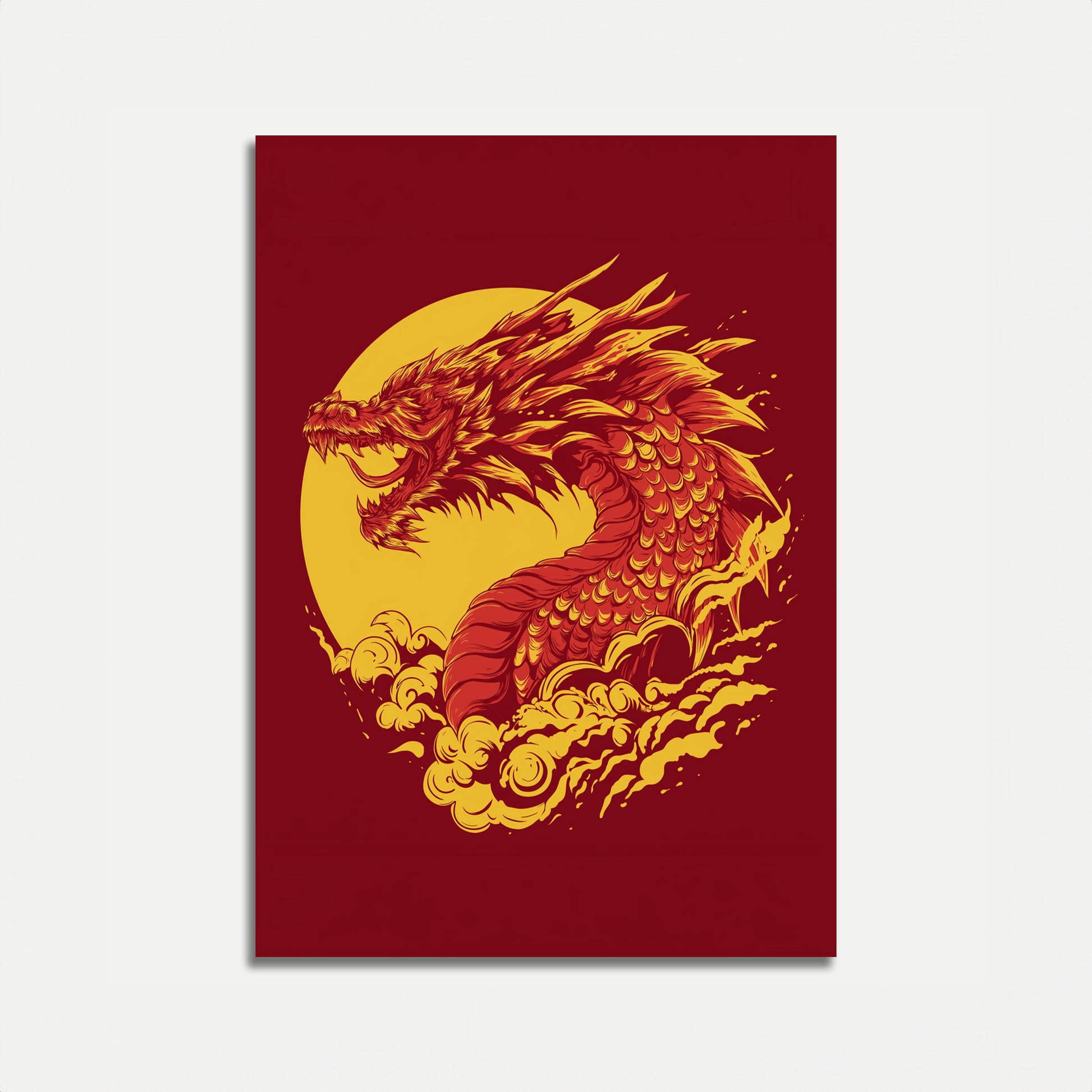 Sumérgete en el poder puro de esta extraordinaria obra de arte de dragón, que brilla con intensos tonos rojos y dorados sobre un dramático fondo circular. La mítica criatura emerge de entre las nubes, con su cuerpo escamoso y su expresión feroz capturando la esencia del poder elemental y la fuerza legendaria. Cada intrincado detalle de la forma del dragón irradia energía dinámica y pasión primigenia.