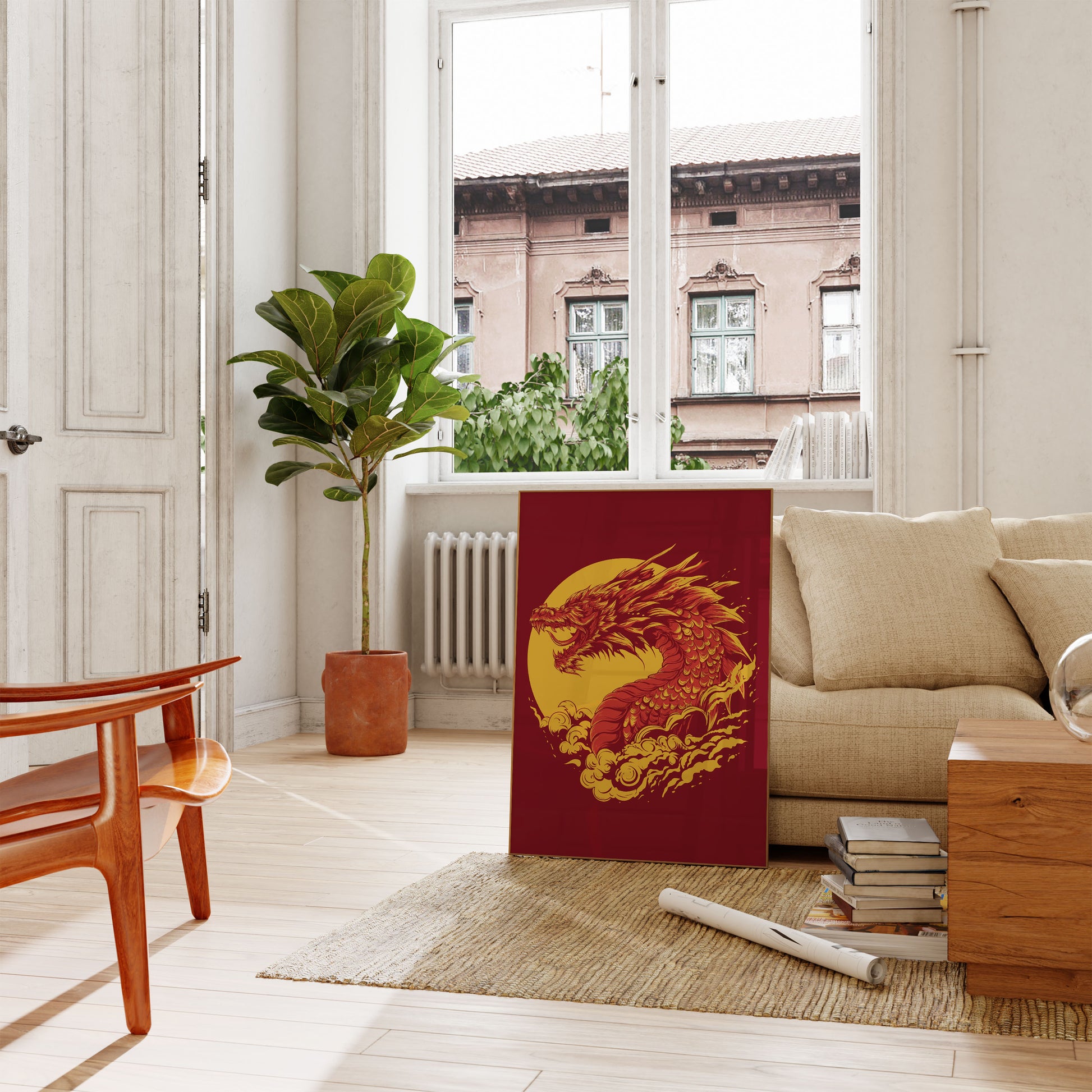 Póster del atardecer con fuego de dragón feroz