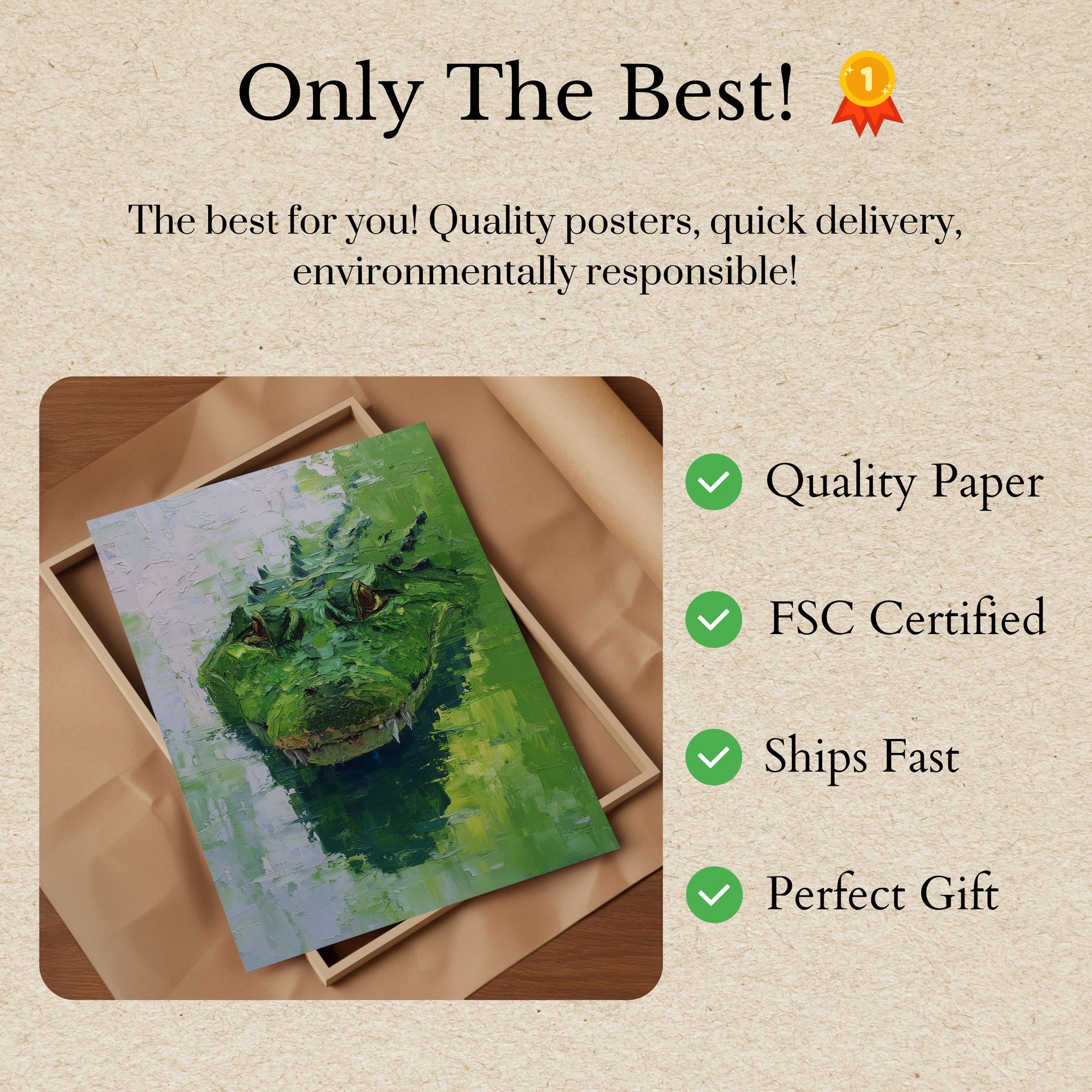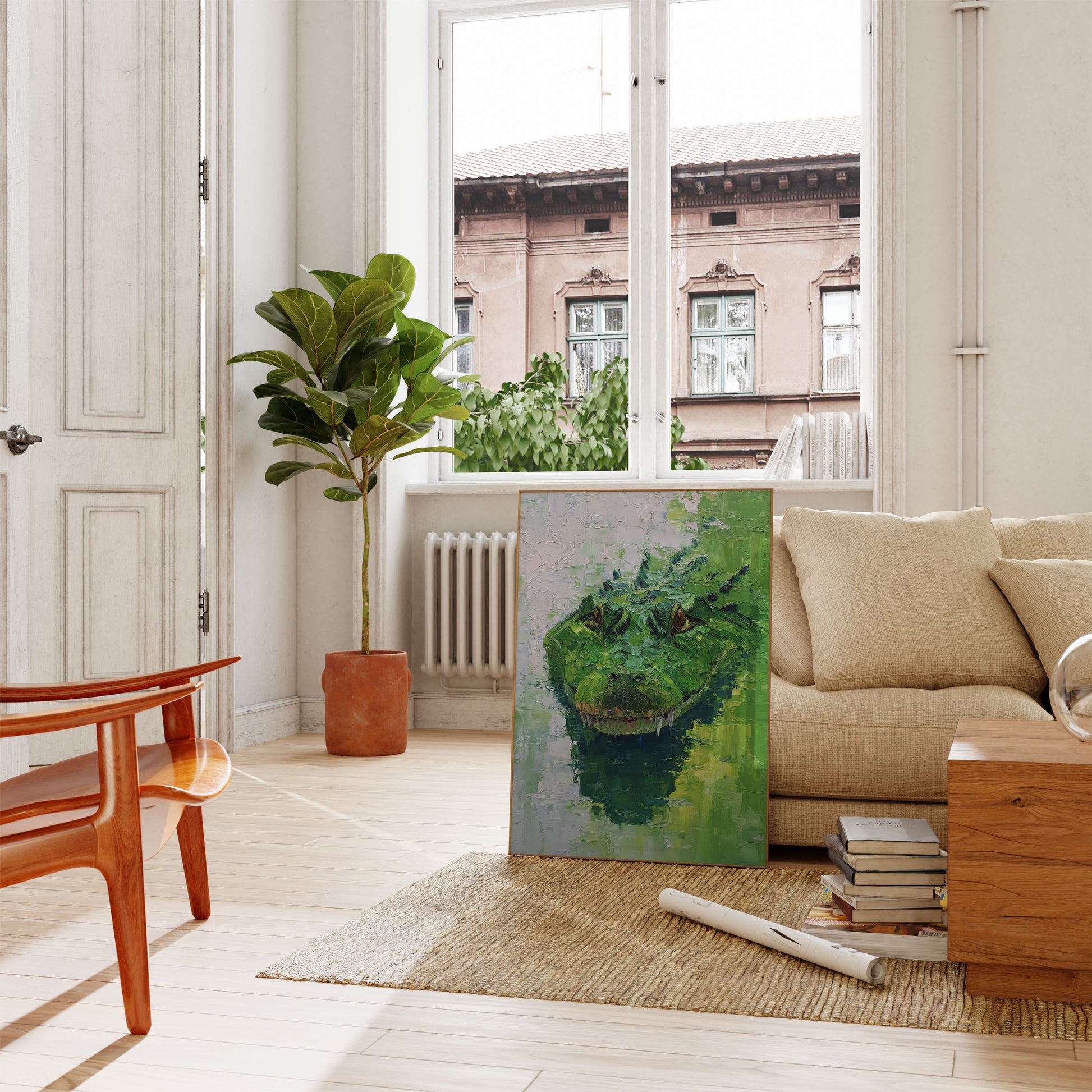 Sumérgete en el fascinante mundo de este vibrante retrato de cocodrilo, donde las audaces pinceladas en tonos esmeralda y verde lima capturan la fuerza bruta y la esencia prehistórica de este increíble depredador. La pintura al óleo texturizada da vida a la mirada penetrante y la superficie escamosa del cocodrilo, creando una experiencia visual intensa e inmersiva que llama la atención en cualquier espacio. Cada pincelada de espátula revela detalles intrincados, transformando a este reptil en una impresionante obra de arte contemporáneo.