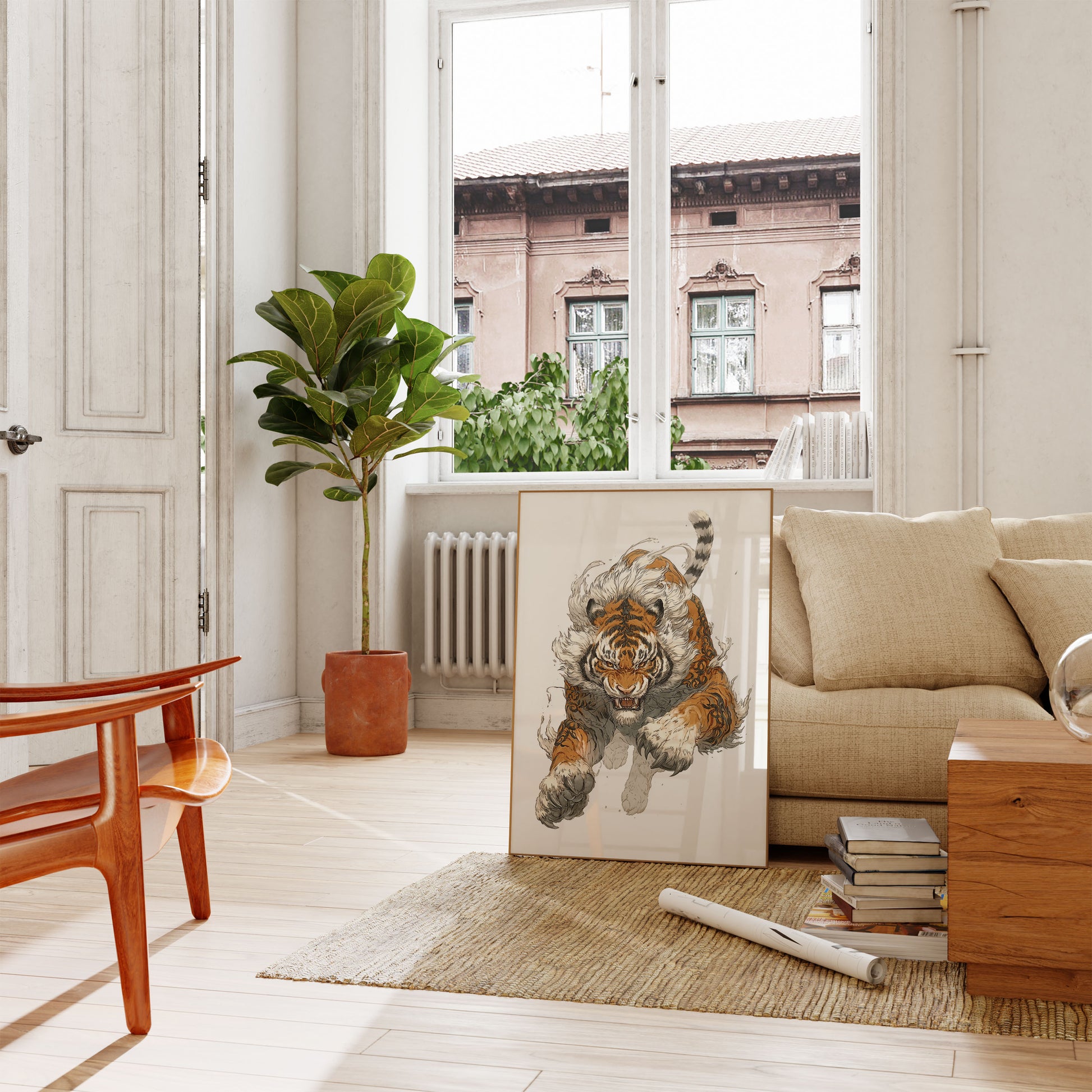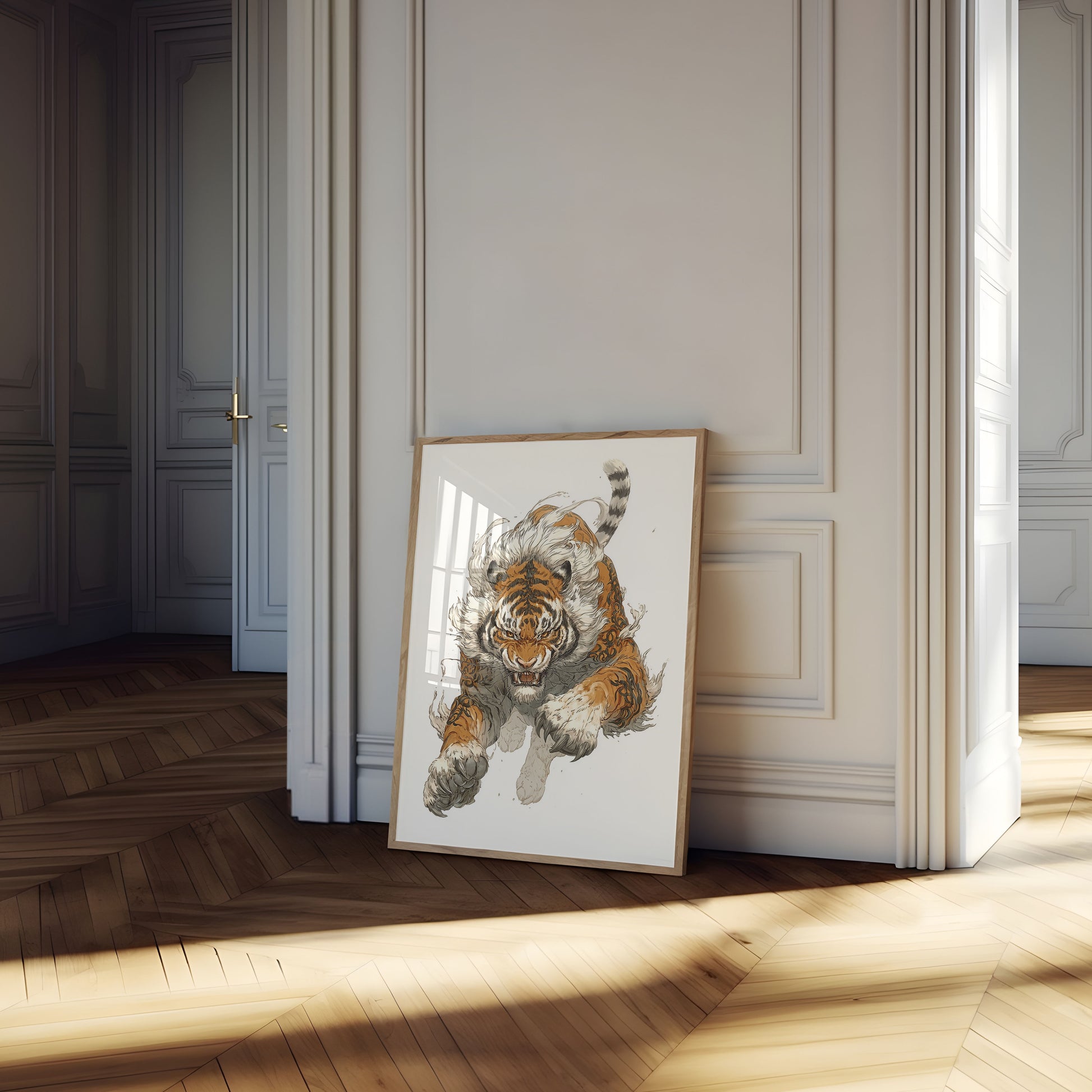 Libera la fuerza y la intensidad de esta impresionante obra de arte de tigre, que captura a un magnífico depredador en pleno movimiento, con ojos brillantes y un pelaje dinámico. La intrincada ilustración combina detalles realistas con un estilo casi etéreo y enérgico, mostrando la forma musculosa del tigre y su expresión feroz en impresionantes tonos naranja, blanco y gris. Este impactante póster lleva el espíritu salvaje e indomable directamente a tu hogar.