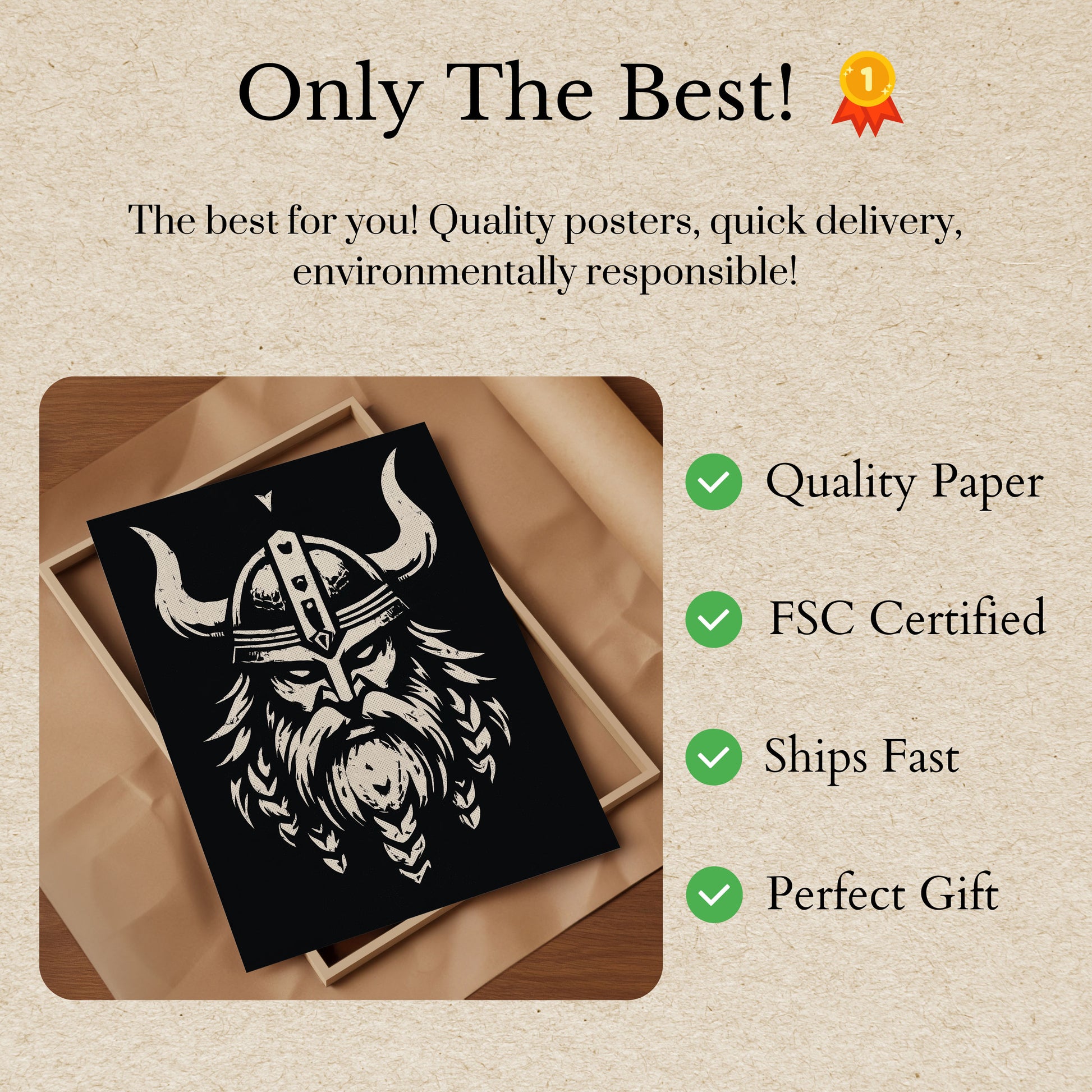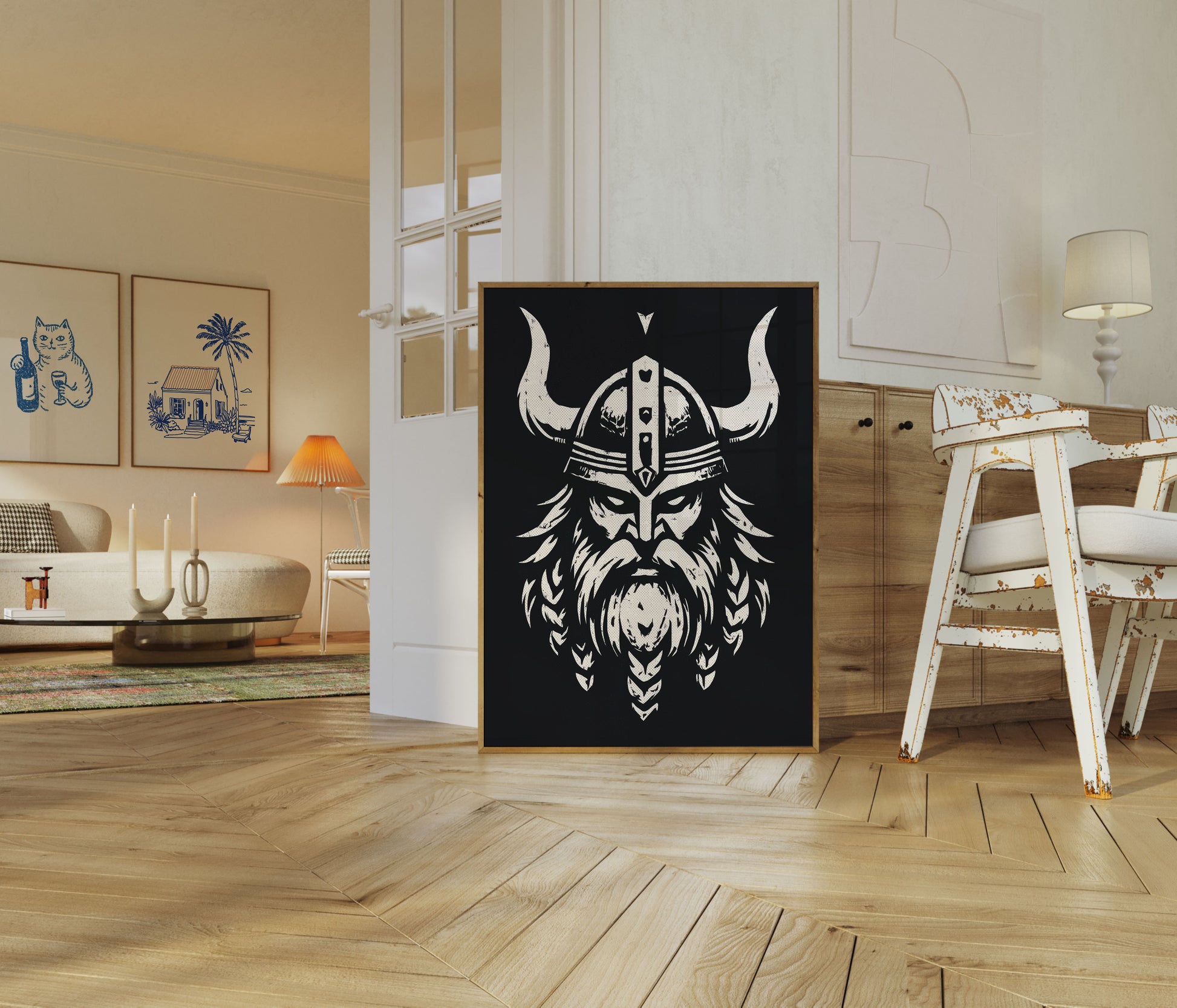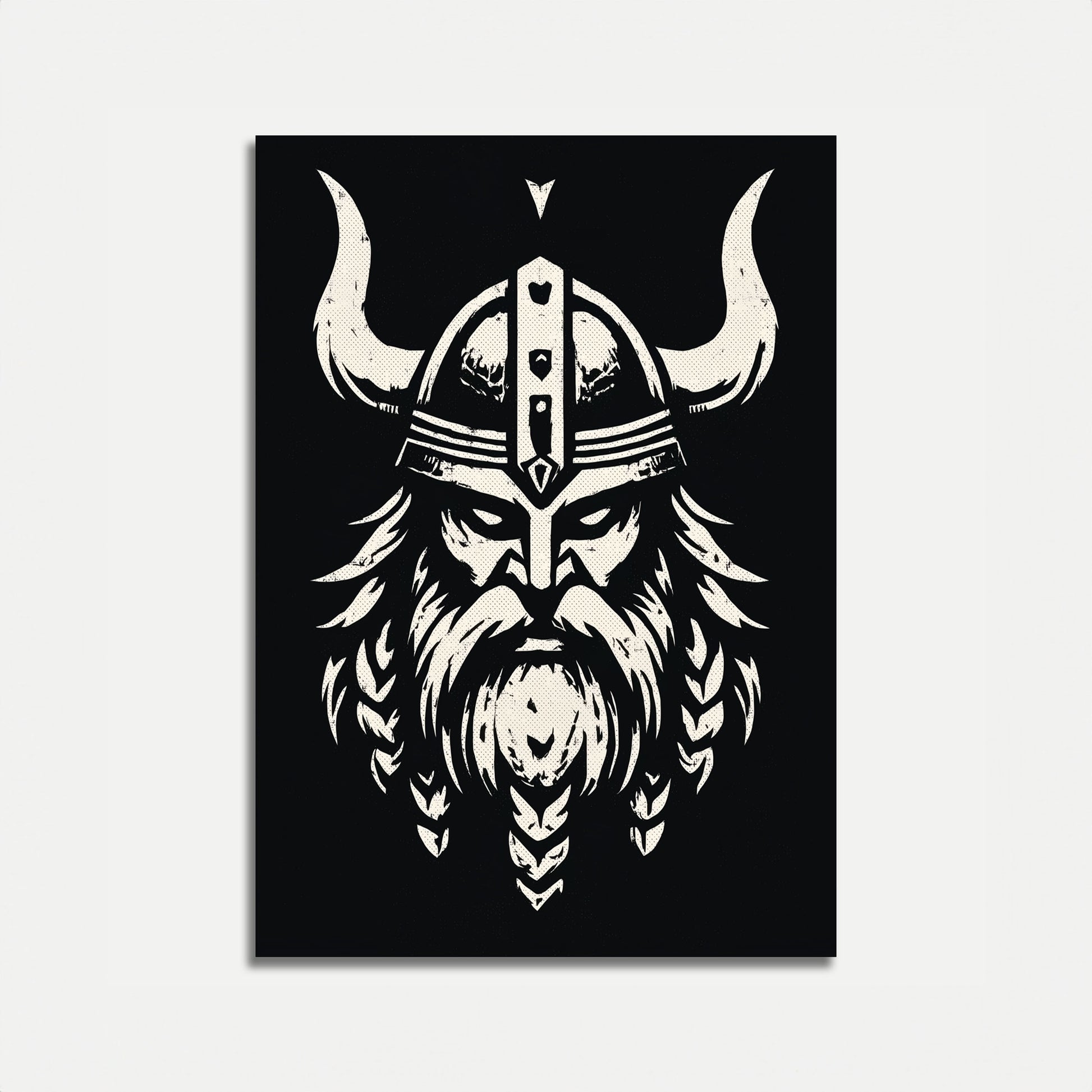 Sumérgete en el poder puro de esta impactante ilustración vikinga, con un diseño gráfico y audaz que captura el espíritu de la mitología nórdica. La obra monocromática representa a un guerrero feroz de mirada intensa, adornado con un casco con cuernos y una intrincada barba trenzada, con un estilo impactante y de alto contraste que llama la atención. Este póster encarna la fuerza, la herencia y la esencia indómita de la cultura vikinga.