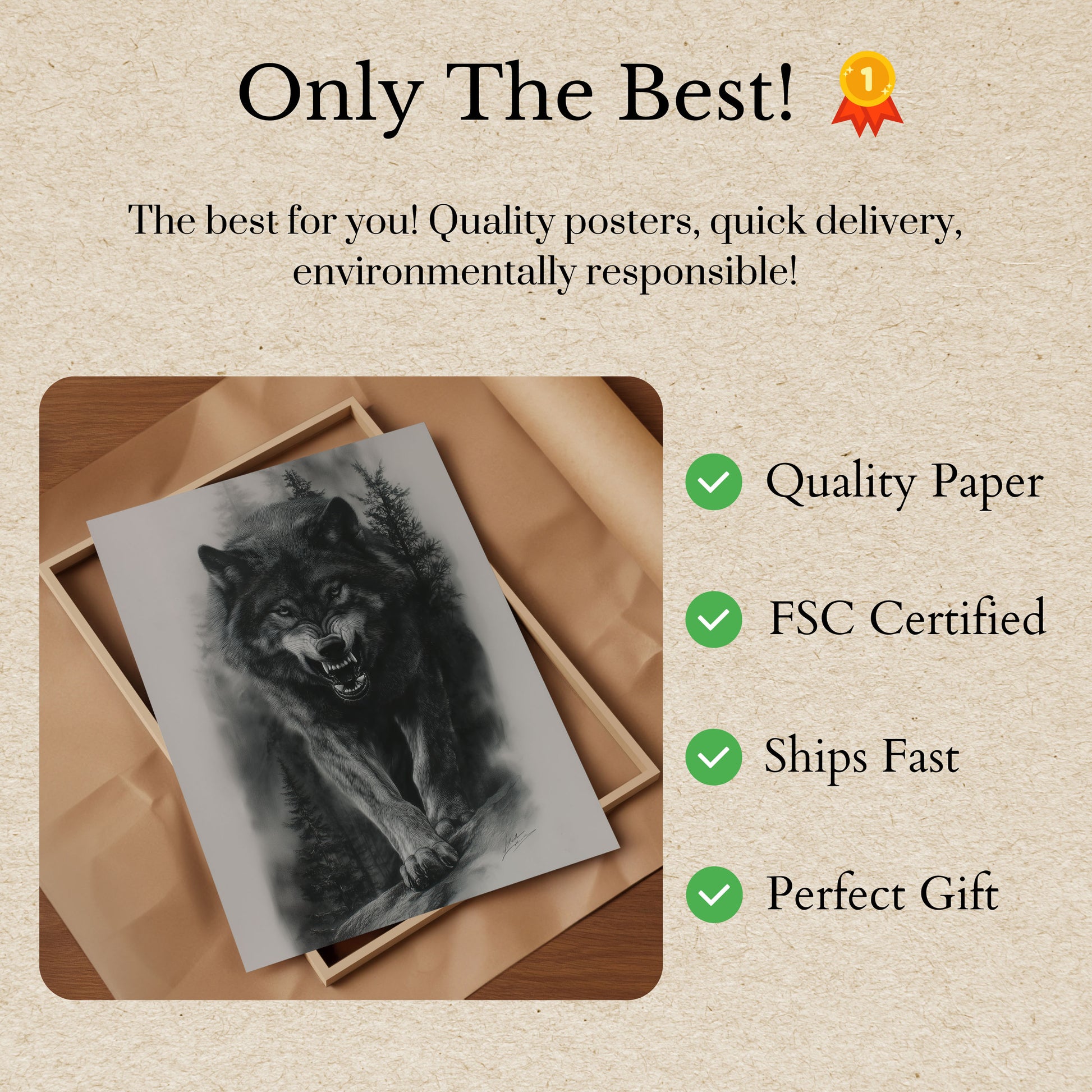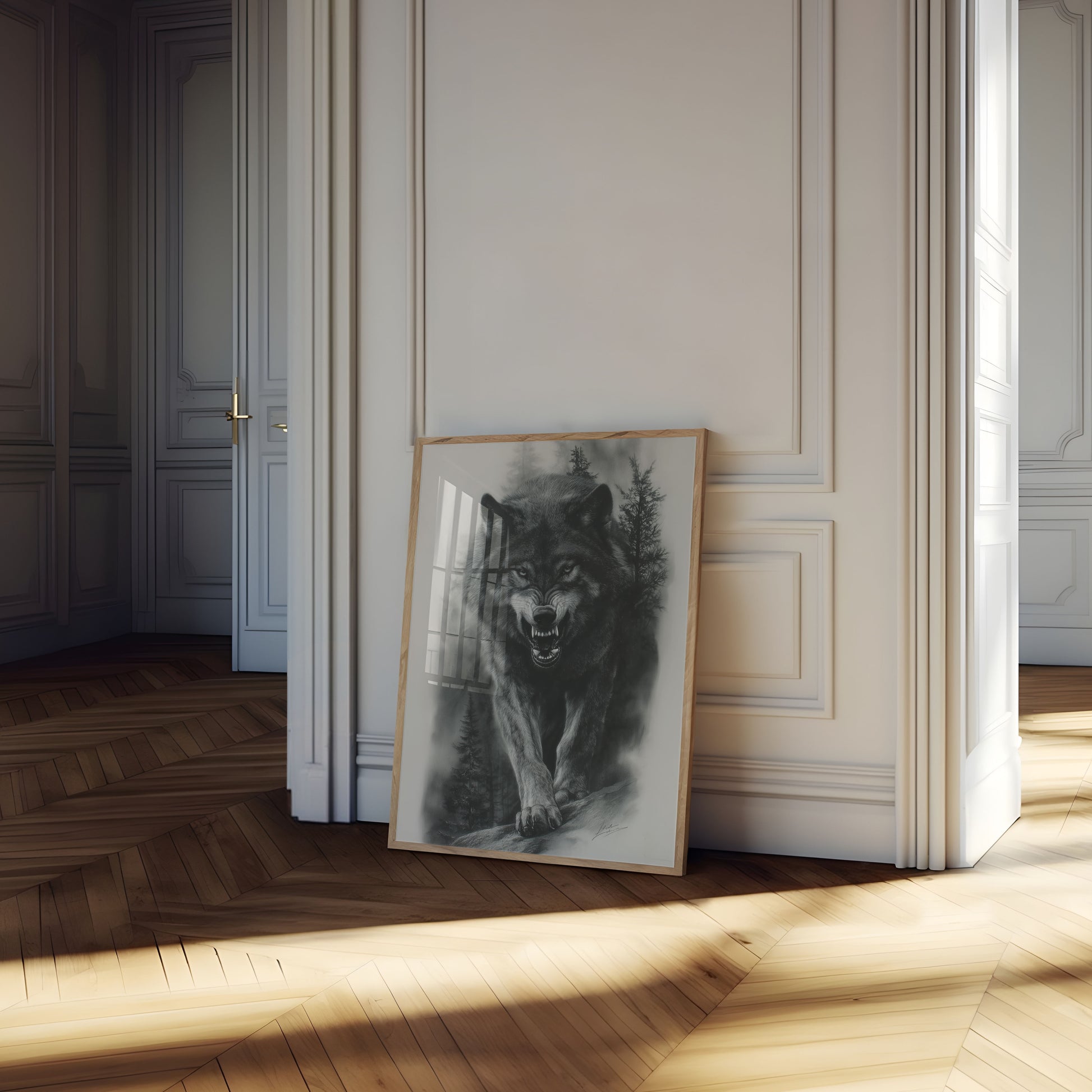 Captura la intensidad pura de la naturaleza salvaje con este impresionante retrato de lobo en blanco y negro. La imagen muestra a un poderoso lobo gruñendo entre pinos neblinosos, irradiando energía primigenia y espíritu indomable. Cada detalle intrincado del pelaje y la expresión feroz del lobo están meticulosamente reproducidos, creando una pieza impresionante que lleva la esencia salvaje de la naturaleza directamente a tu espacio vital.