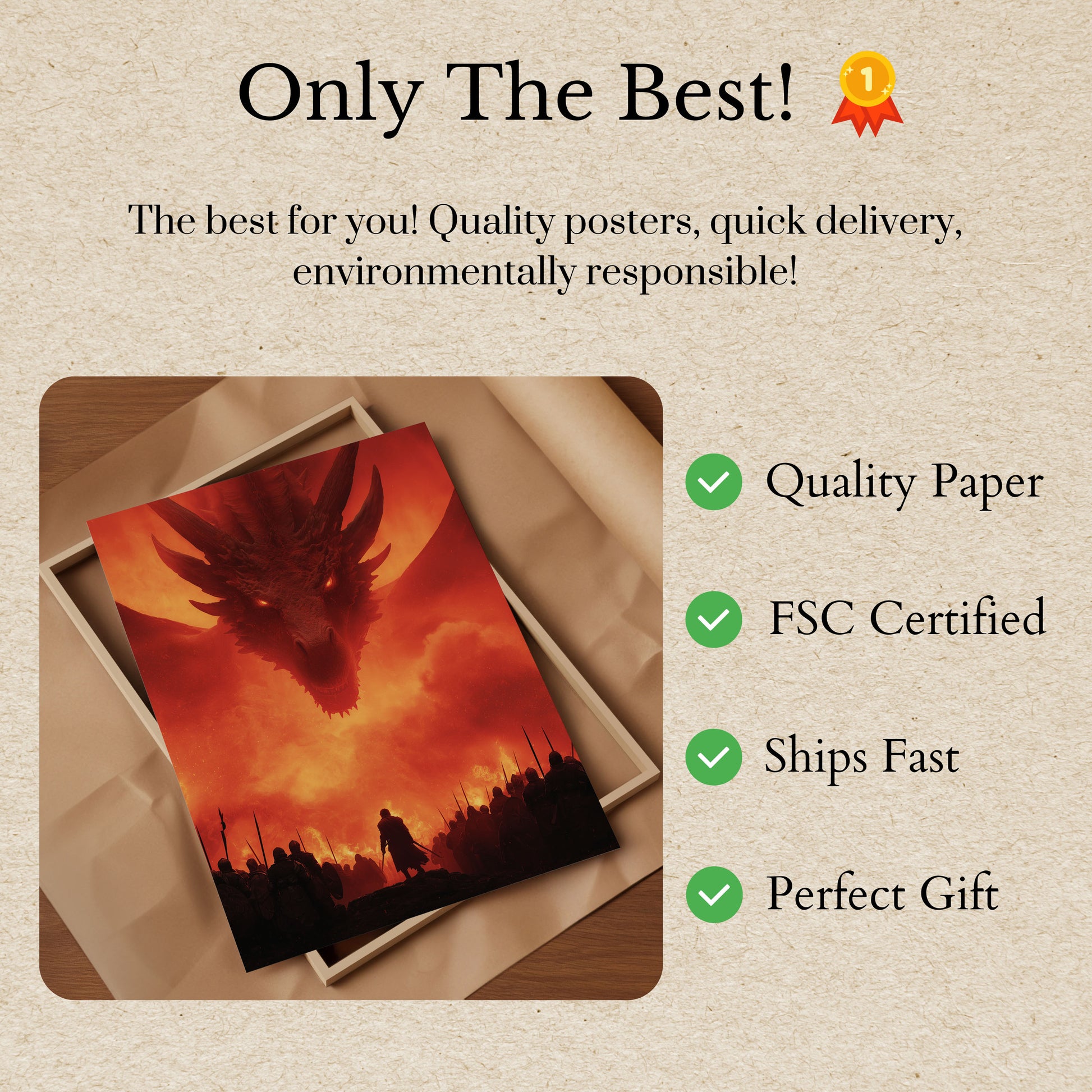 Una impresionante obra de arte de fantasía que captura el momento épico de un enorme y amenazante dragón que se cierne sobre el campo de batalla. Bañados en intensos tonos rojos y naranjas, los feroces ojos brillantes y las escamas afiladas del dragón dominan la escena, mientras que las siluetas de guerreros se alzan debajo, preparándose para una confrontación apocalíptica. La imagen vibra con una fuerza bruta, dramatismo y una sensación de destrucción inminente que cautivará a los amantes del arte fantástico y mitológico.