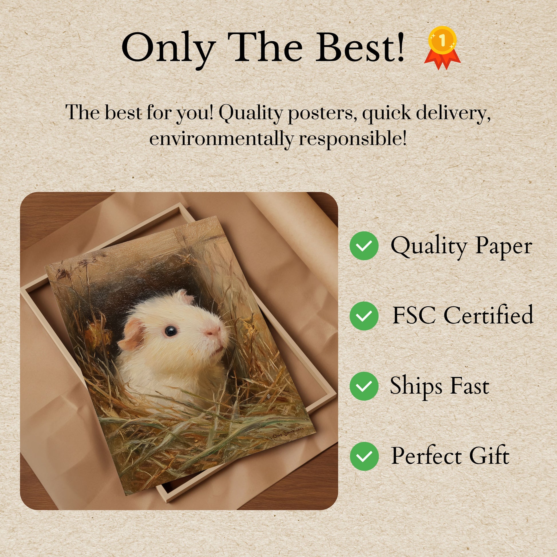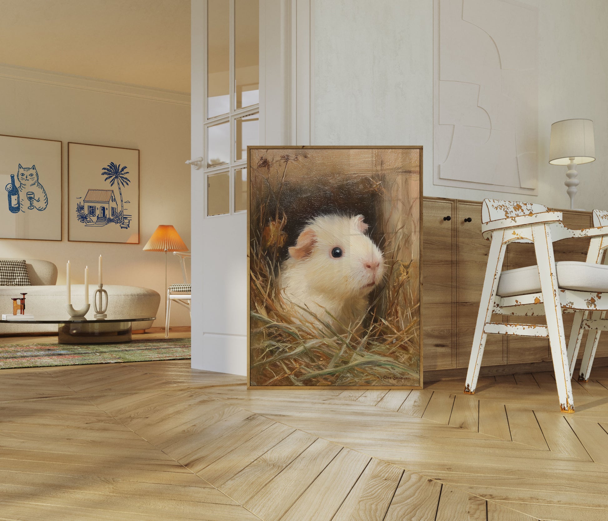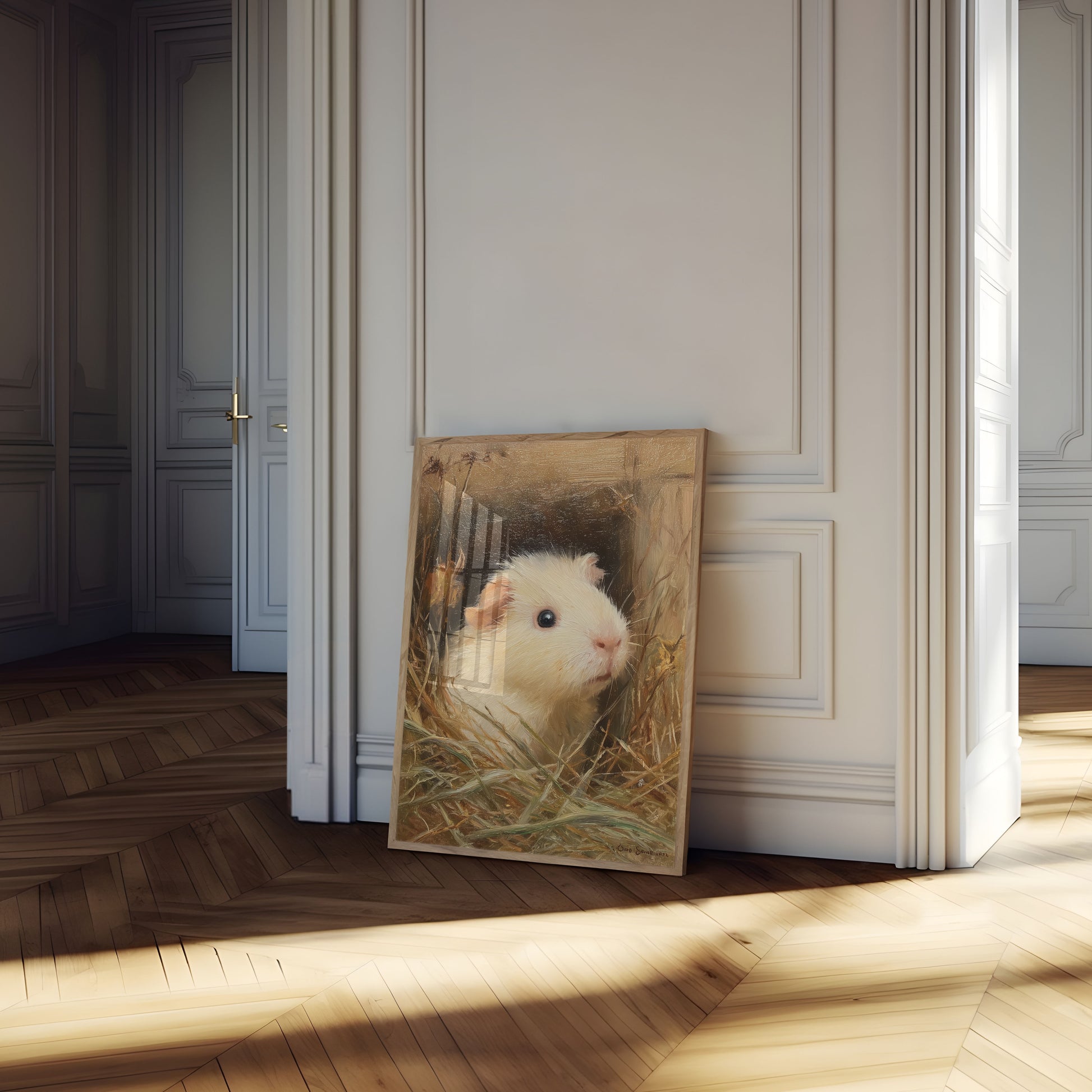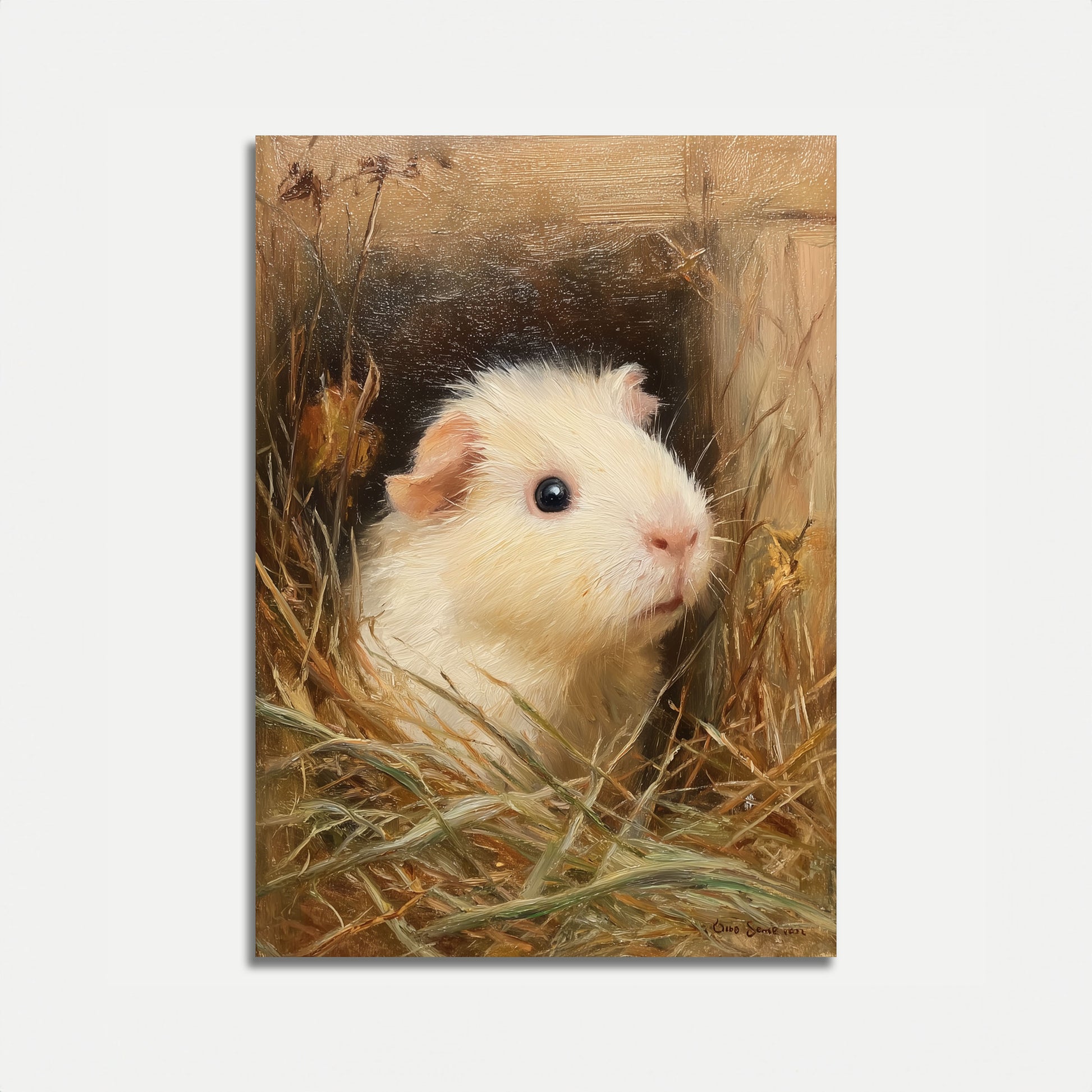 En una cálida paleta de tonos paja dorados y marrones suaves, este exquisito retrato de cobaya captura un momento de pura serenidad. El delicado pelaje blanco y el conmovedor ojo oscuro de la adorable cobaya crean una escena íntima, invitando al espectador a un mundo acogedor de encanto rústico y delicada belleza. Cada pincelada de esta impresionante obra de arte celebra la serena elegancia de esta querida mascota.