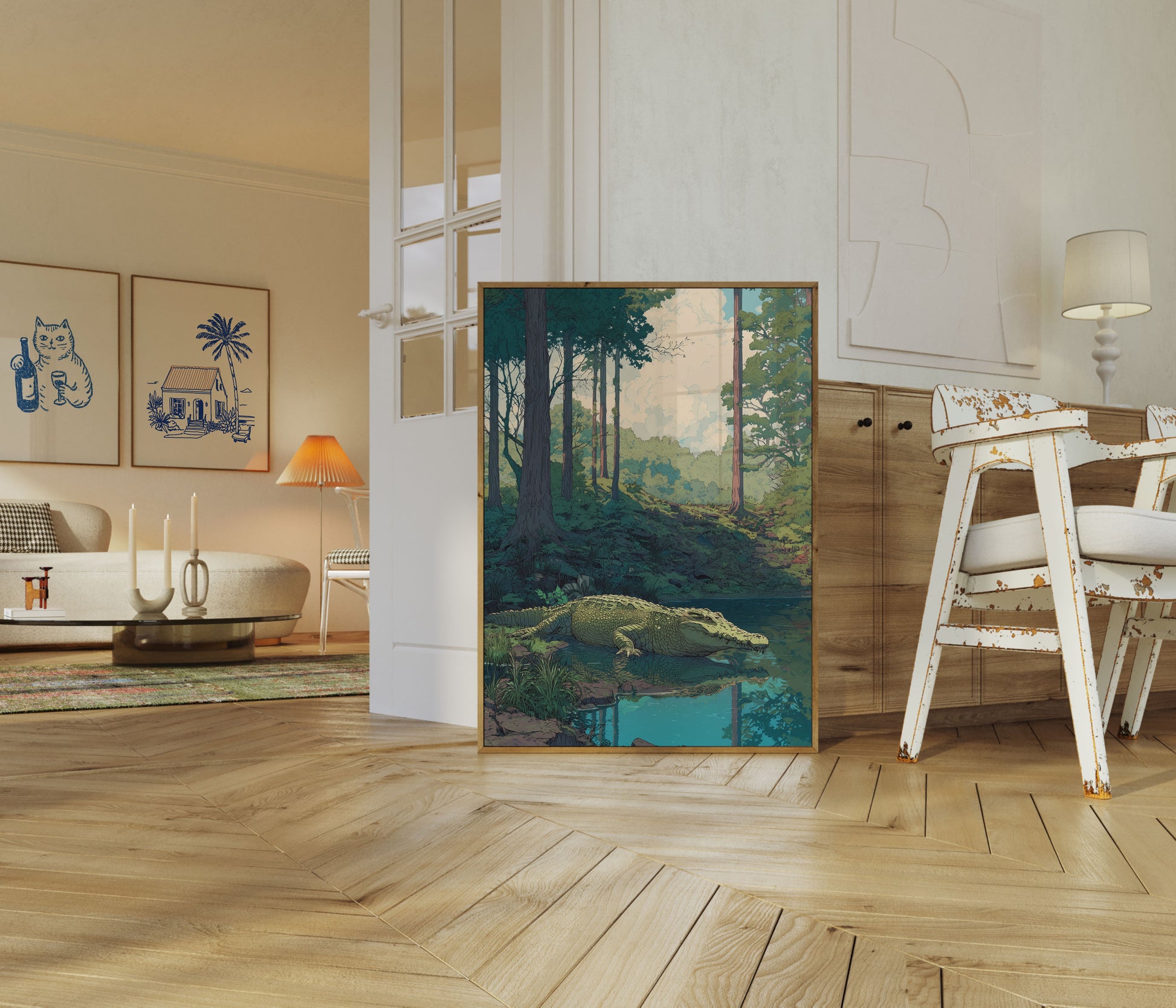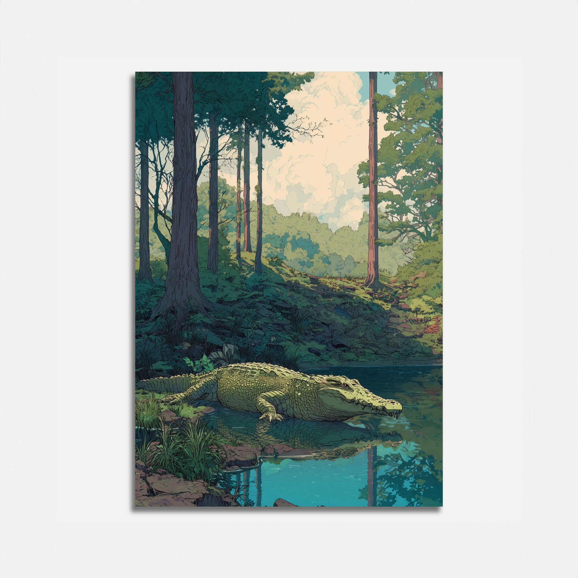 Una fascinante ilustración captura un enorme cocodrilo descansando en un tranquilo arroyo forestal, rodeado de imponentes árboles y suaves nubes ondulantes. La obra combina ricos tonos esmeralda y verde bosque profundo, creando una escena serena pero poderosa que sumerge al espectador en un exuberante y misterioso ecosistema forestal. Cada escala detallada y tronco texturizado dan vida a este extraordinario centinela reptil en una armonía visual impresionante.