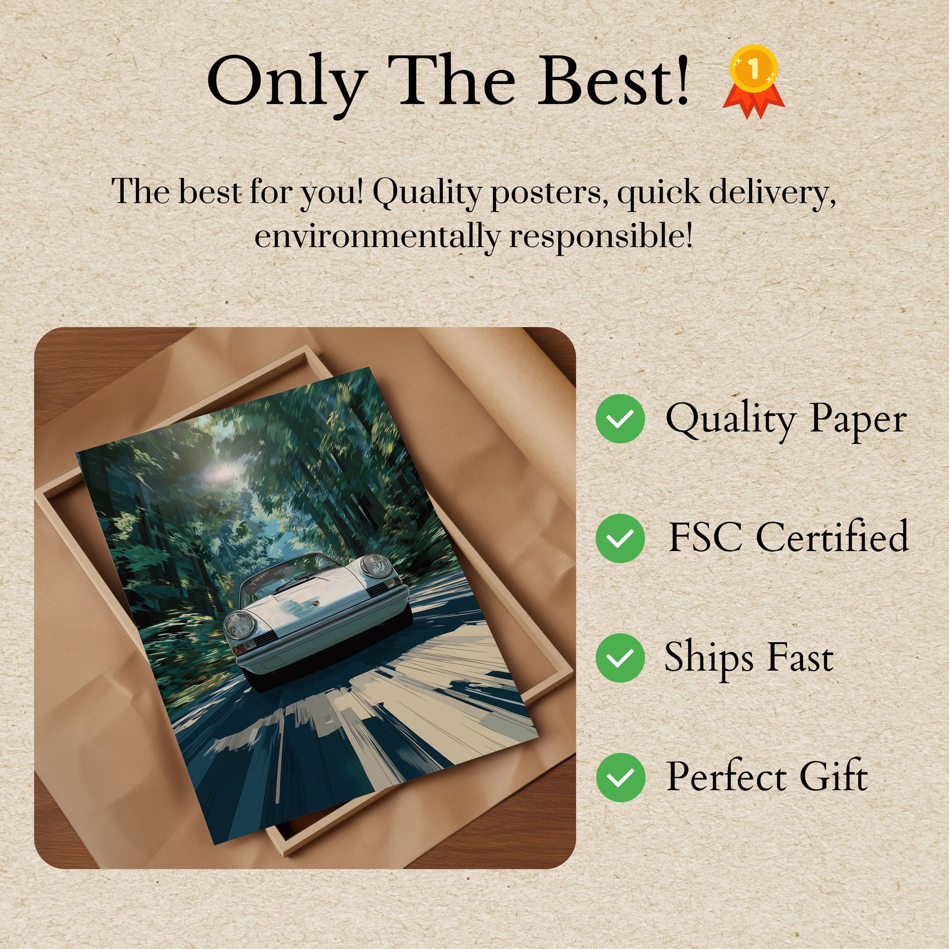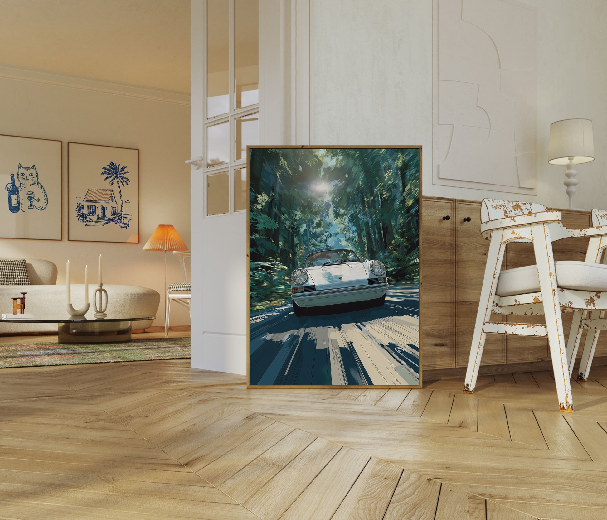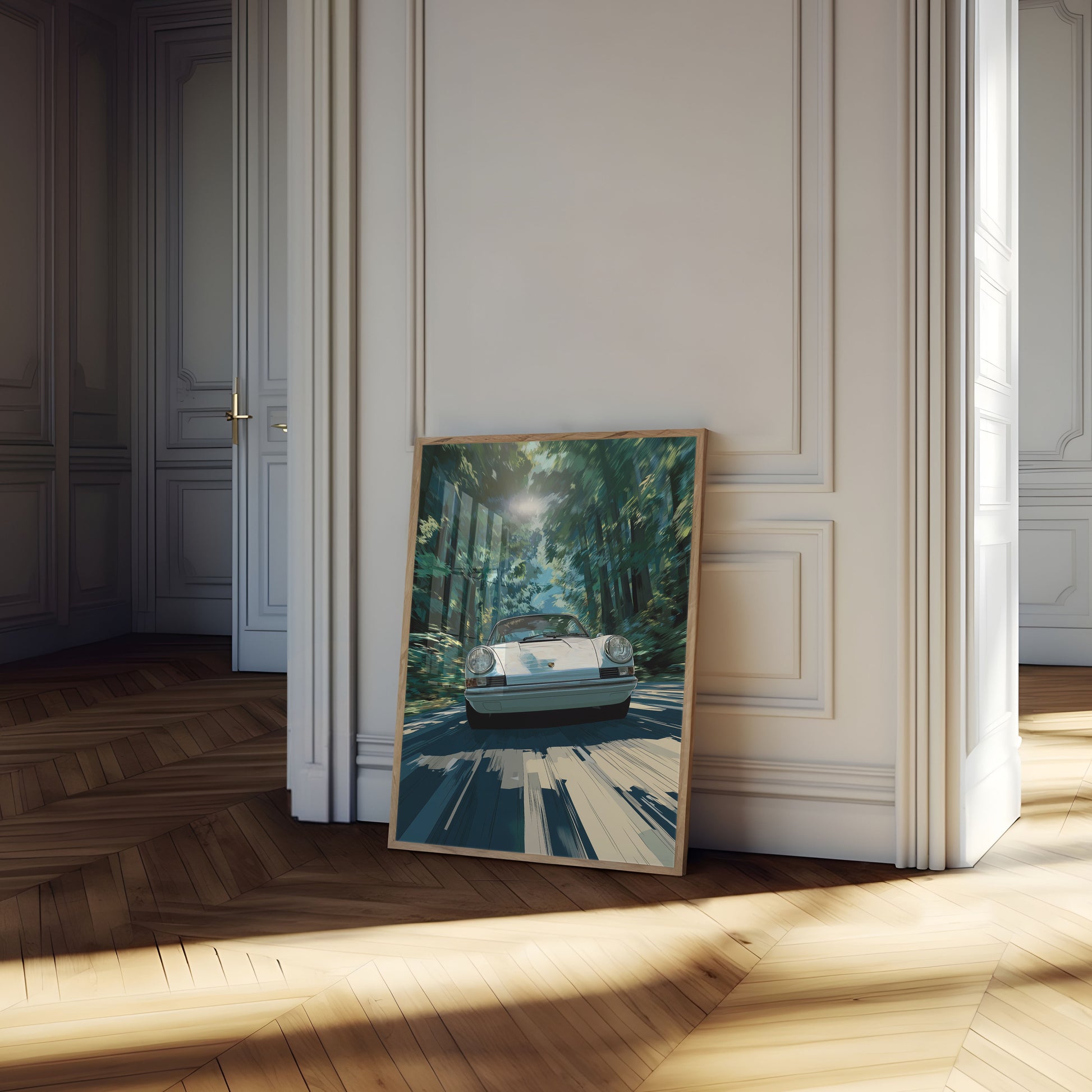 Sumérgete en el fascinante mundo del arte automovilístico vintage con esta impresionante ilustración de Porsche. Con un exuberante bosque esmeralda como telón de fondo, un Porsche blanco clásico irrumpe bajo la luz del sol, creando una sensación de movimiento dinámico y elegancia atemporal. La obra captura la energía pura del icónico deportivo, fusionando la belleza natural con la precisión mecánica en una impresionante sinfonía visual.