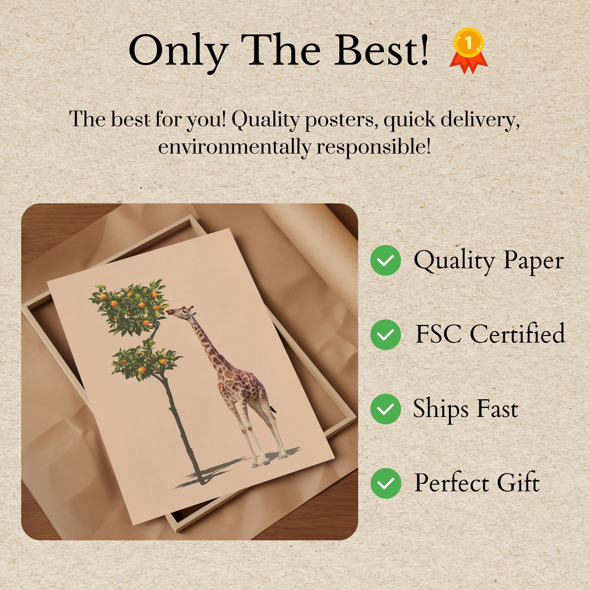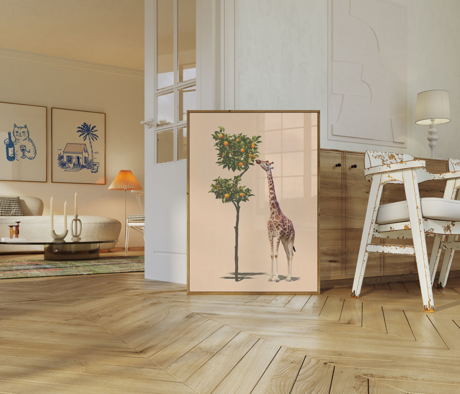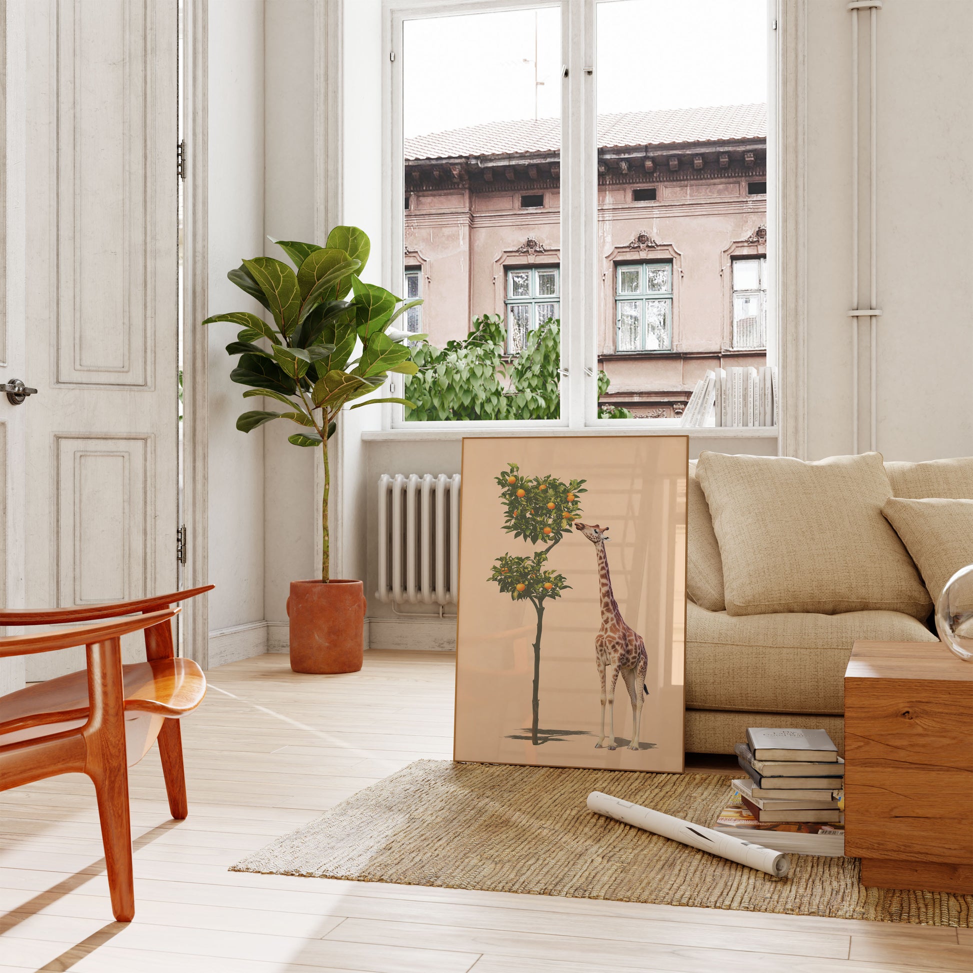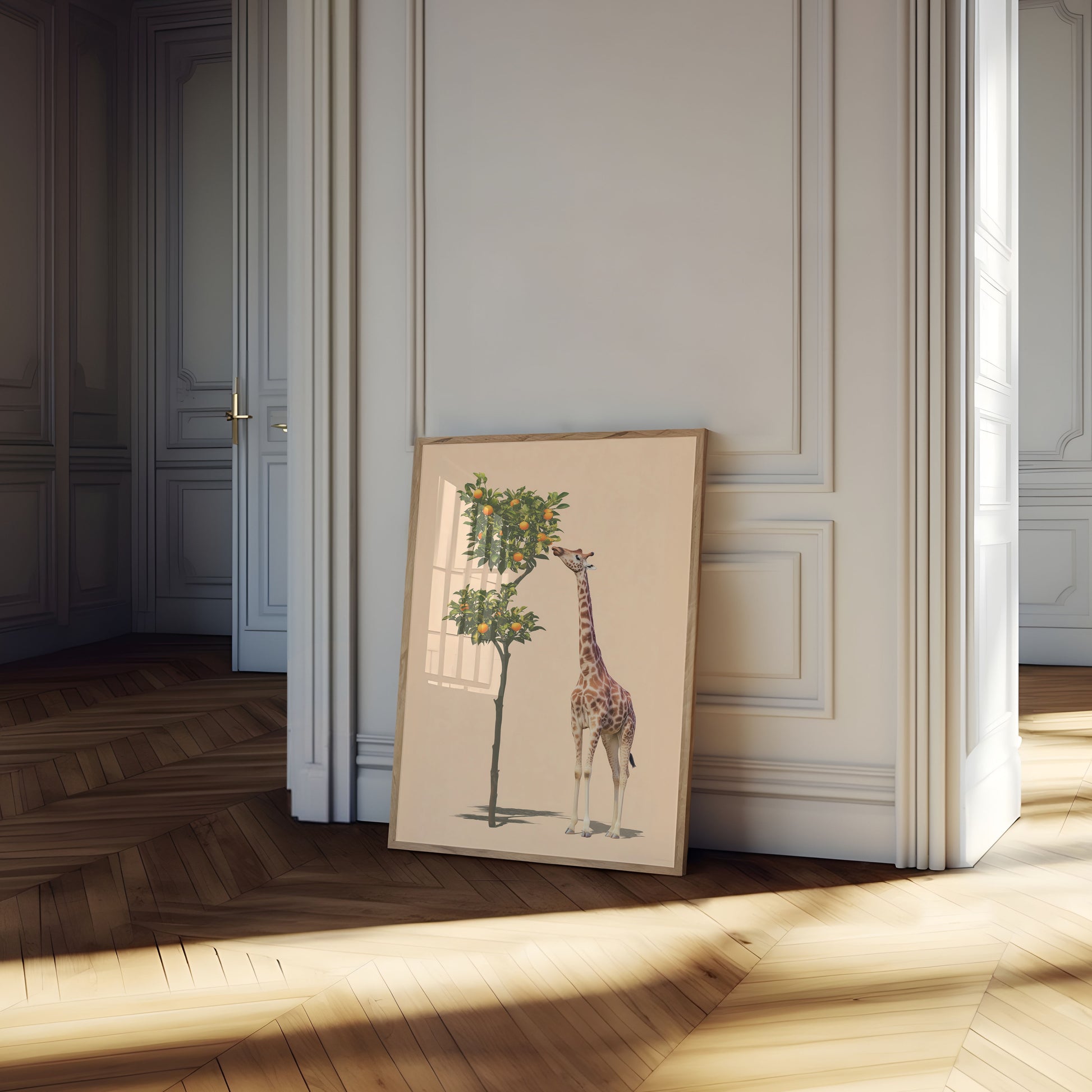 Una escena surrealista y lúdica captura a una alta jirafa estirando su largo cuello para mordisquear naranjas maduras de un árbol estilizado. El cálido fondo color melocotón crea una atmósfera de ensueño que combina la maravilla natural con la imaginación artística. Cada detalle invita al espectador a maravillarse con la inesperada conexión entre la elegante jirafa y el abundante árbol frutal.