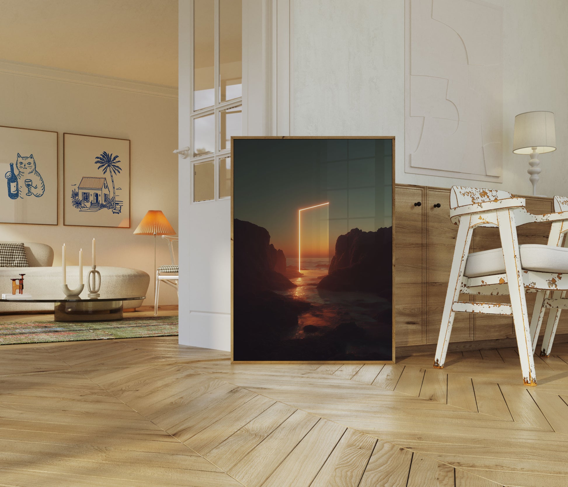Atraviesa un portal luminoso de luz y descubre un escape costero impresionante. Esta obra de arte impactante captura un marco rectangular luminiscente flotando entre acantilados rocosos dramáticos al atardecer, creando una escena surrealista y cautivadora. Los tonos cálidos dorados y naranjas se mezclan sin problemas con el cielo azul verdoso frío, mientras que la puerta delineada en neón atrae tu mirada hacia el océano sereno más allá, evocando una sensación de asombro, transición y posibilidad infinita.