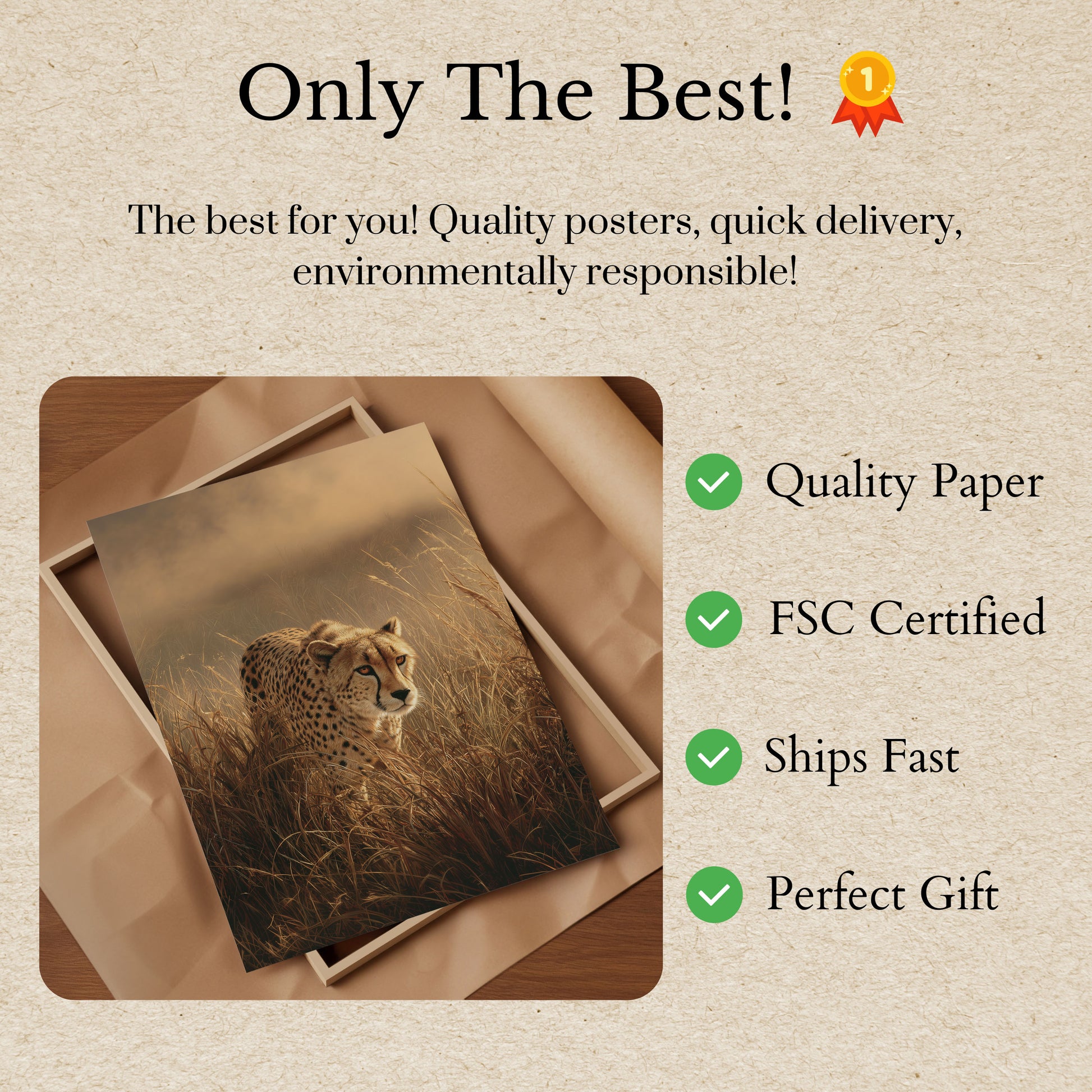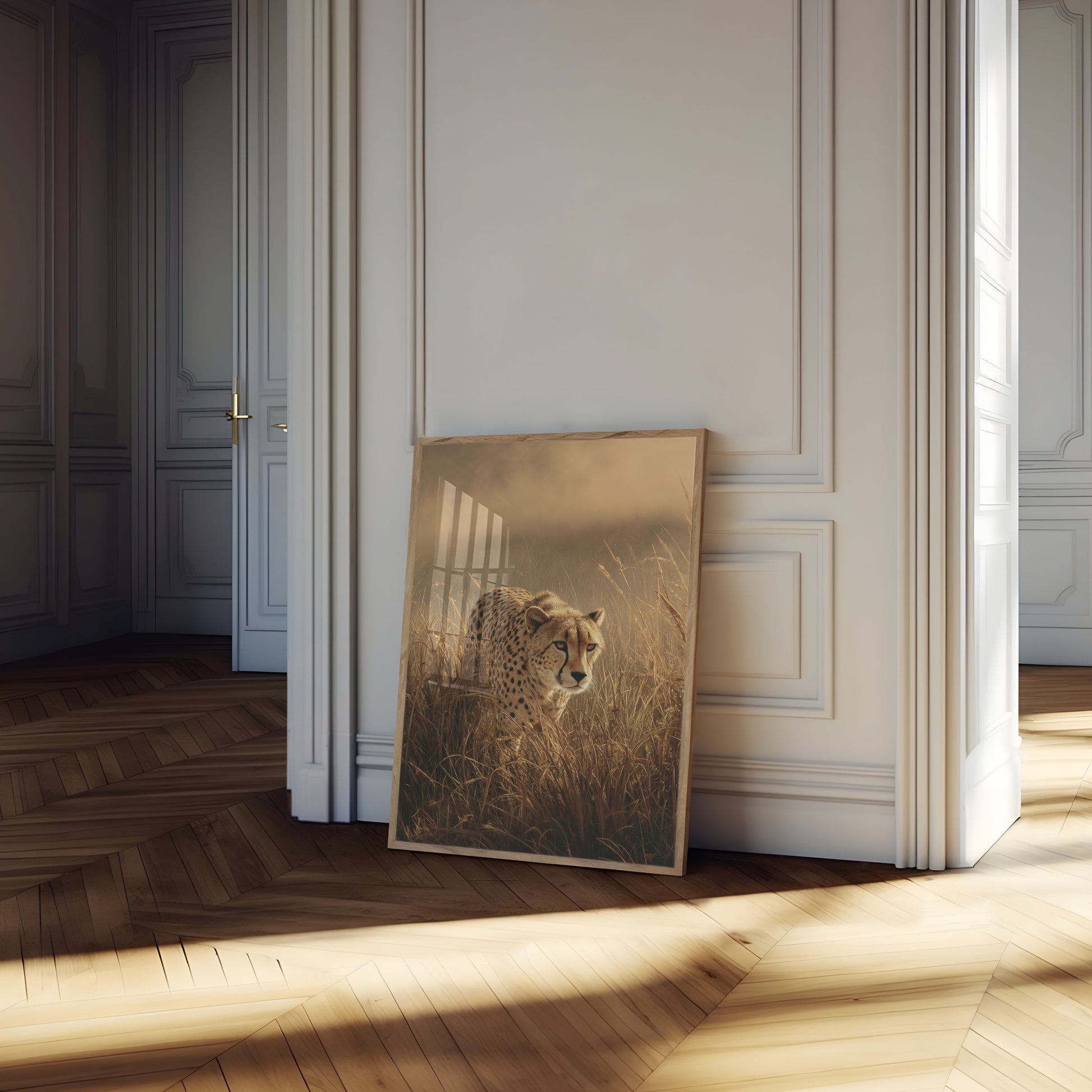 Sumérgete en la impresionante belleza de un guepardo enclavado en praderas doradas y brumosas. Esta impresionante obra de arte captura al majestuoso depredador en un momento de serena lucidez, con una suave luz ámbar y delicadas briznas de hierba que crean una atmósfera etérea. La mirada penetrante del guepardo y su pelaje moteado se integran a la perfección con el cálido y brumoso paisaje, evocando la esencia pura de la sabana africana.