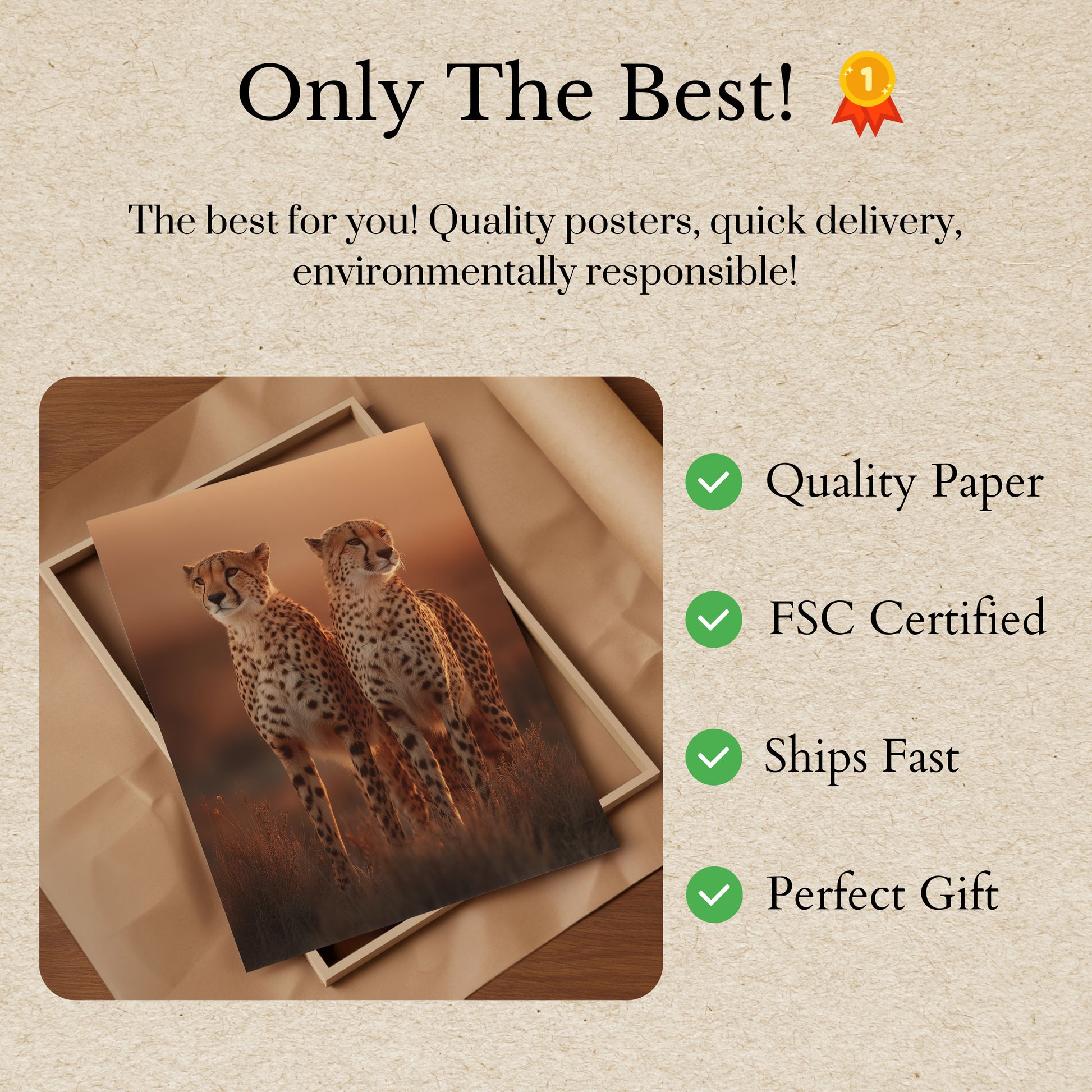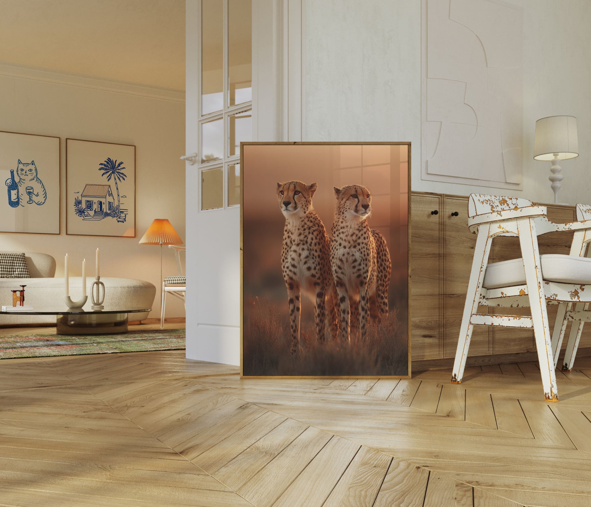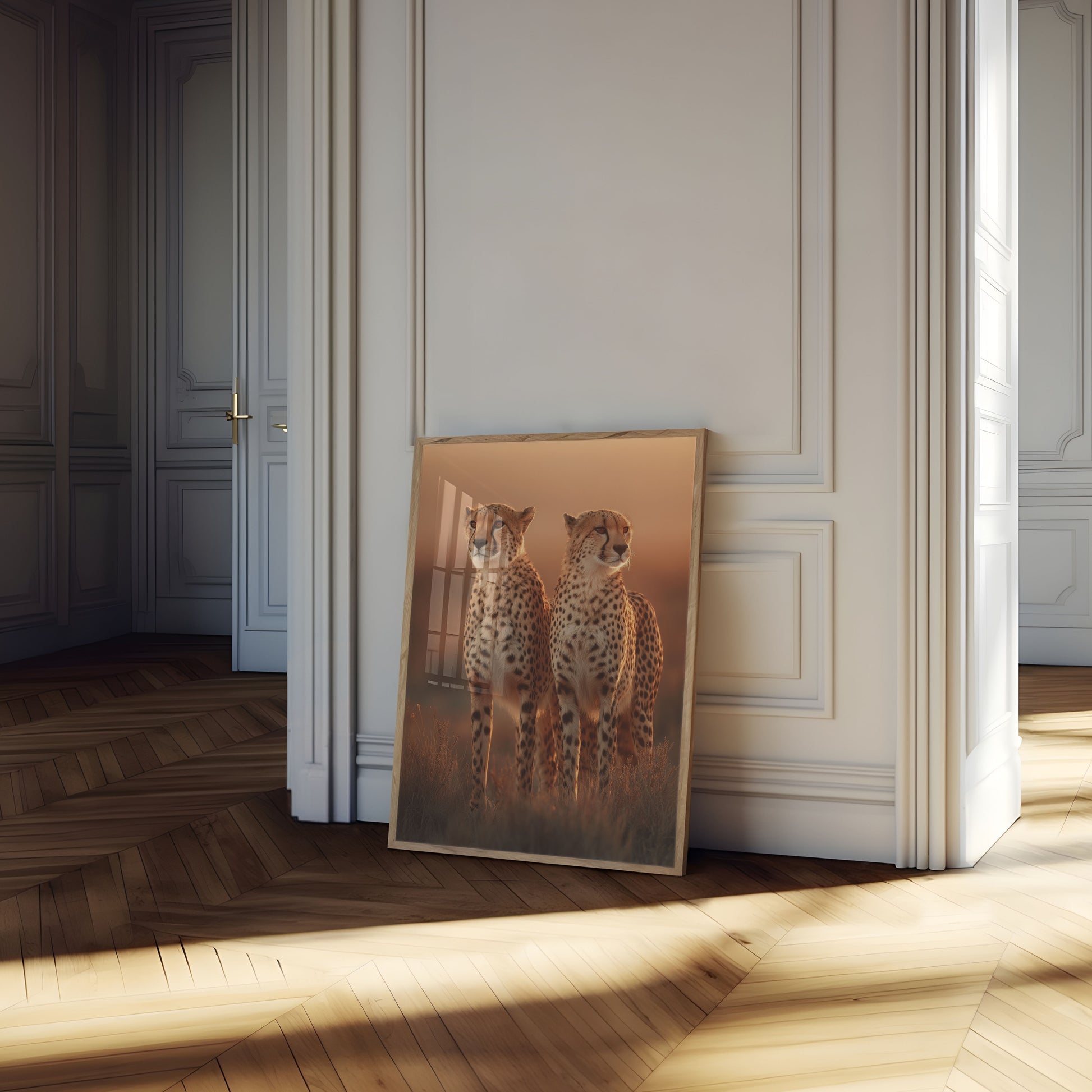 Dos majestuosos guepardos se yerguen uno junto al otro, bañados por la cálida y etérea luz del atardecer. Sus pelajes moteados brillan como cobre bruñido contra el fondo suave y difuminado de la pradera, creando un momento de serenidad y naturaleza salvaje capturado con asombroso detalle. La imagen irradia una sensación de poder sereno y armonía natural que transporta al espectador directamente a la sabana africana.