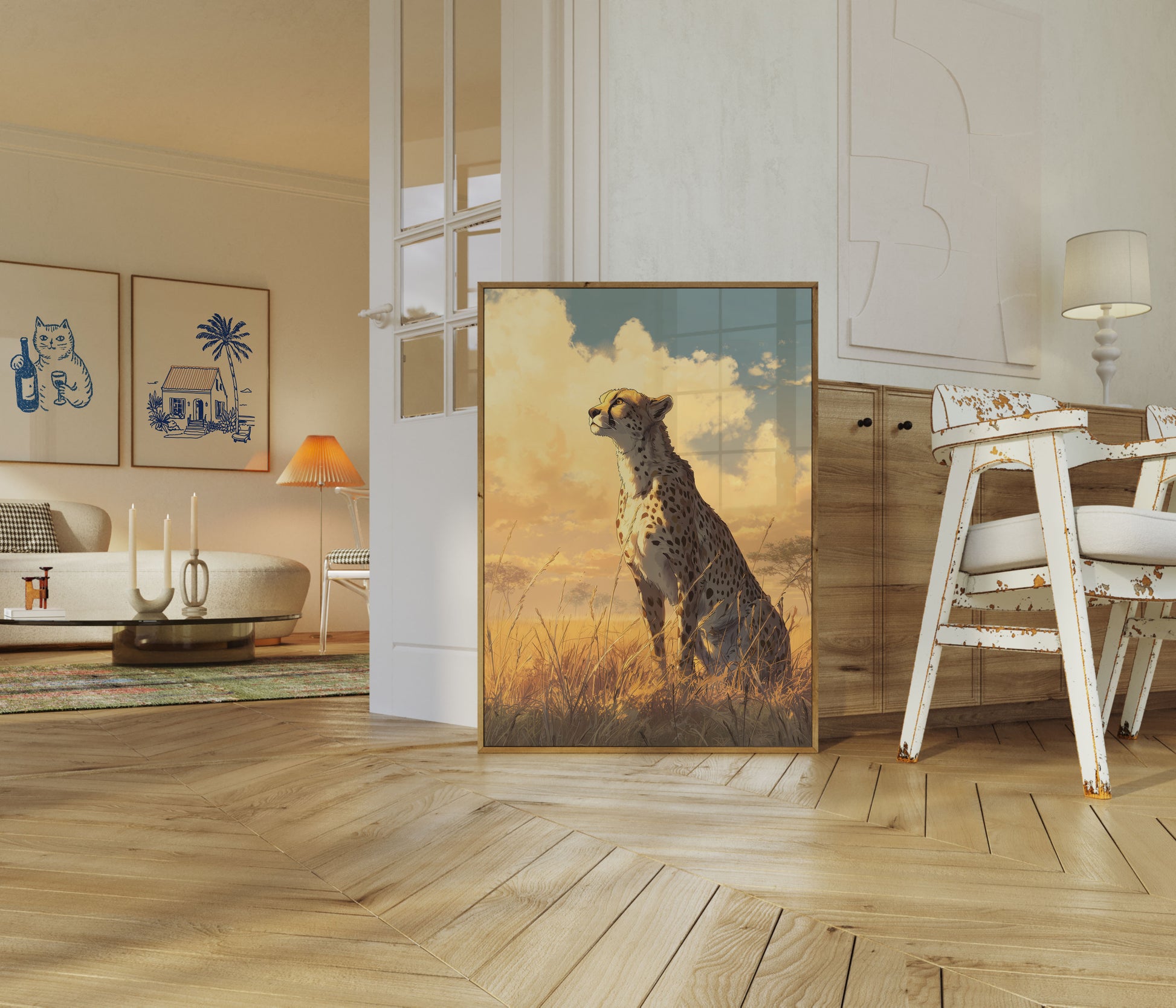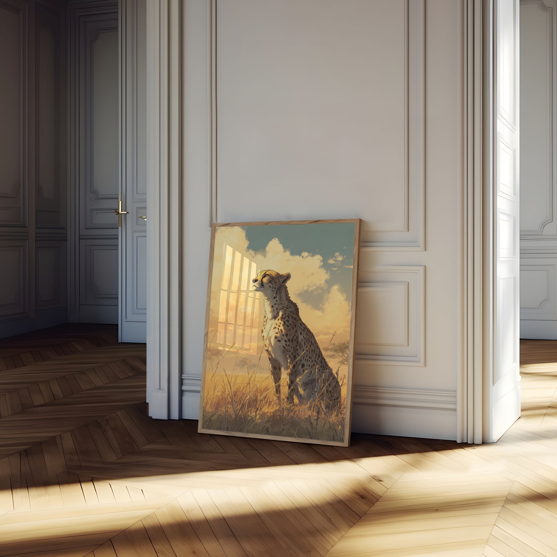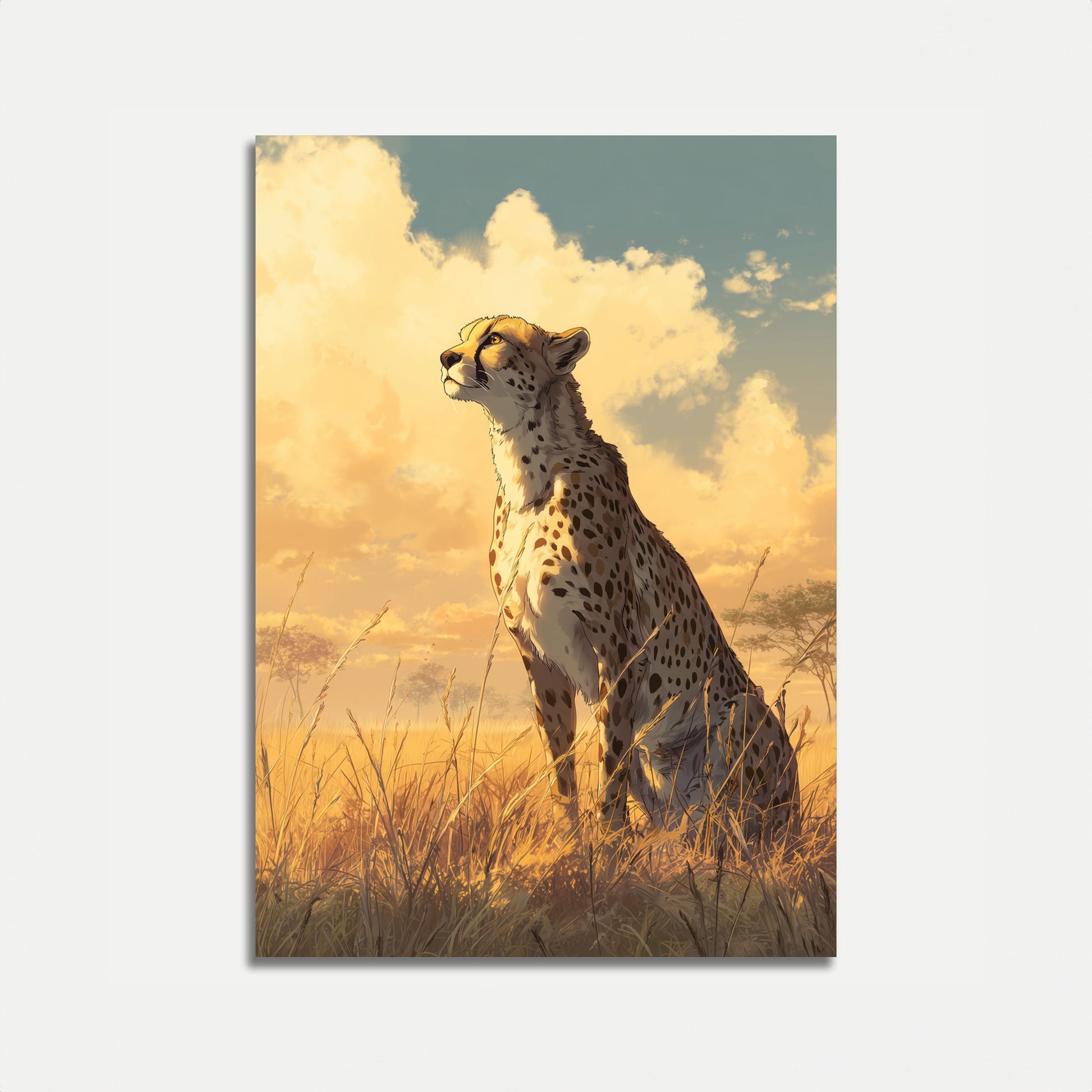 Sumérgete en la belleza salvaje de la naturaleza africana con este impresionante retrato de guepardo sobre un paisaje dorado y soleado. El majestuoso depredador se yergue entre la hierba ondulante, con su pelaje moteado reluciente y la mirada fija en el horizonte, capturando la esencia de la libertad salvaje y el espíritu indomable. Nubes cálidas y luminosas y una suave luz dorada crean un ambiente atmosférico que da vida a este increíble momento.