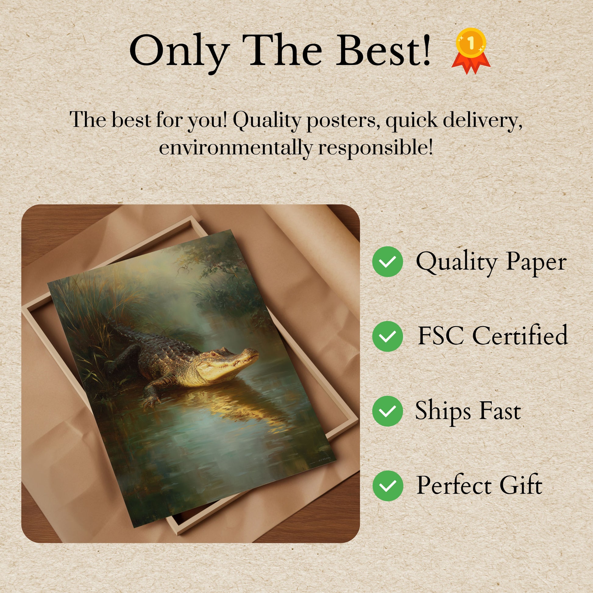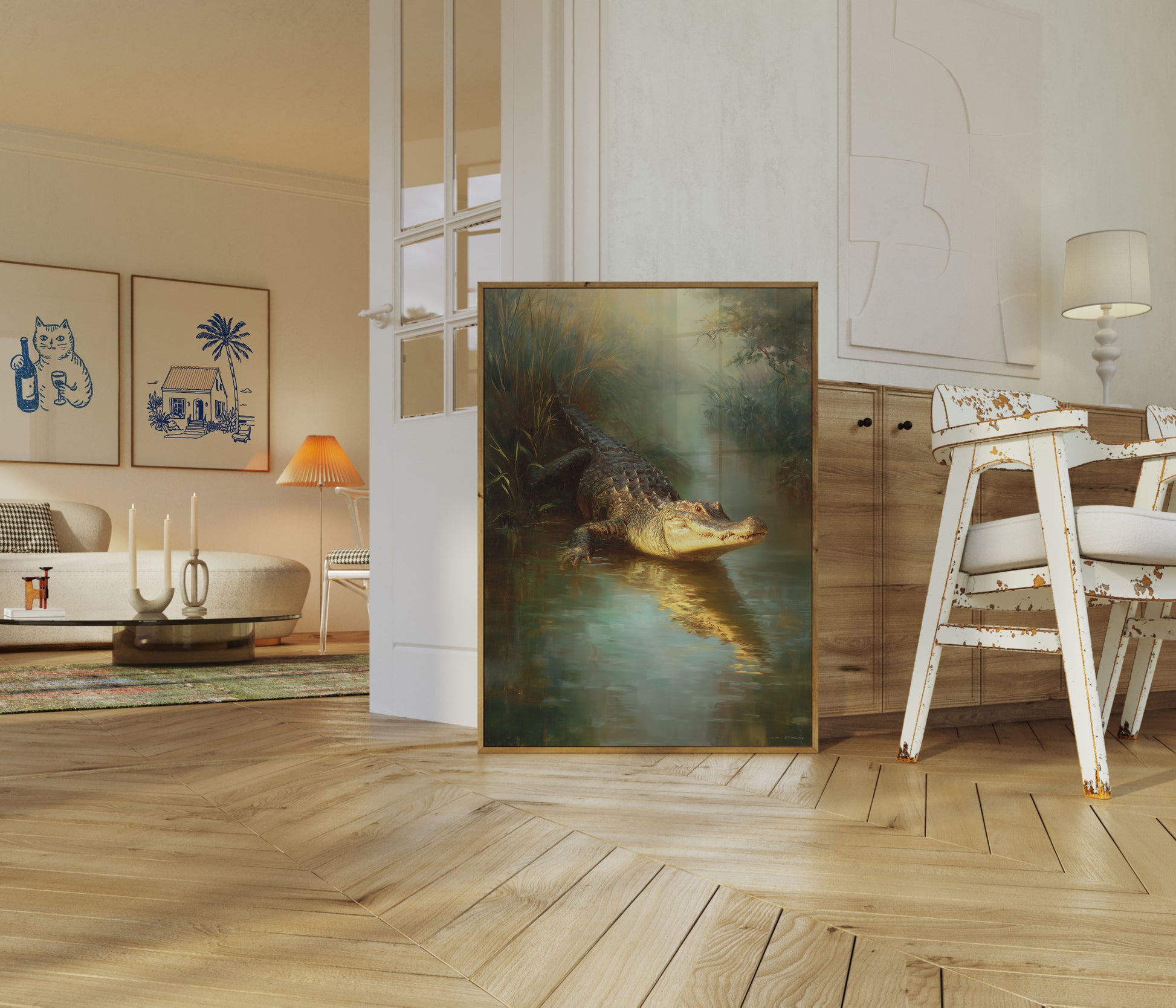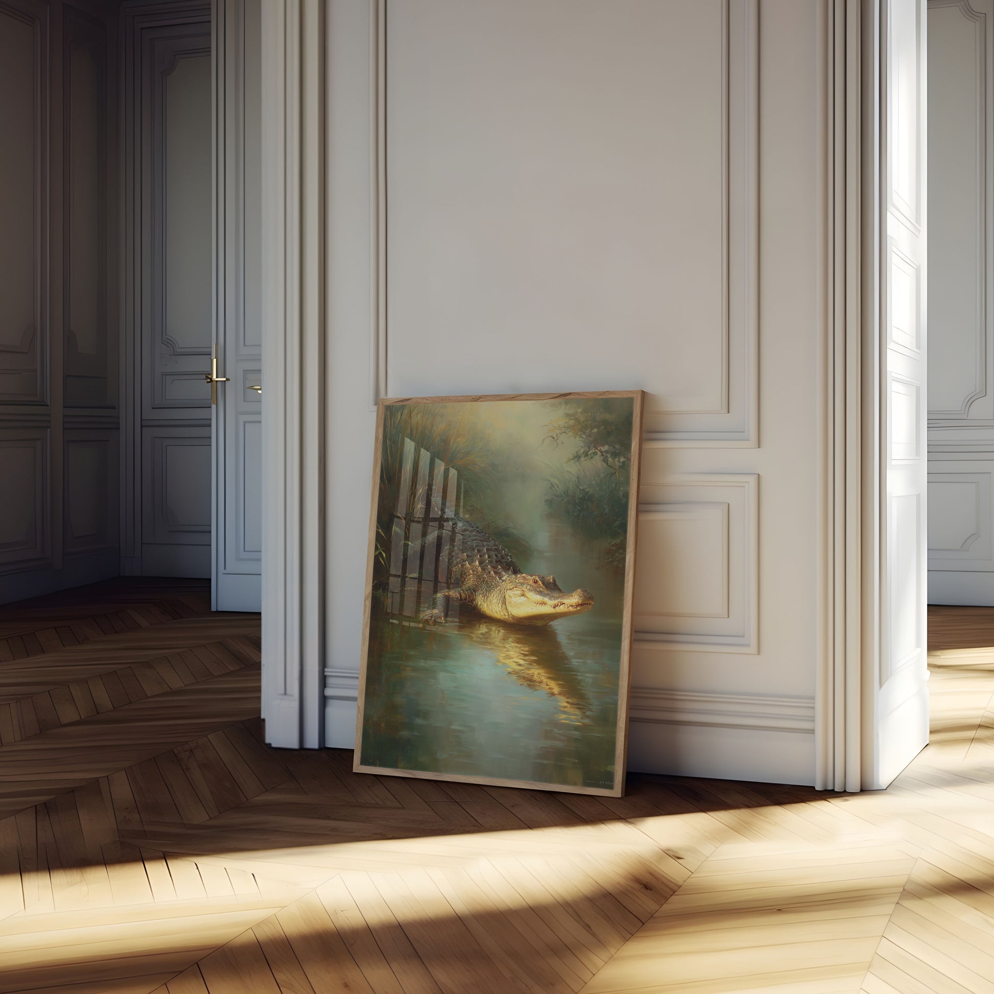 Una impresionante obra de arte de la vida silvestre que captura a un caimán disfrutando de una etérea luz dorada, emergiendo de las brumosas aguas de un pantano. La atmósfera suave y onírica de la pintura resalta la poderosa forma de la criatura prehistórica, con la cálida luz del sol iluminando sus escamas texturizadas y creando un reflejo hipnótico en la tranquila superficie del agua. Esta impresionante obra transforma al temido depredador en un ser majestuoso, casi místico, rodeado de exuberante vegetación y suaves tonos atmosféricos.