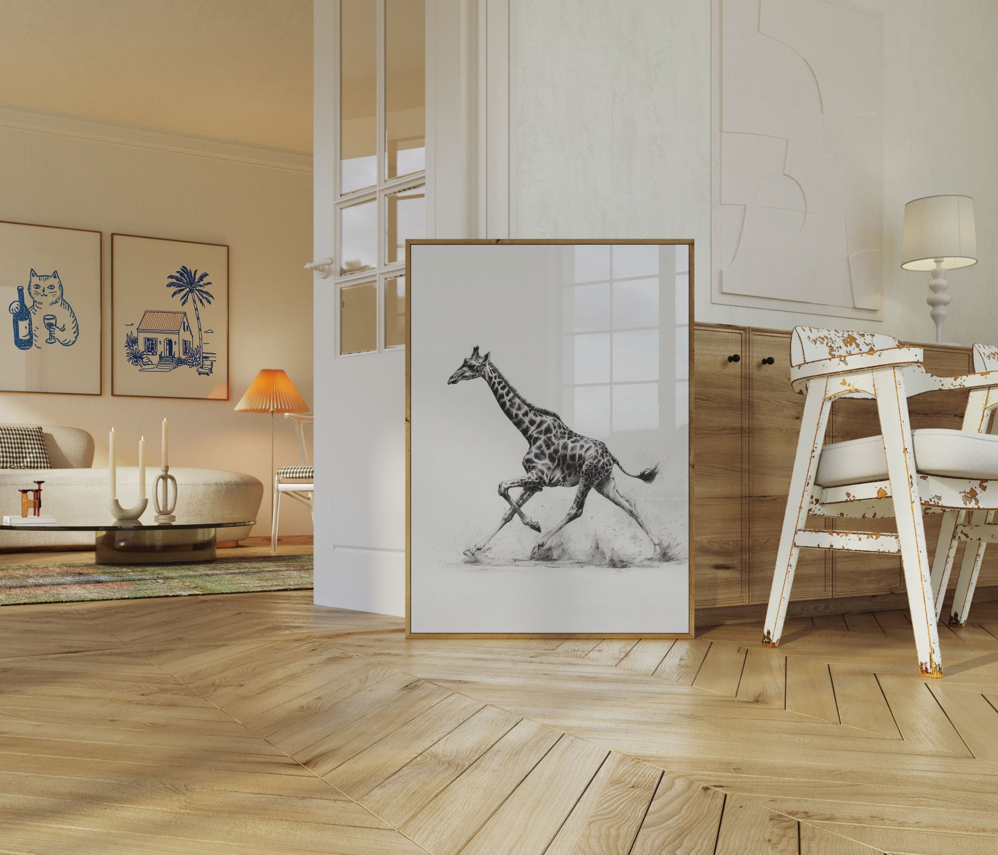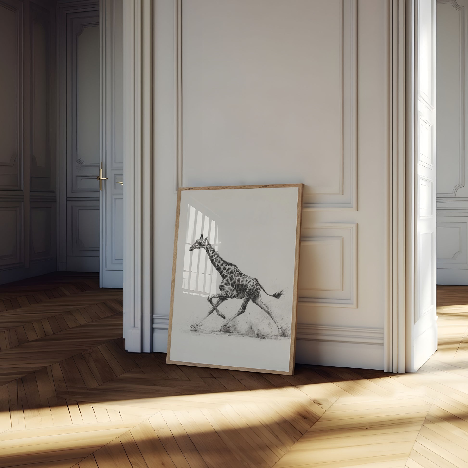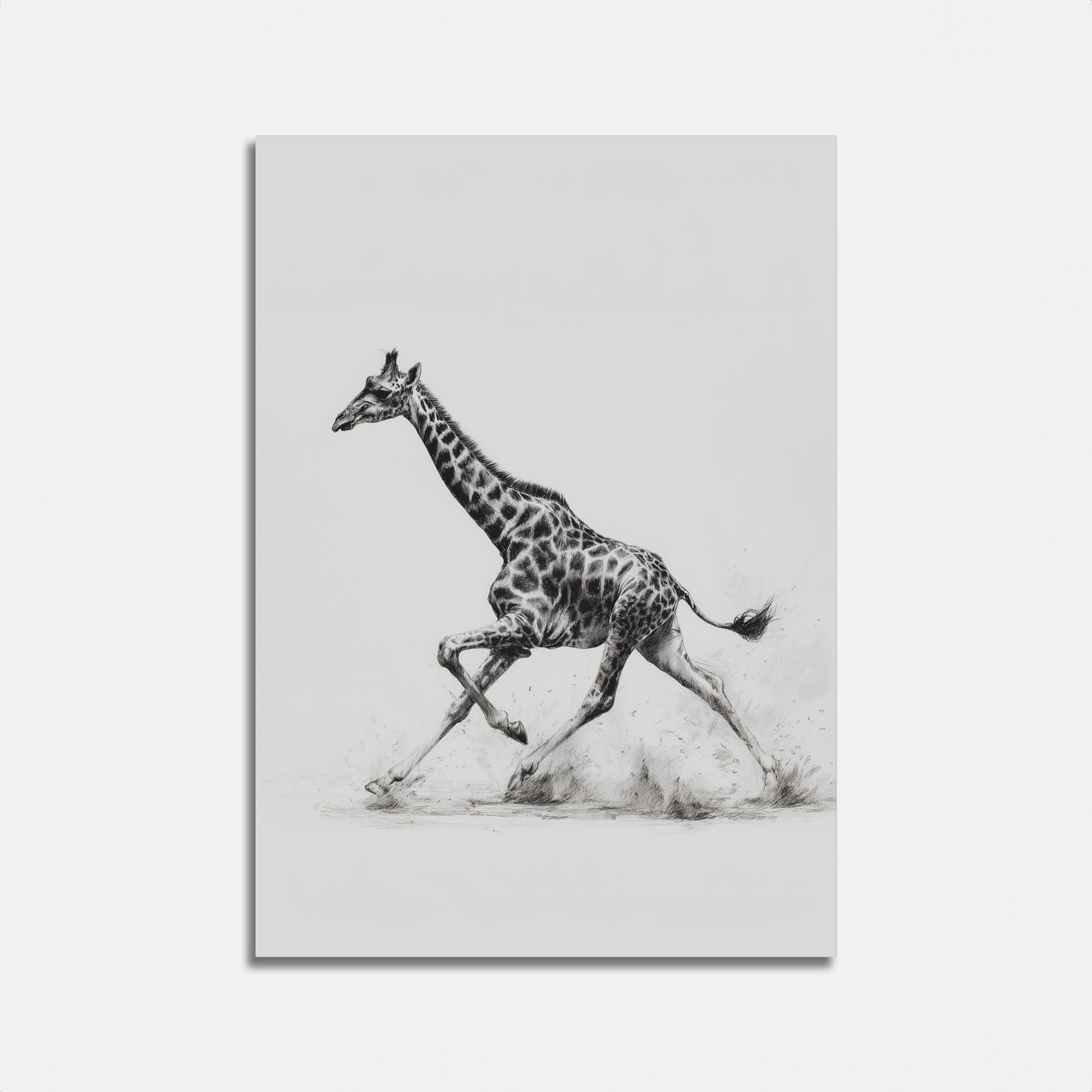 Descubra el impresionante dinamismo de la vida silvestre en este exquisito boceto en blanco y negro de una jirafa a plena zancada. El intrincado trabajo a lápiz captura el poderoso movimiento del animal, revelando cada detalle muscular y su distintivo patrón moteado con increíble precisión. Esta representación artística transforma el movimiento natural de la jirafa en una experiencia visual impresionante que celebra la belleza y la gracia de una de las criaturas más singulares de la naturaleza.