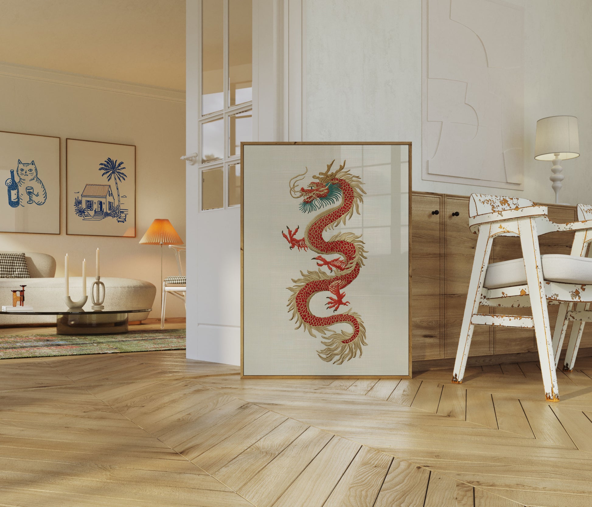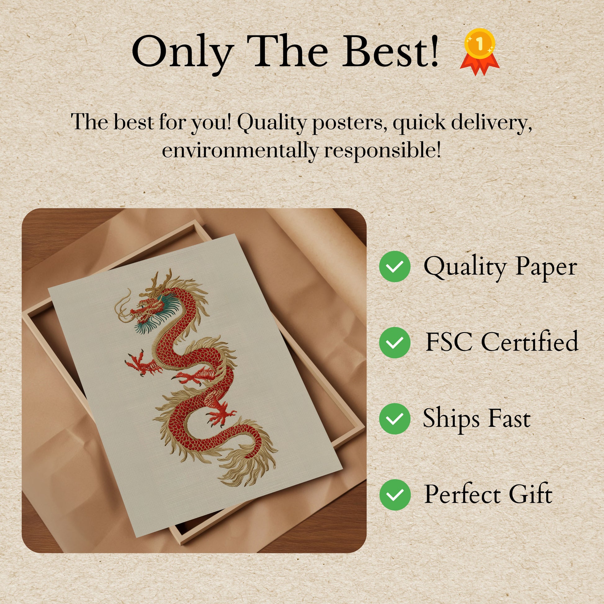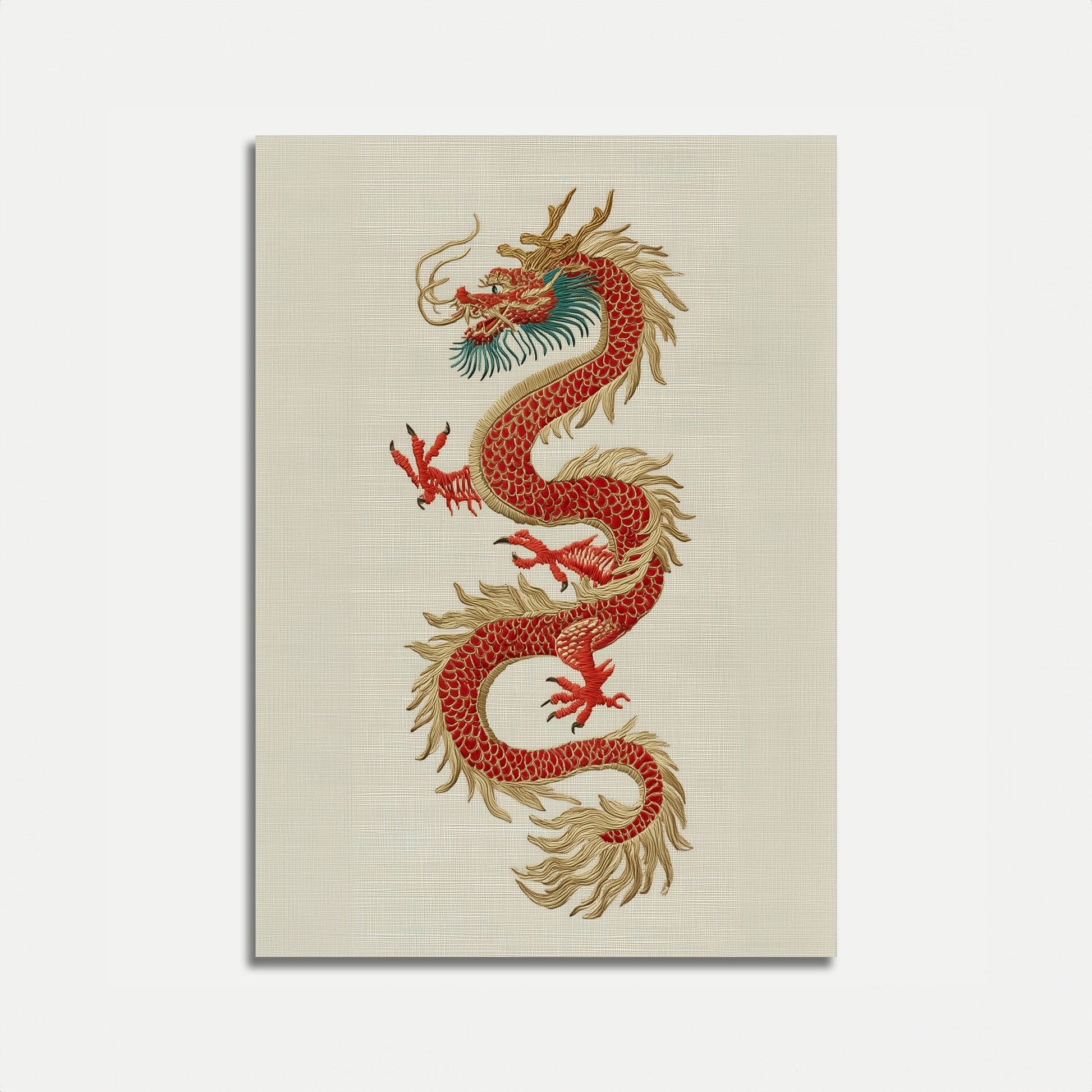 Sumérgete en la elegancia atemporal de esta impresionante obra de arte tradicional china de un dragón. Representado en ricos tonos rojo carmesí y dorado, el dragón serpentino se retuerce con un detalle fascinante, con su cuerpo escamoso adornado con intrincados adornos y un magnífico rostro verde azulado. Esta exquisita ilustración captura el poder y la gracia míticos de una criatura legendaria sobre un fondo suave y texturizado.