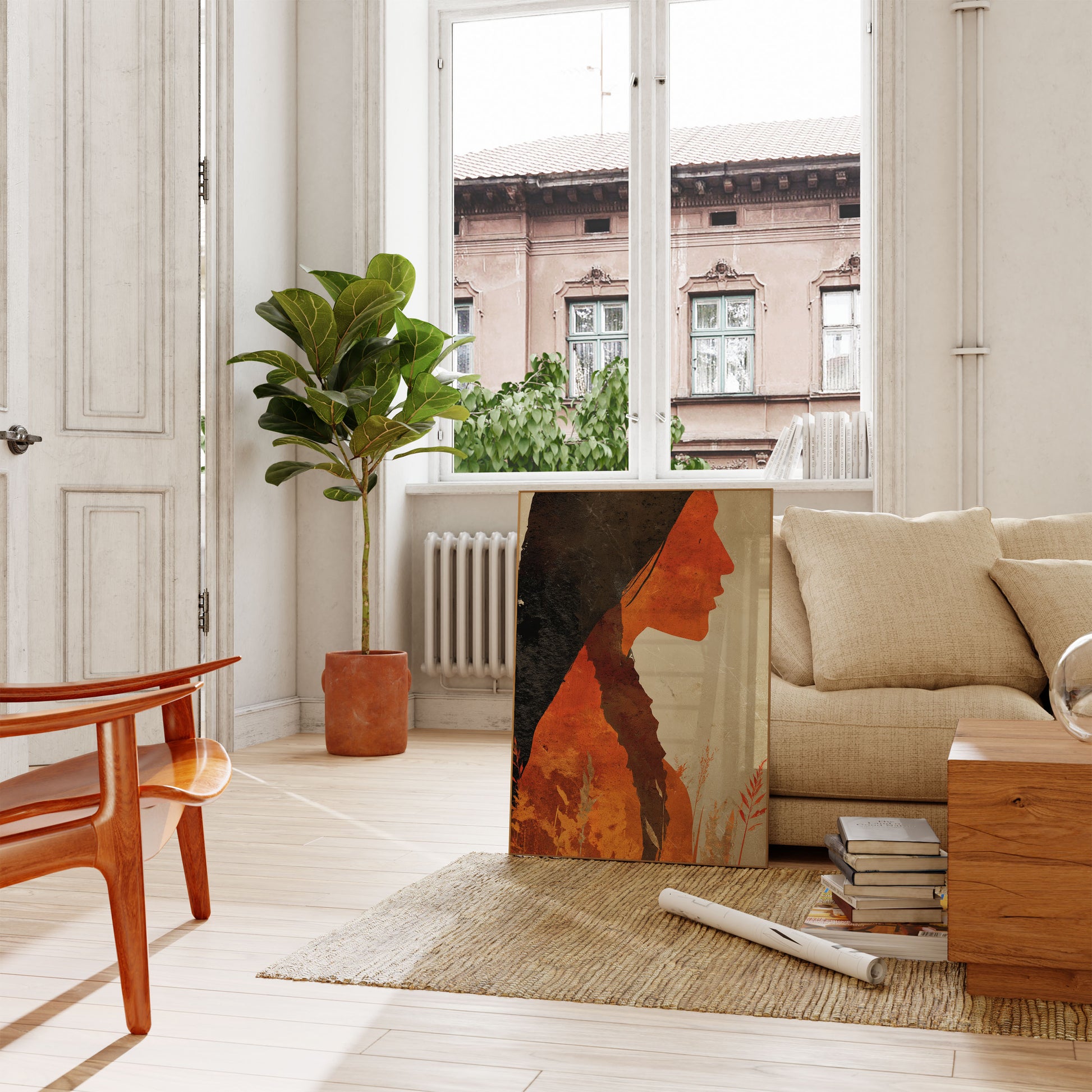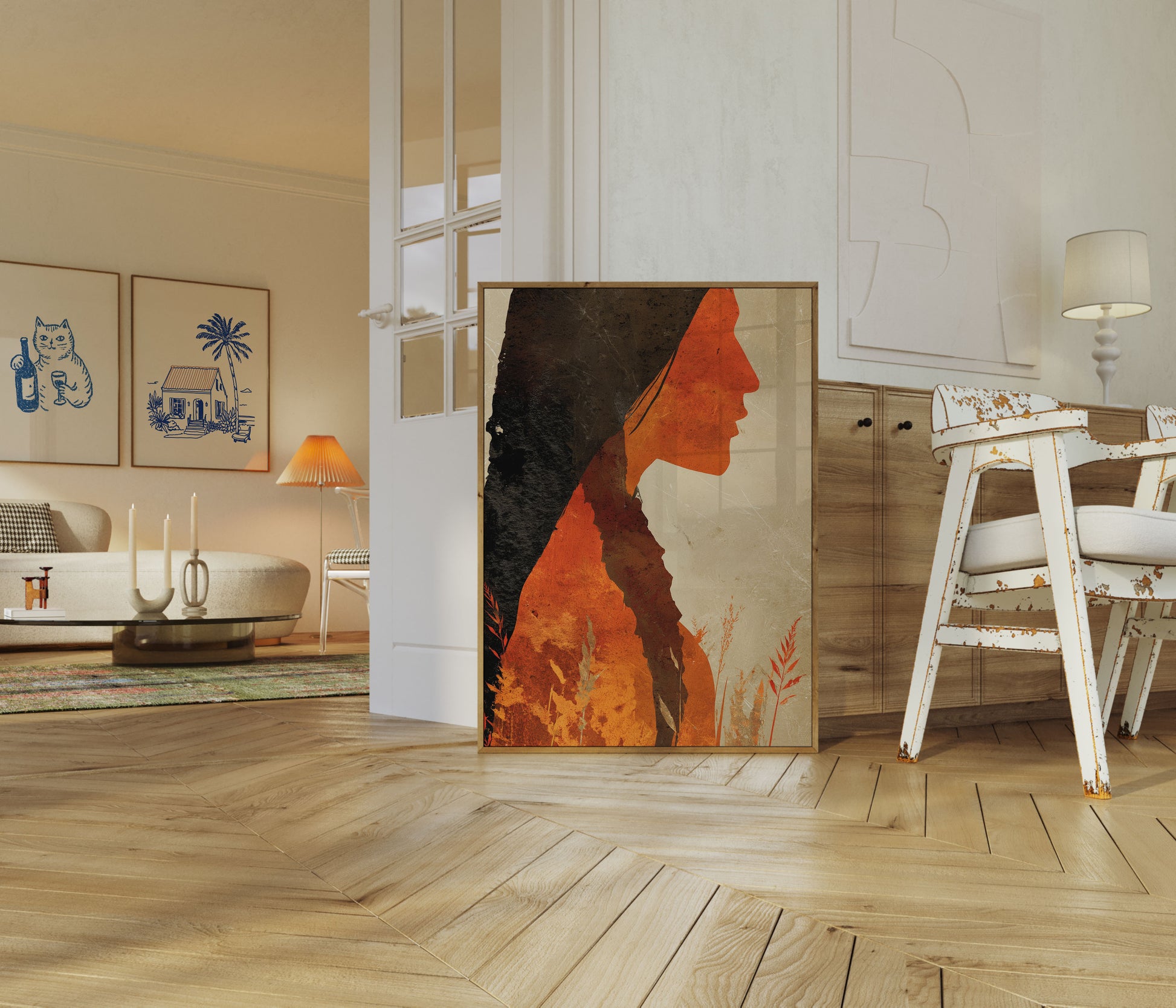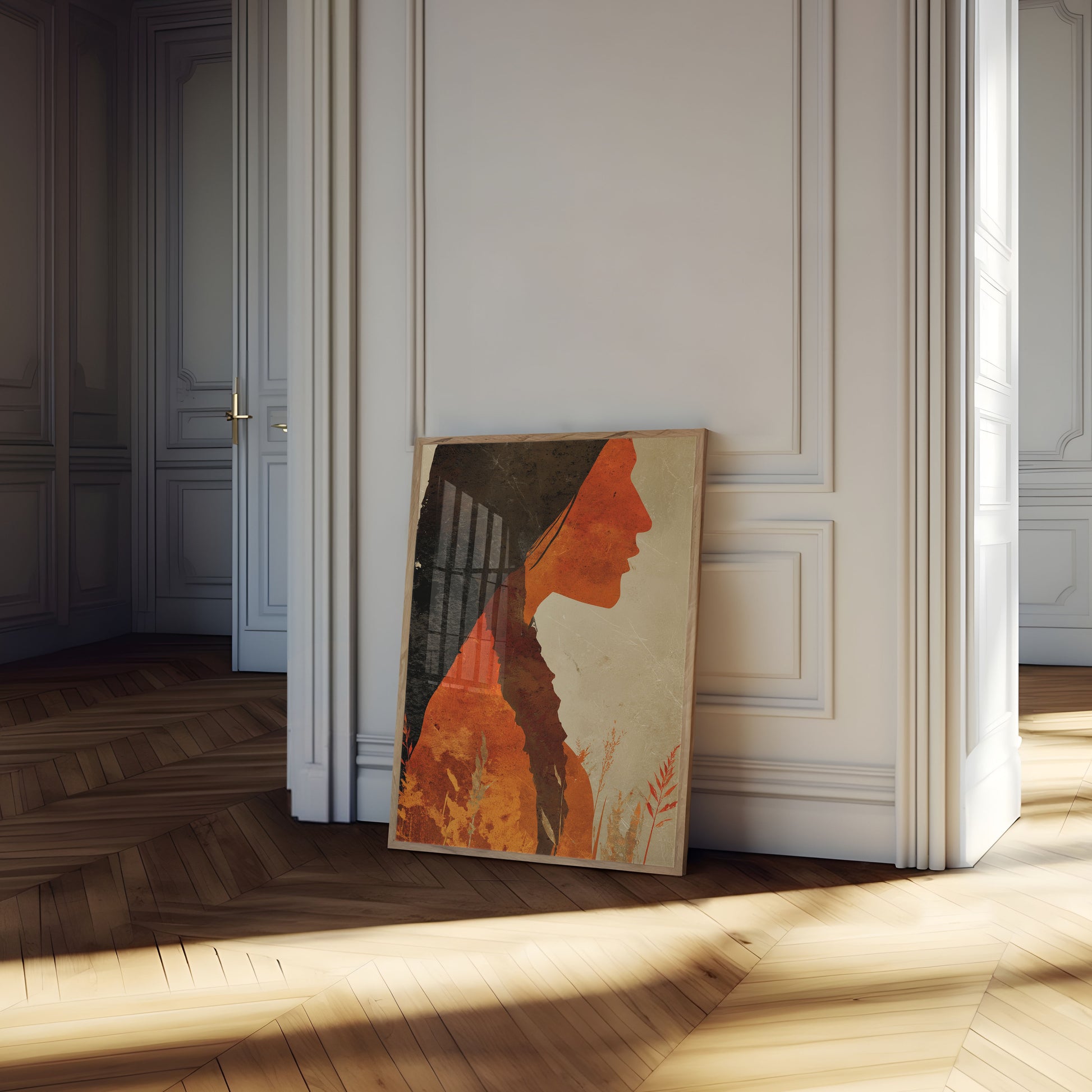 A powerful abstract portrait capturing the profound connection between Indigenous identity and the natural landscape. Warm orange and deep black tones blend seamlessly, creating a silhouette that merges human form with wilderness, symbolizing spiritual unity and ancestral roots. Delicate grass and plant elements frame the profile, suggesting a deep, intrinsic relationship with the earth.