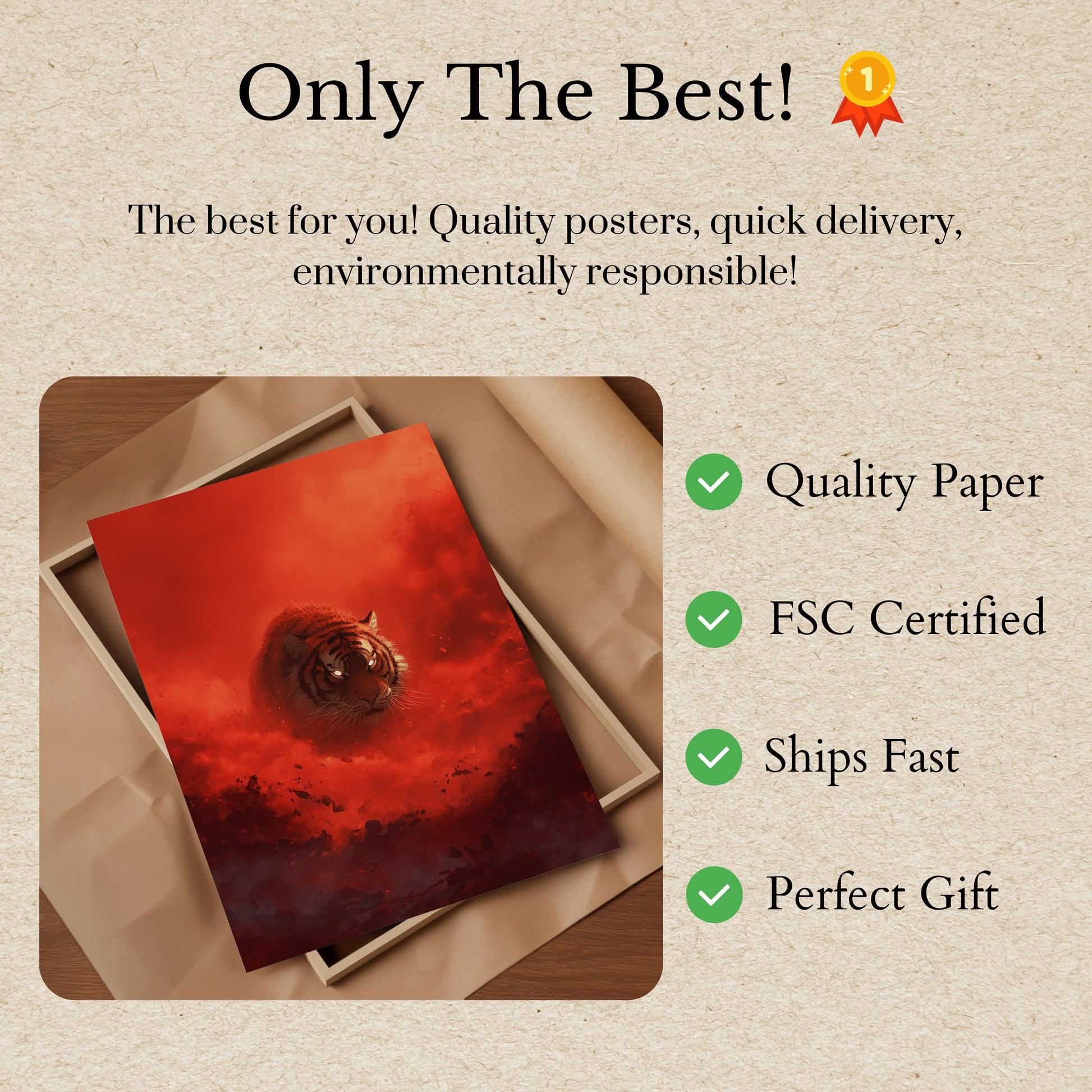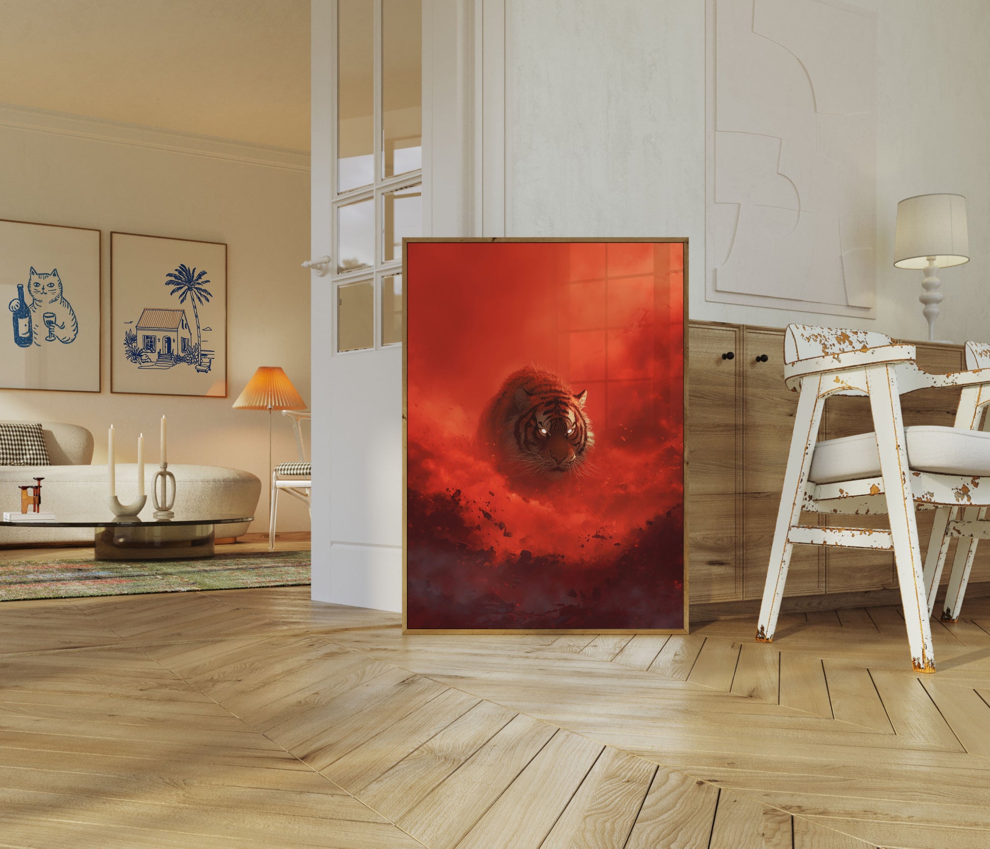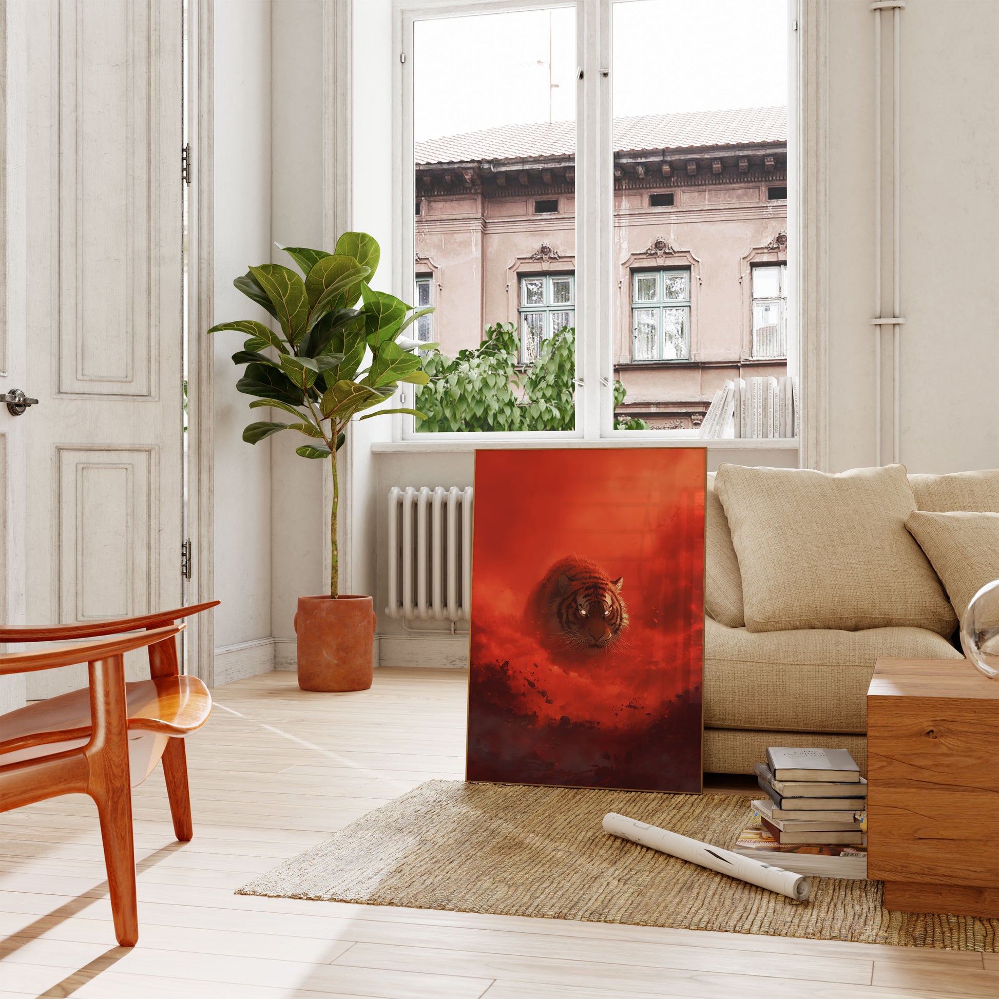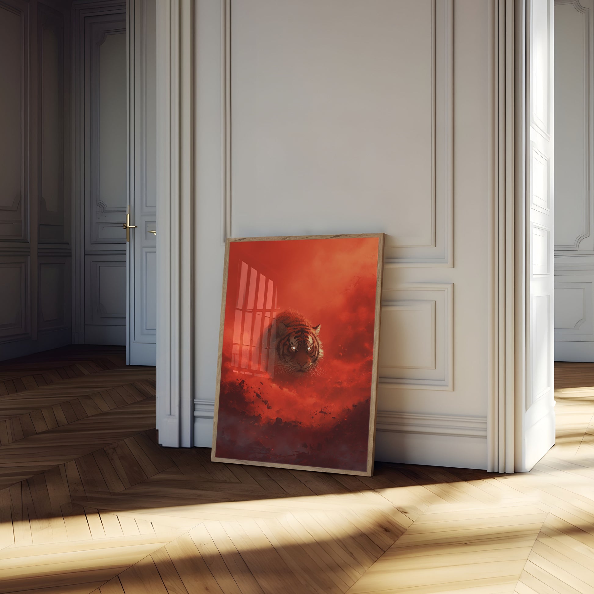 Sumérgete en un mundo de intensidad pura y primitiva con este fascinante retrato de tigre sobre un fondo carmesí resplandeciente. Los penetrantes ojos del majestuoso depredador atraviesan las llamas y los escombros turbulentos, creando una escena visceral de poder y energía sobrenatural. Cada pincelada y efecto digital captura el espíritu indomable de esta magnífica criatura, transformando la imagen en una experiencia visual impresionante que cautiva la atención y despierta la imaginación.