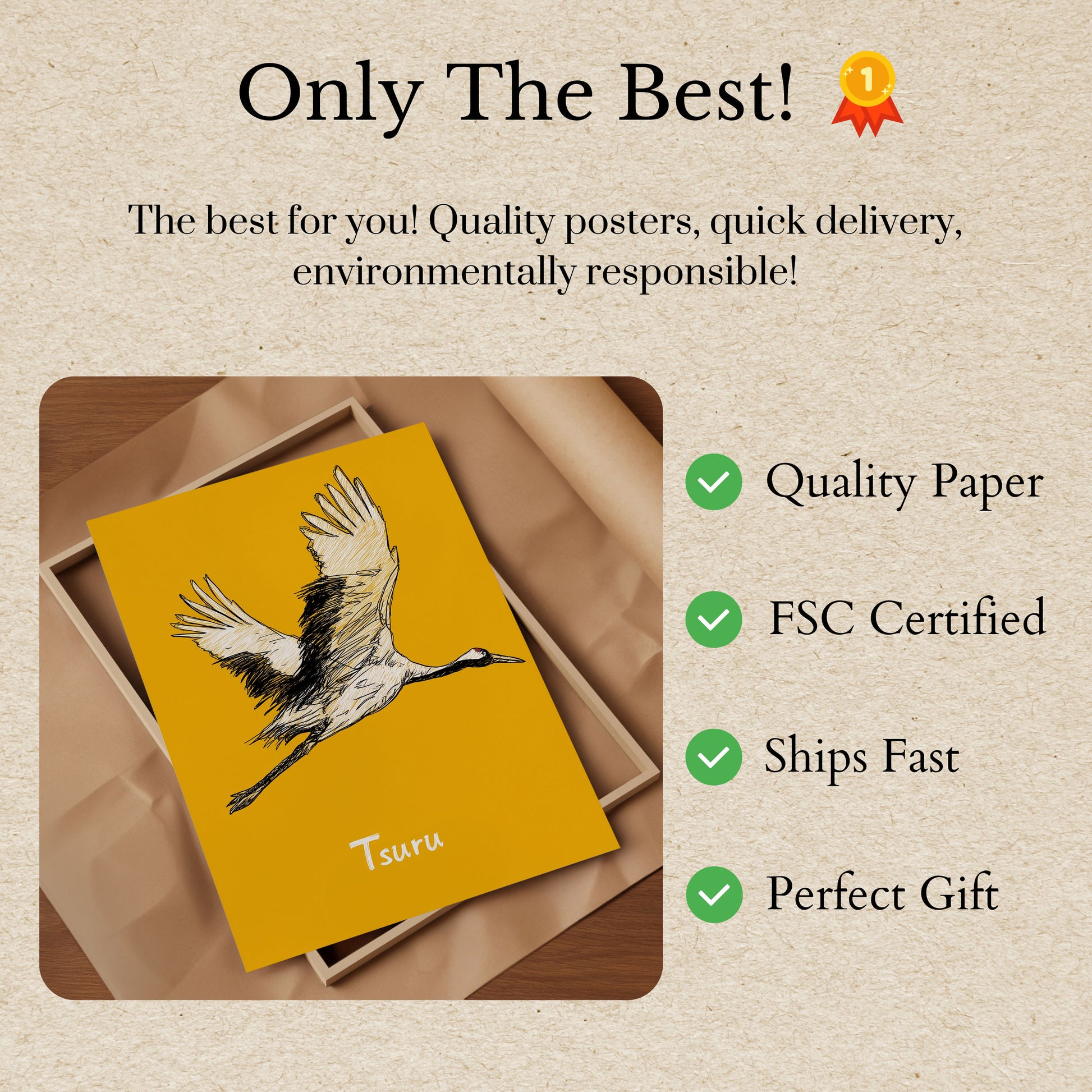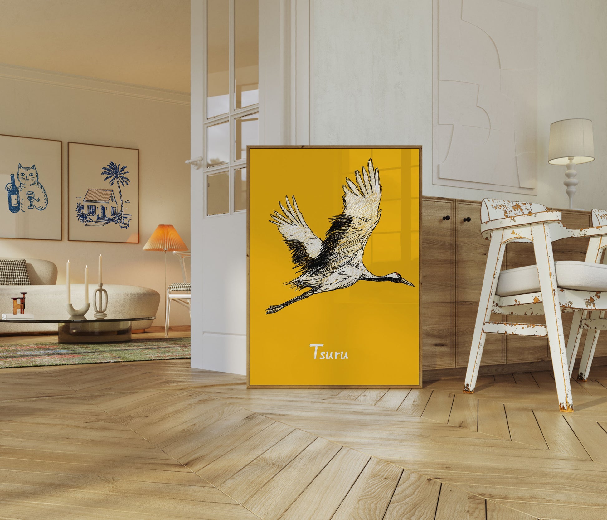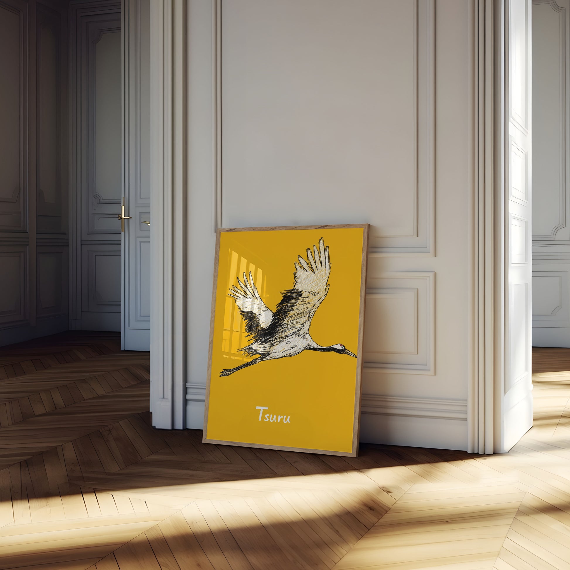 Captura la elegante gracia de la majestuosa grulla japonesa con esta impresionante ilustración artística. Sobre un vibrante fondo amarillo dorado, el tsuru, dibujado a mano, se eleva con energía dinámica, con las alas extendidas en una magistral exhibición de movimiento y precisión. Las líneas texturizadas del boceto y los contrastantes tonos blanco y negro dan vida a esta ave sagrada del simbolismo japonés con una increíble poesía visual.