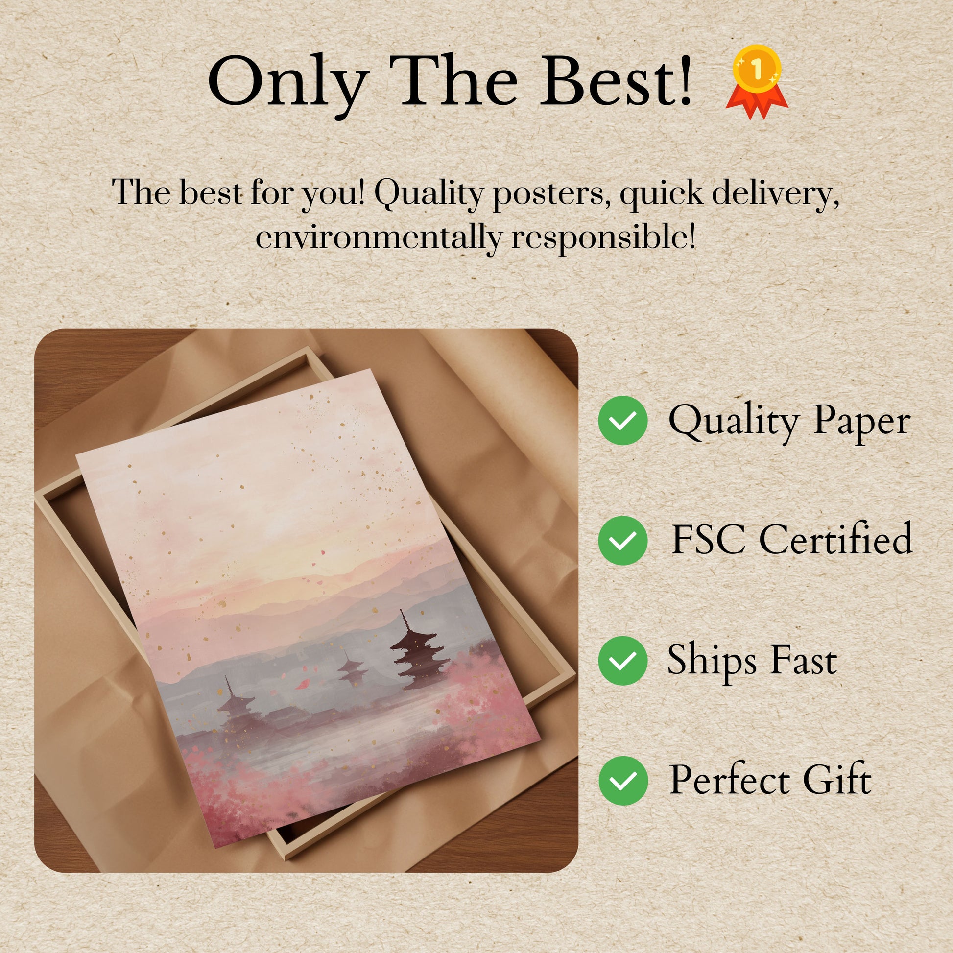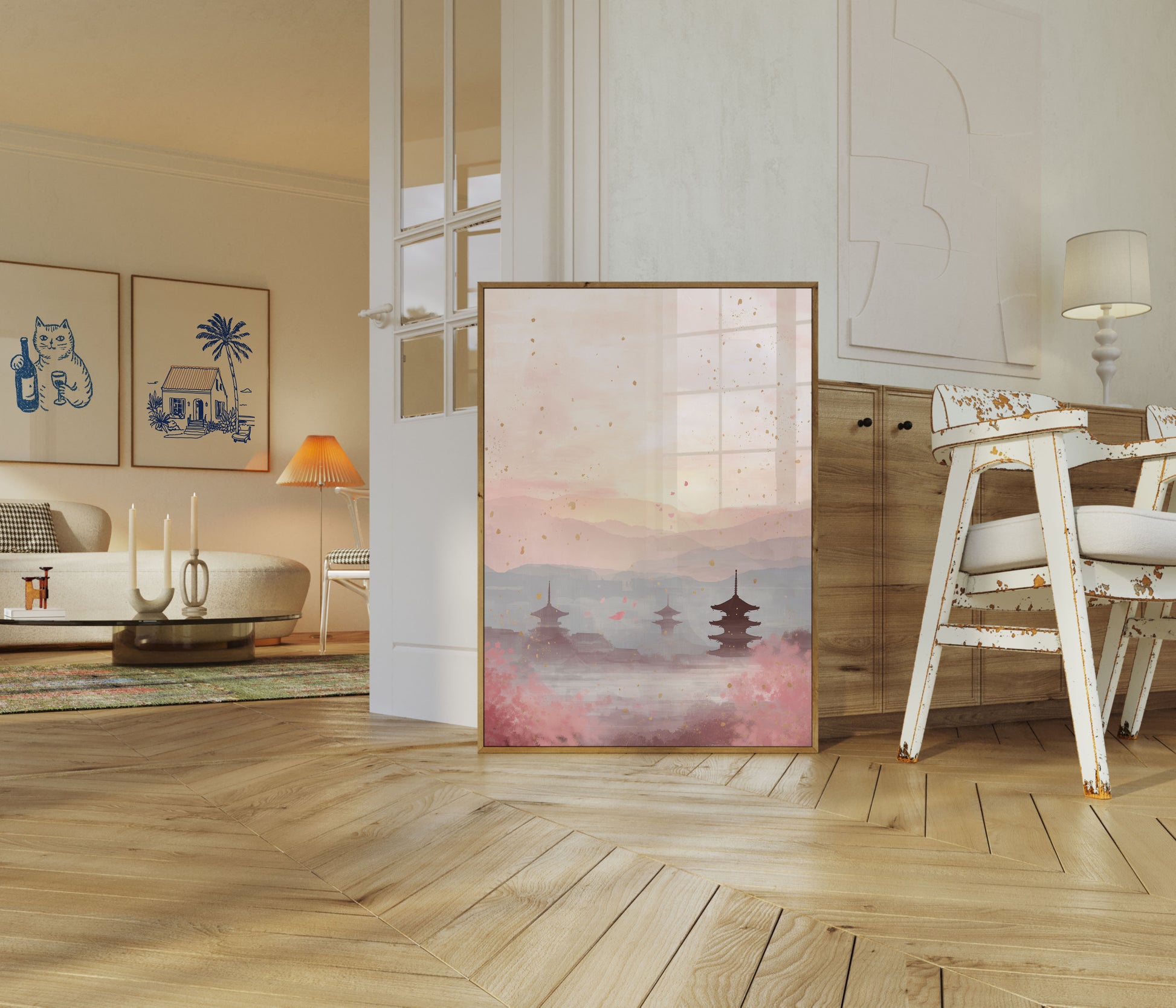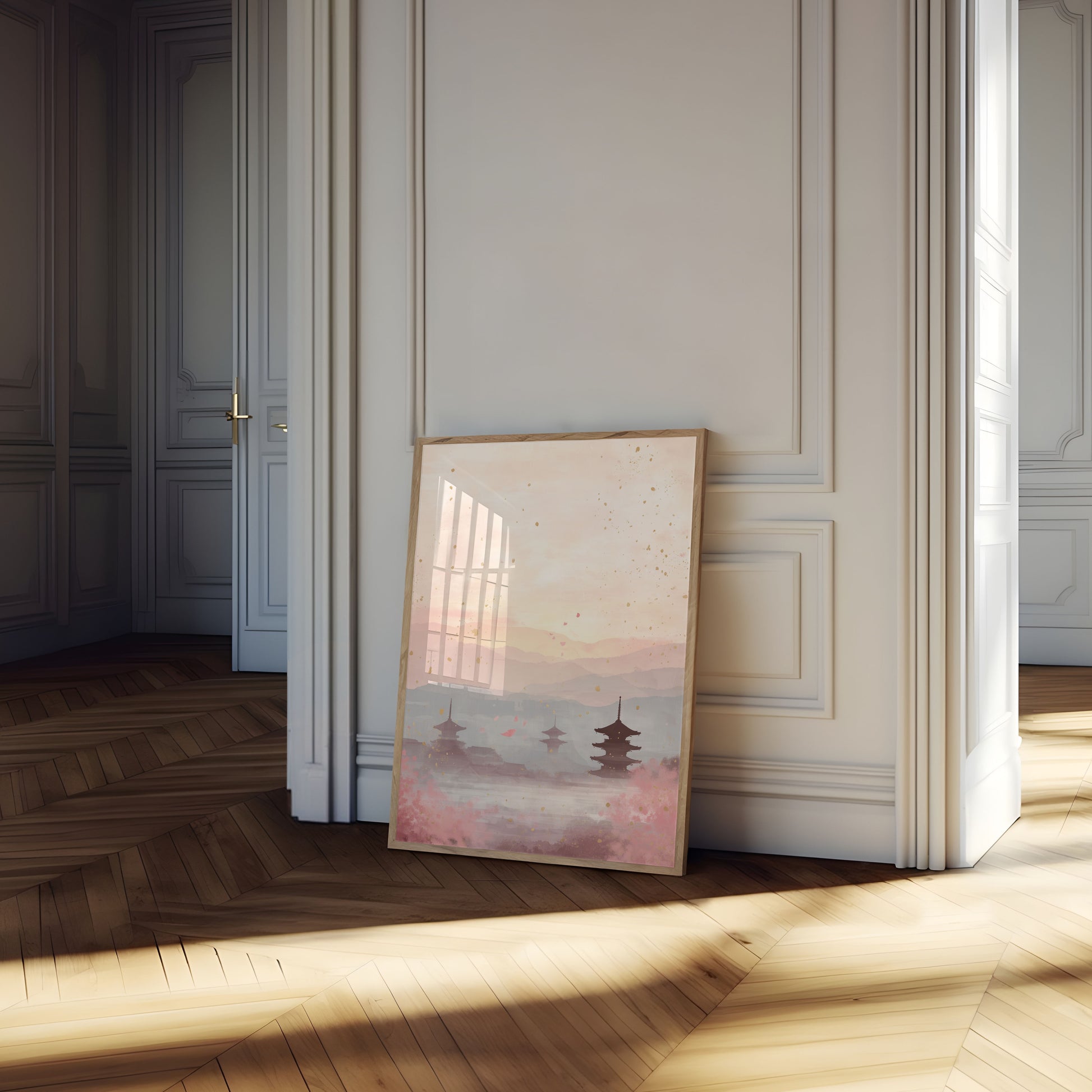 Sumérgete en la serena belleza de los paisajes tradicionales japoneses con esta escena de ensueño de un templo con cerezos en flor. Los suaves tonos rosa y gris neblinoso crean un impresionante panorama de antiguas pagodas enclavadas entre montañas escalonadas, con delicados destellos dorados que danzan en la atmósfera etérea. La suave cascada de pétalos de sakura y la silueta de los templos evocan una sensación de magia serena y elegancia atemporal.