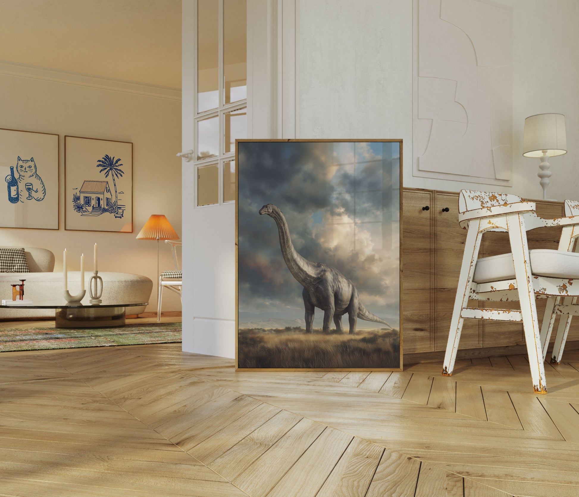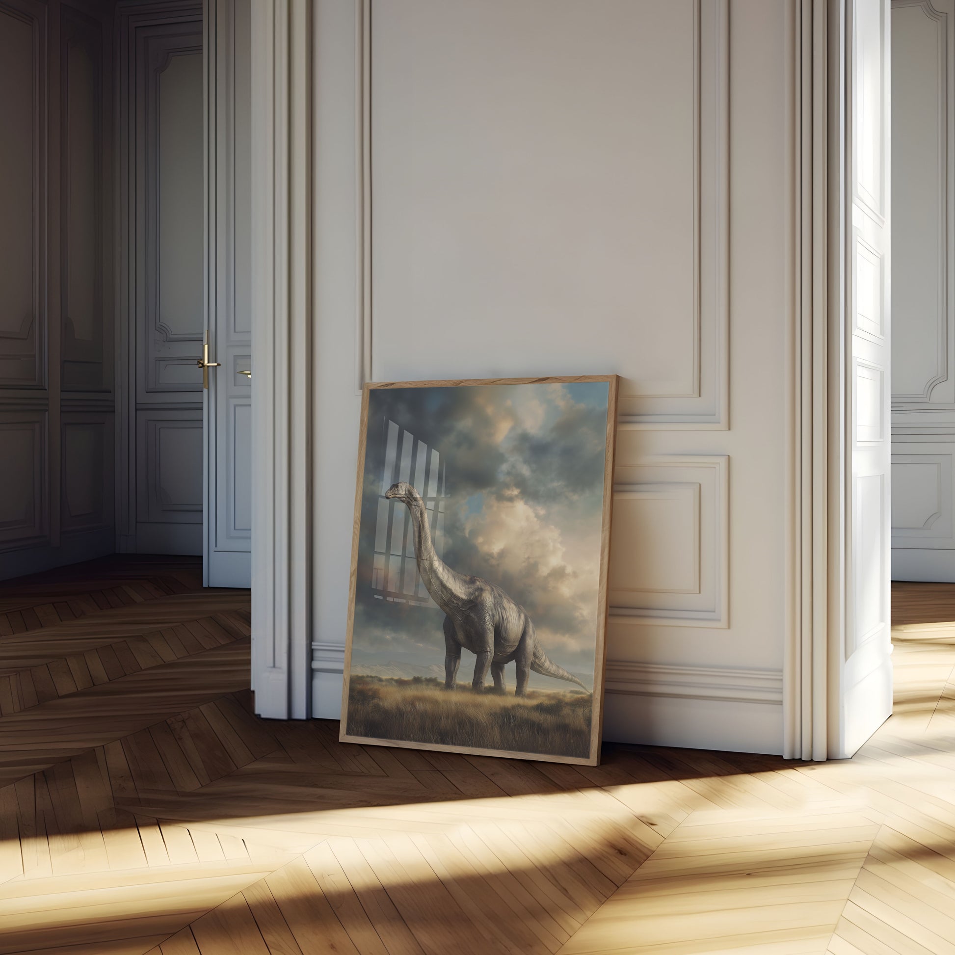 Viaja a la era de los gigantes con esta impresionante ilustración de un brontosaurio erguido en una extensa pradera. El cielo dramático, repleto de nubes tenuemente iluminadas y una suave luz dorada, crea un telón de fondo etéreo para este magnífico dinosaurio saurópodo. Cada detalle captura la serenidad y el antiguo misterio de estas increíbles criaturas prehistóricas, invitando al espectador a imaginar un mundo mucho antes de la existencia humana.