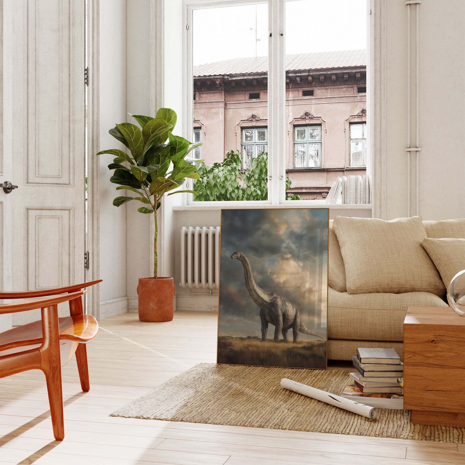 Póster de paisaje prehistórico majestuoso del Brontosaurio