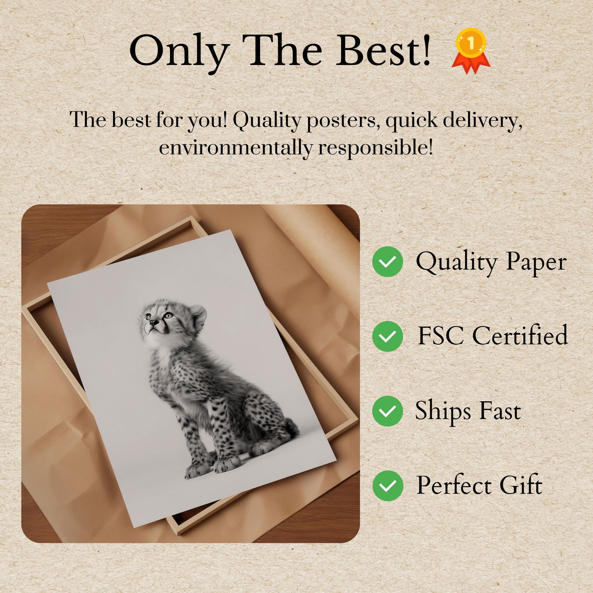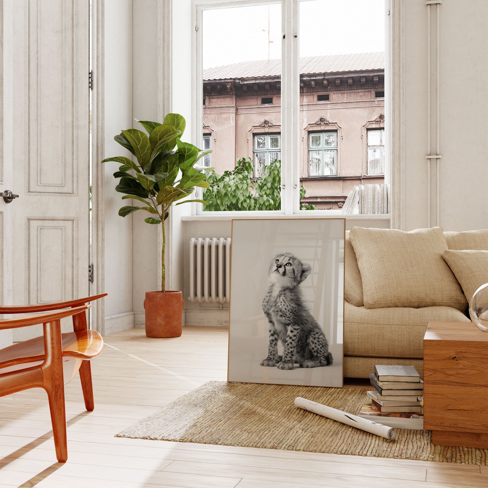 Capturando la esencia de la belleza salvaje, este impresionante retrato en blanco y negro muestra a un cachorro de guepardo en un momento de pura curiosidad. Con su pelaje moteado y su mirada penetrante, el cachorro se sienta erguido; su elegante postura y su suave pelaje crean una fascinante sinfonía visual que evoca la gracia de la vida silvestre. El fondo minimalista permite que los intrincados detalles del guepardo sean el centro de atención, invitando al espectador a un mundo de maravillas naturales y espíritu indómito.