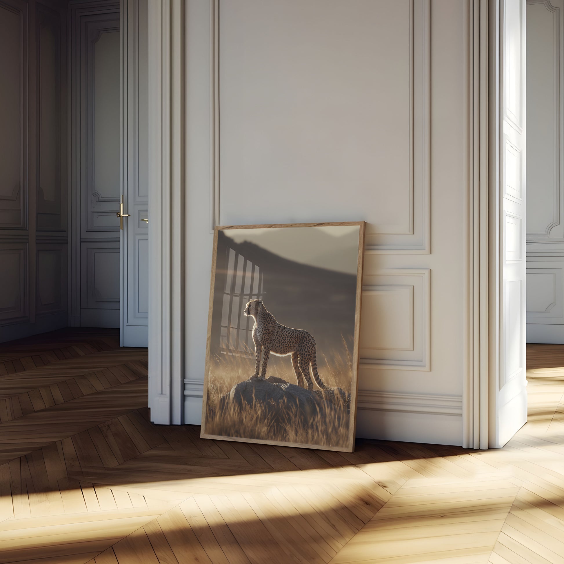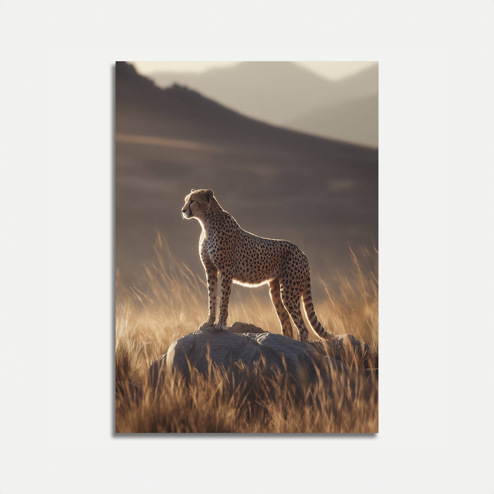 Captura la belleza natural del depredador más elegante de África en esta impresionante fotografía de vida silvestre. Un guepardo solitario se yergue como centinela en un afloramiento rocoso, bañado por una luz dorada con montañas brumosas al fondo. La imagen irradia poder, gracia y el espíritu indómito de la naturaleza, con suaves praderas e iluminación dramática que crean un momento impresionante de perfección natural.