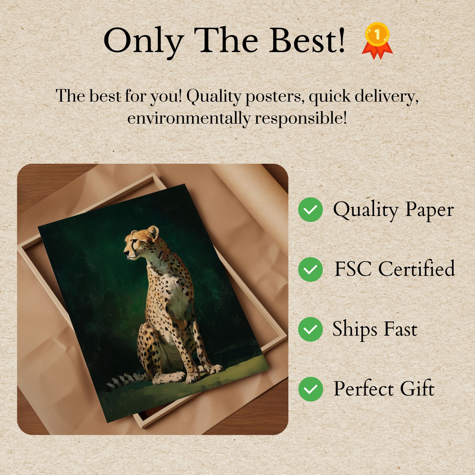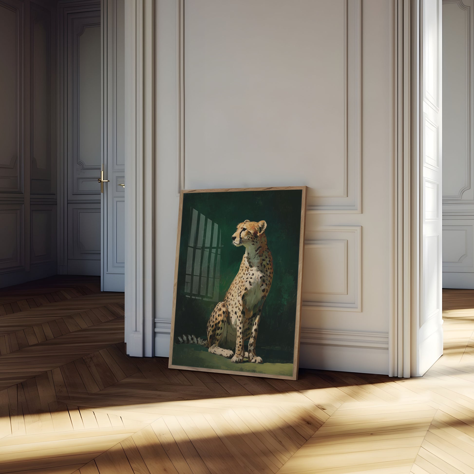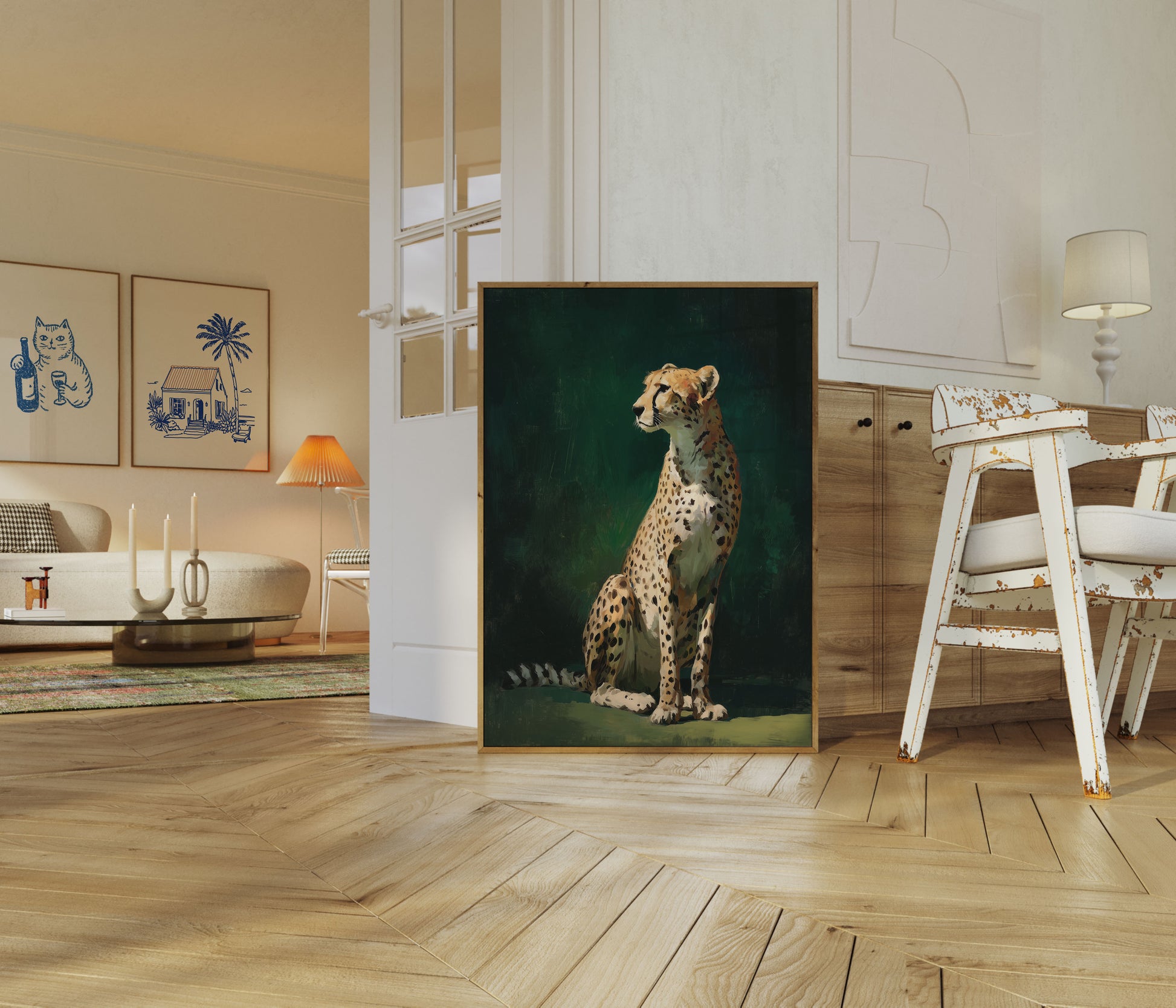Un impresionante retrato de un guepardo, capturado en ricos tonos verde esmeralda, esta obra de arte exhibe la majestuosa elegancia de uno de los depredadores más elegantes de la naturaleza. El estilo pictórico realza el intrincado pelaje moteado y la intensa mirada del guepardo, creando una poderosa narrativa visual de fuerza y belleza sobre un fondo profundo y misterioso. Cada pincelada parece insuflar vida a esta magnífica criatura, invitando al espectador a conectar con el espíritu salvaje y puro del reino animal.