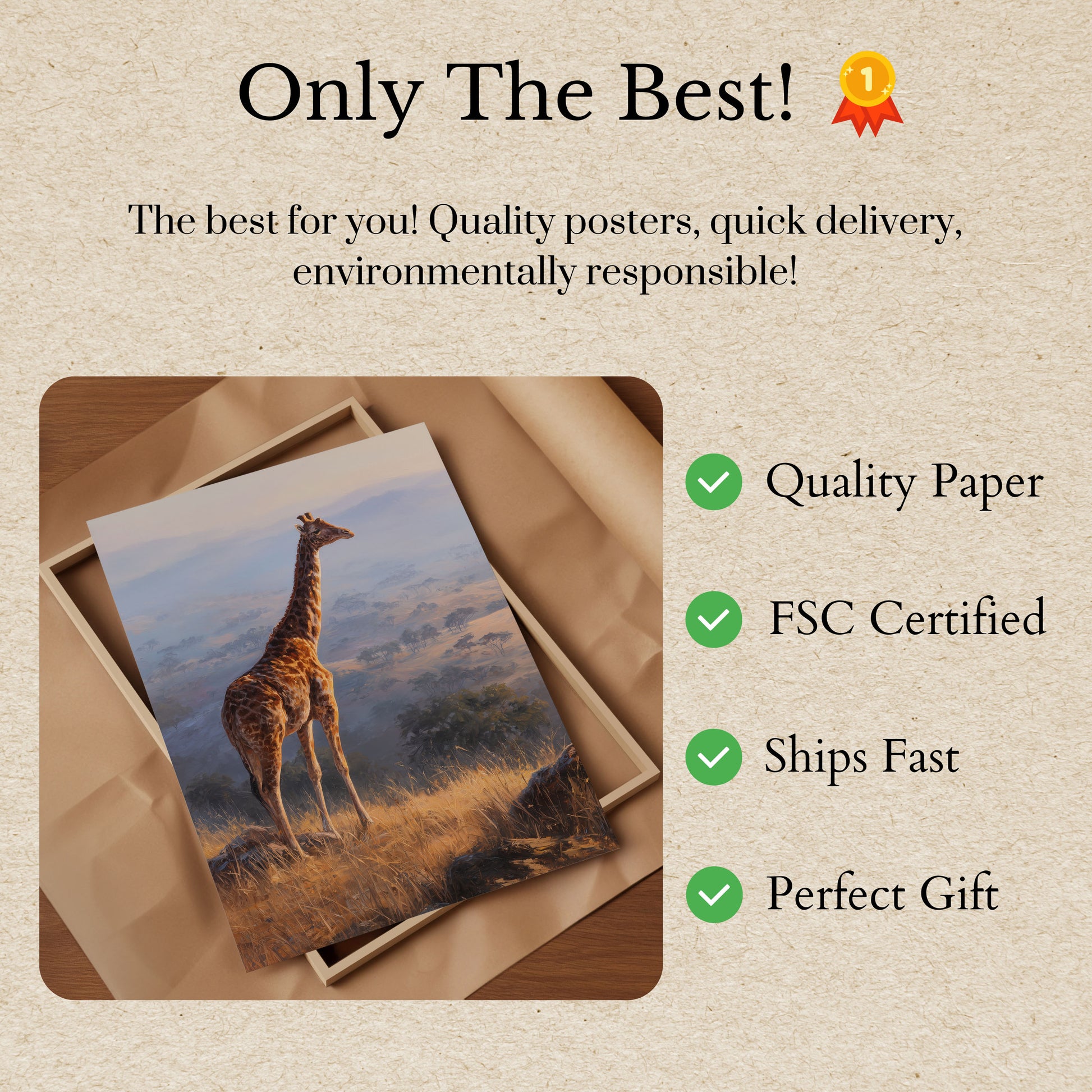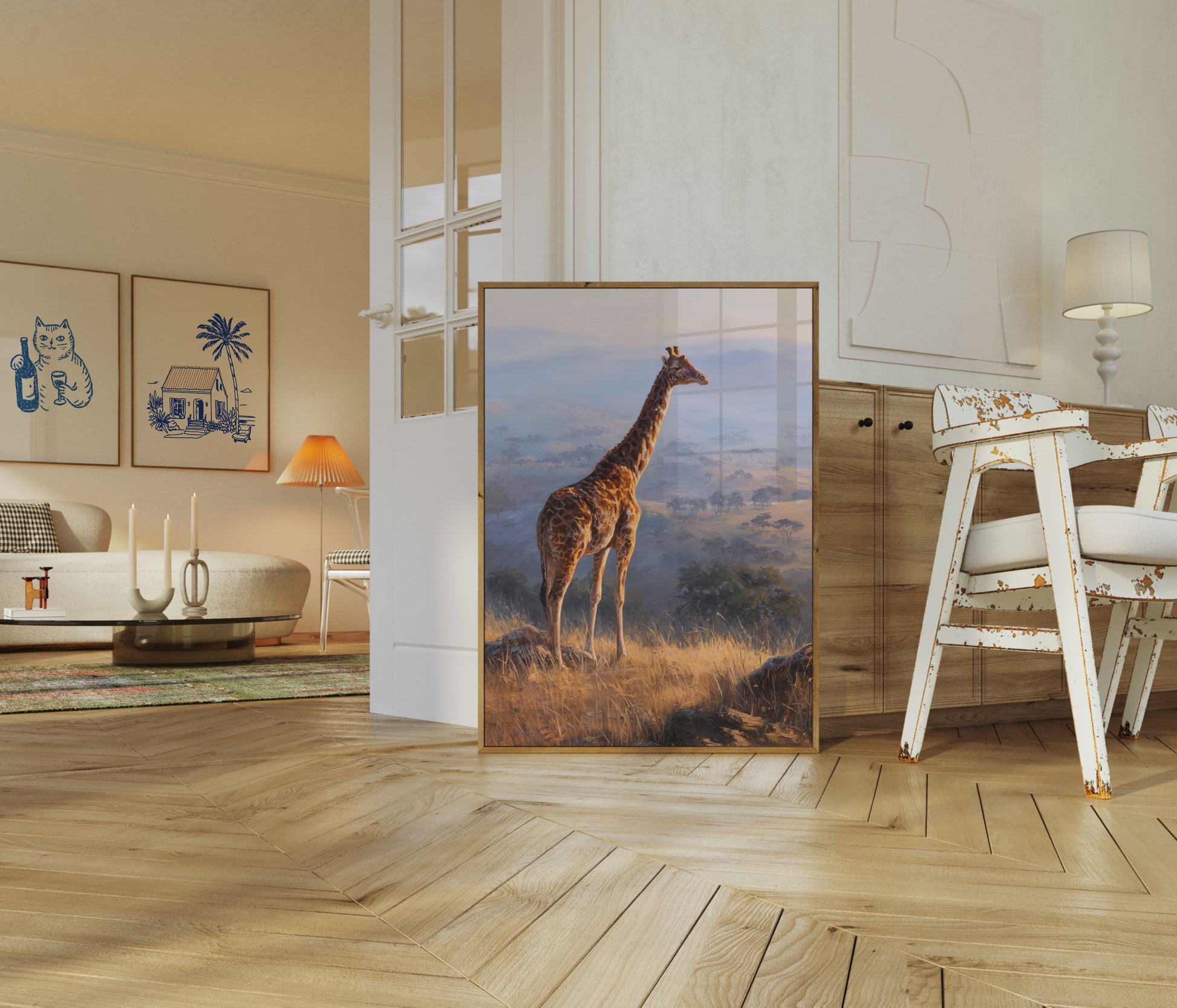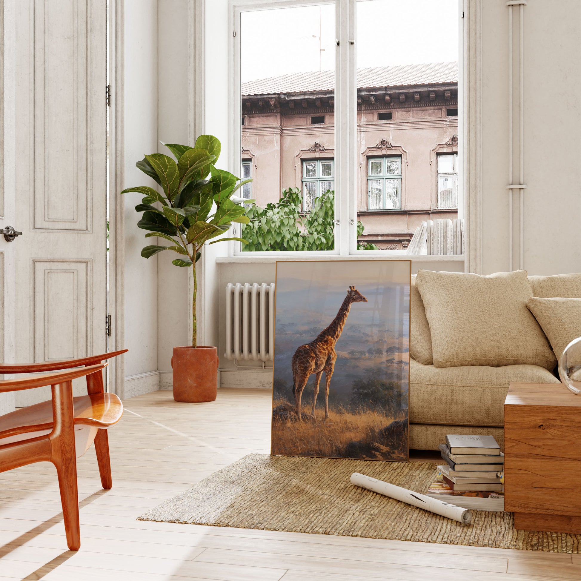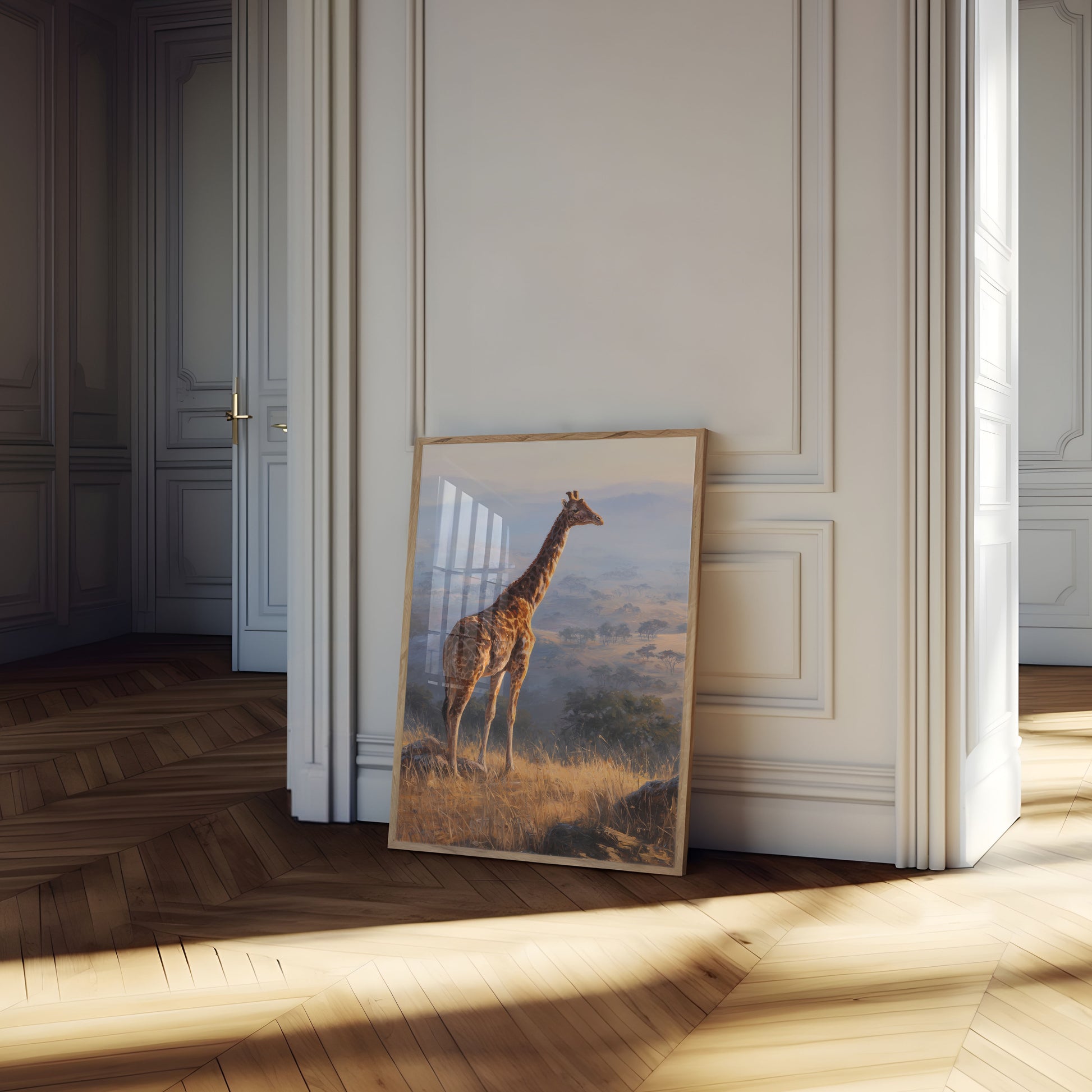 Contemple de cerca al gentil gigante de la naturaleza en esta impresionante pintura de paisaje de jirafas. Bañada por una cálida luz dorada y un horizonte azul brumoso, esta obra captura la serena belleza de la sabana africana al amanecer. El intrincado pelaje moteado de la jirafa y su elegante porte dominan el primer plano, invitando al espectador a un mundo de serenidad y belleza indómita.