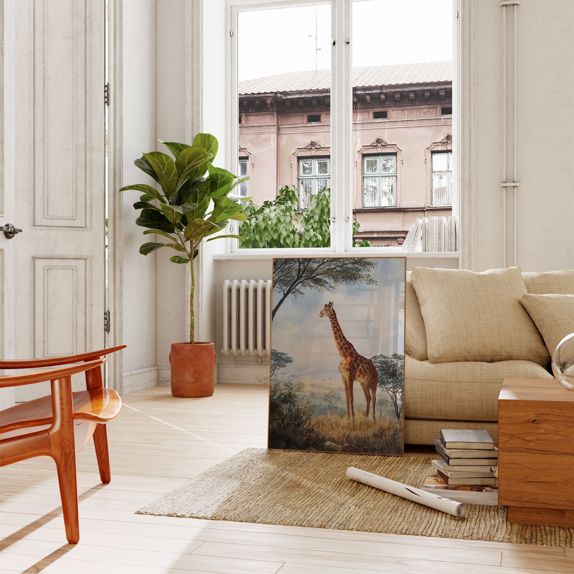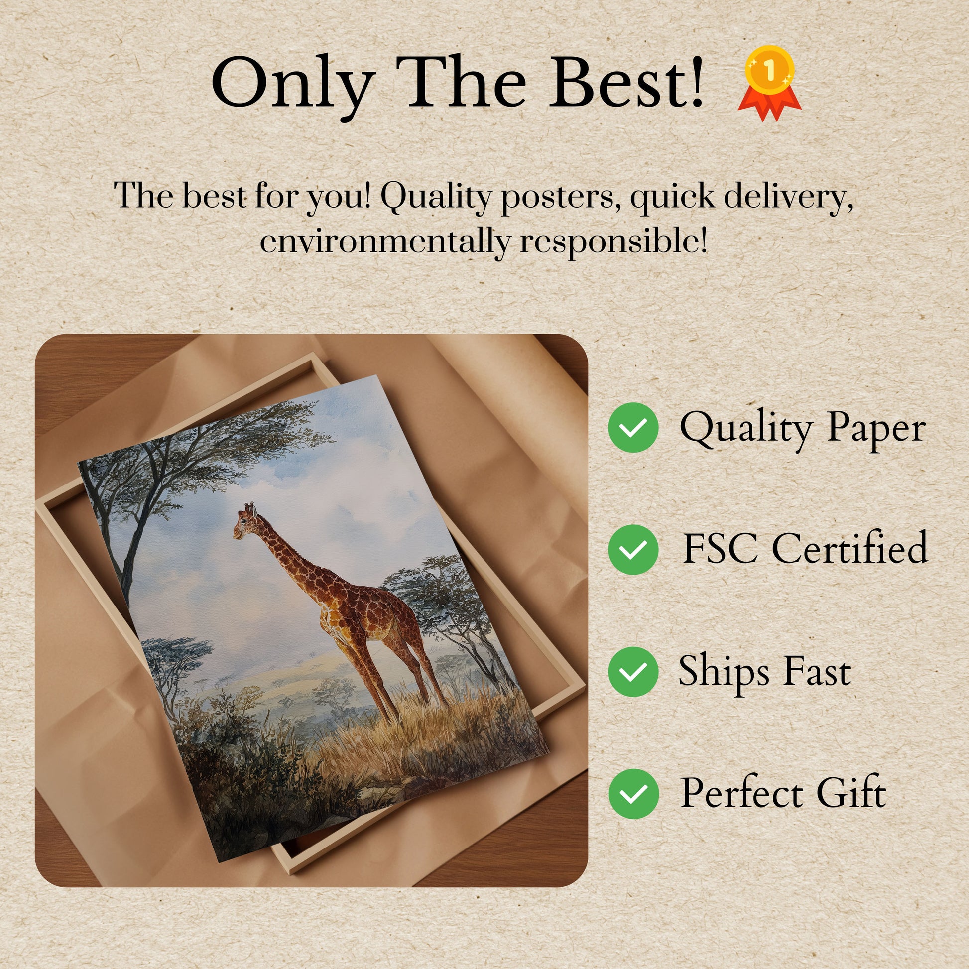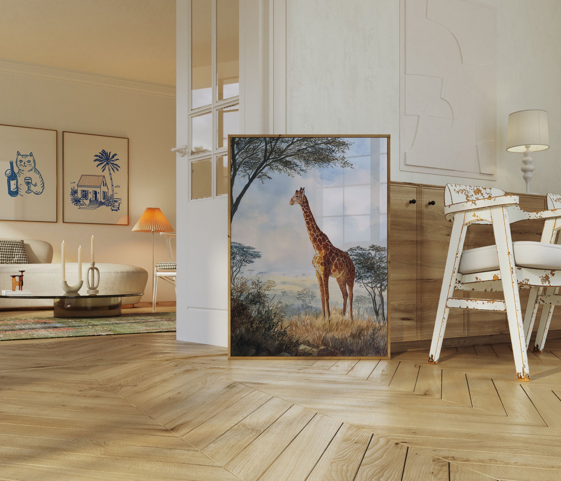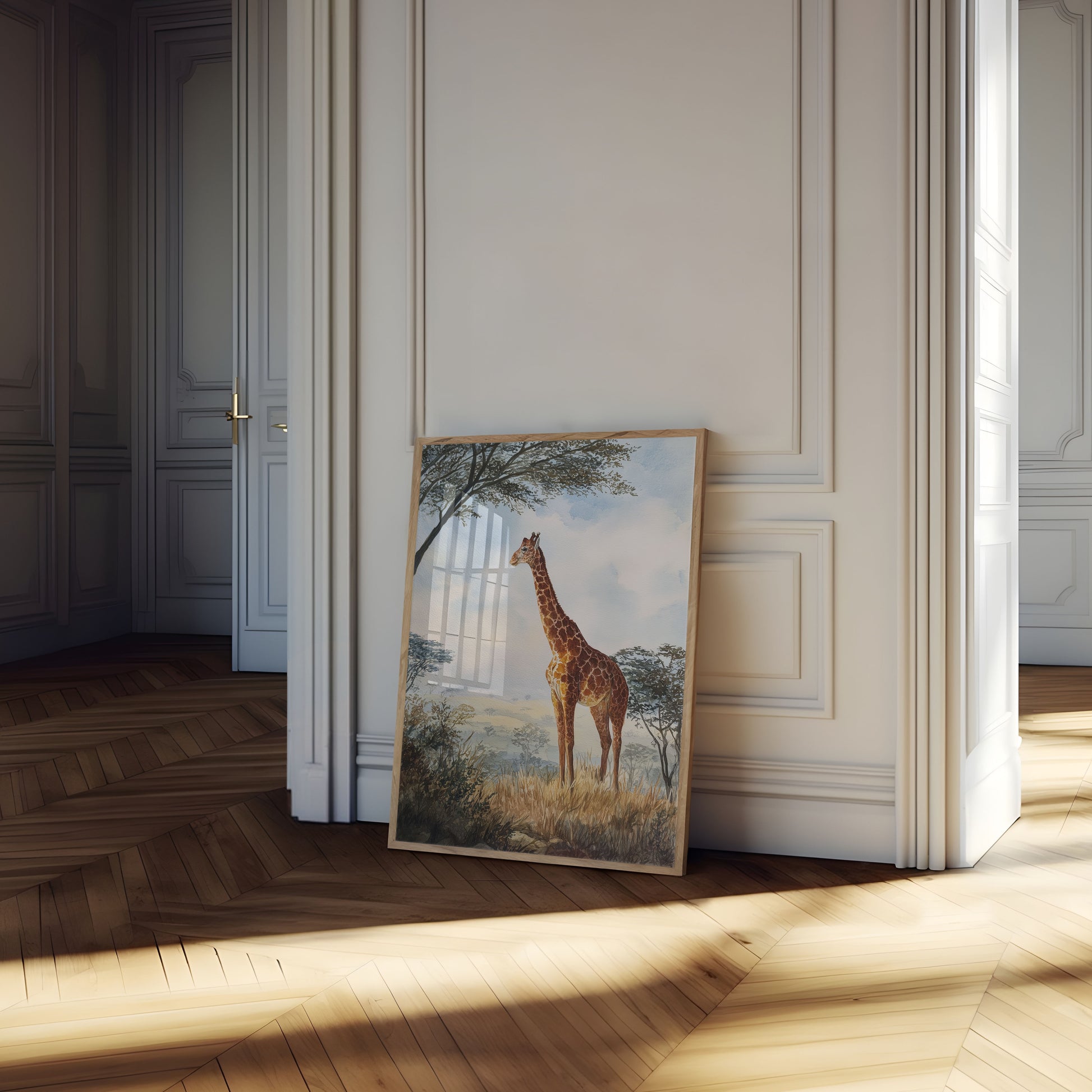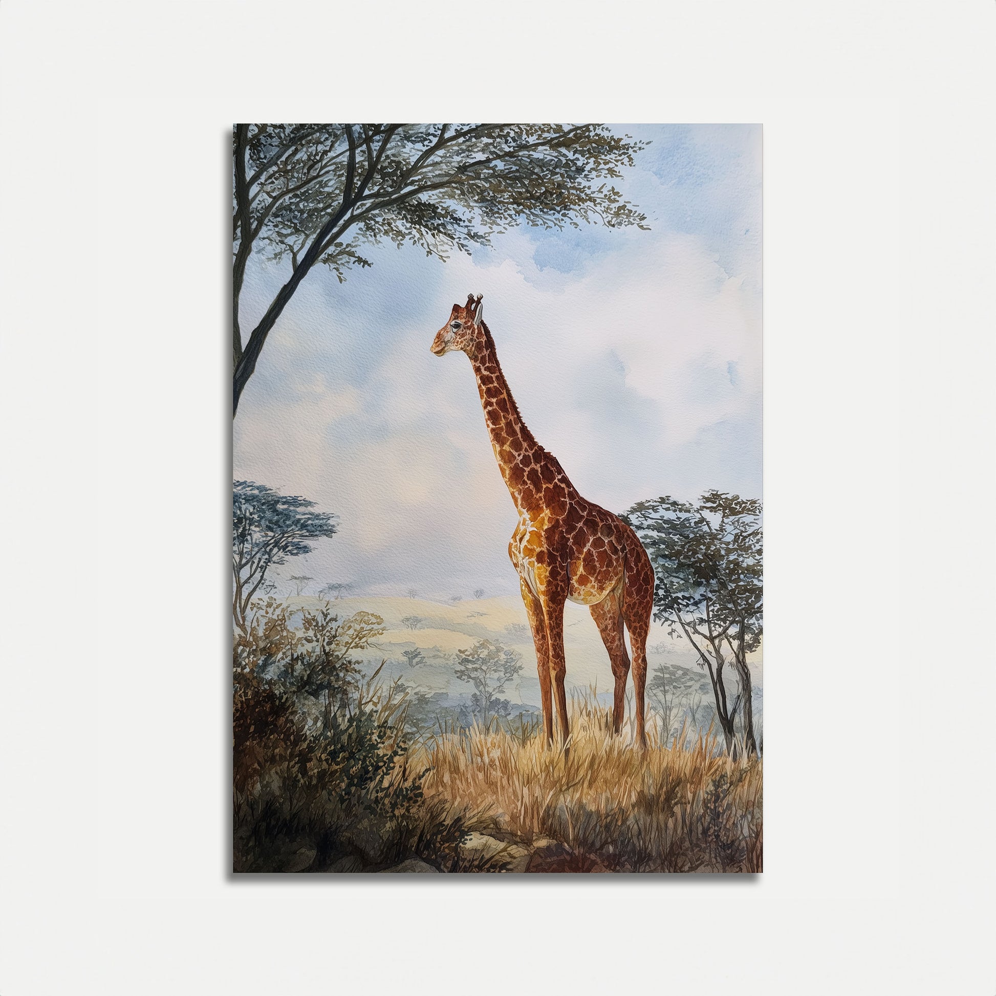 Sumérgete en la serena belleza de la sabana africana con esta impresionante acuarela. Una jirafa solitaria se yergue entre praderas doradas y árboles suaves y brumosos, capturando la esencia de la naturaleza y la tranquilidad. La delicada pincelada y la suave paleta de colores crean una escena impresionante que lleva la magia de la vida silvestre a tu hogar.