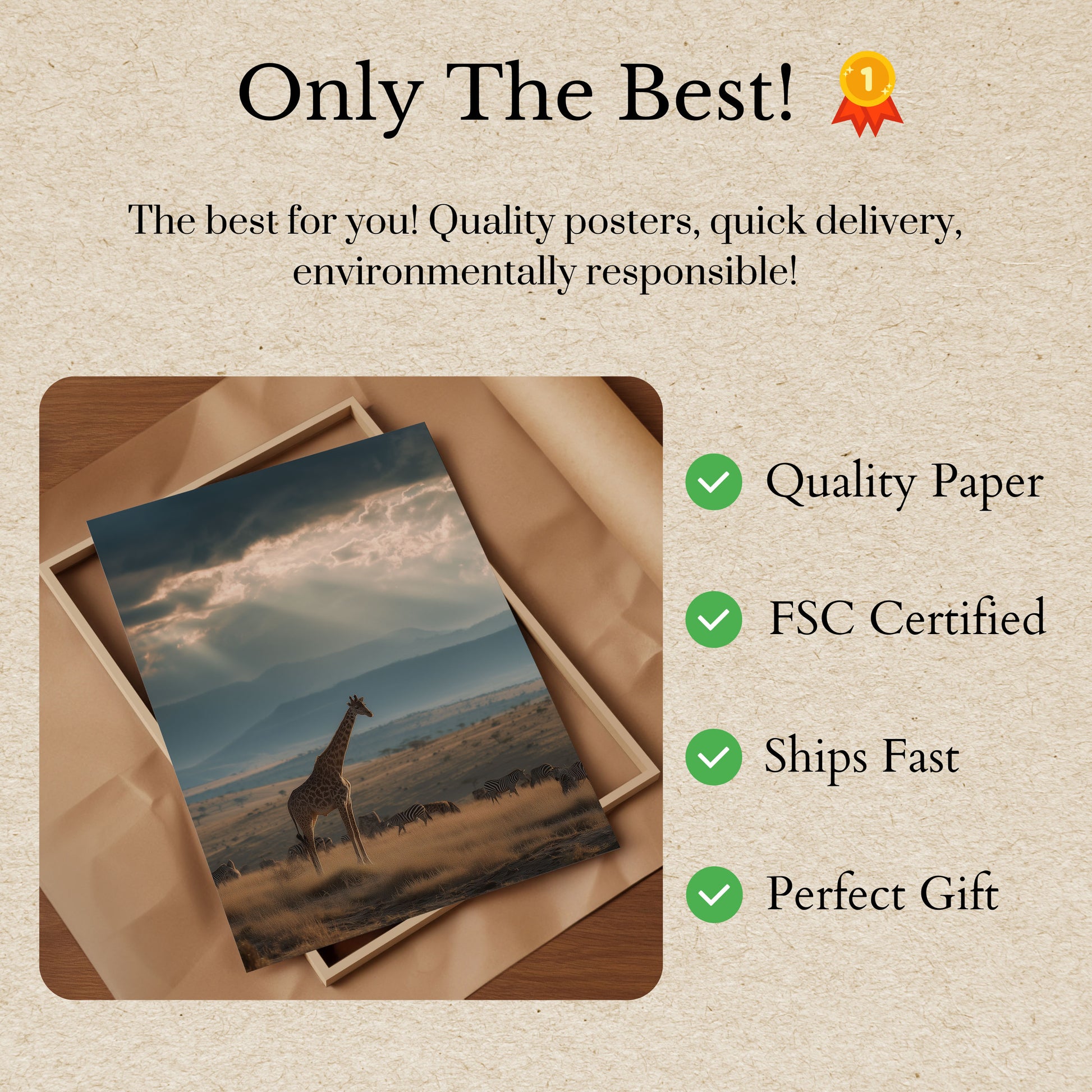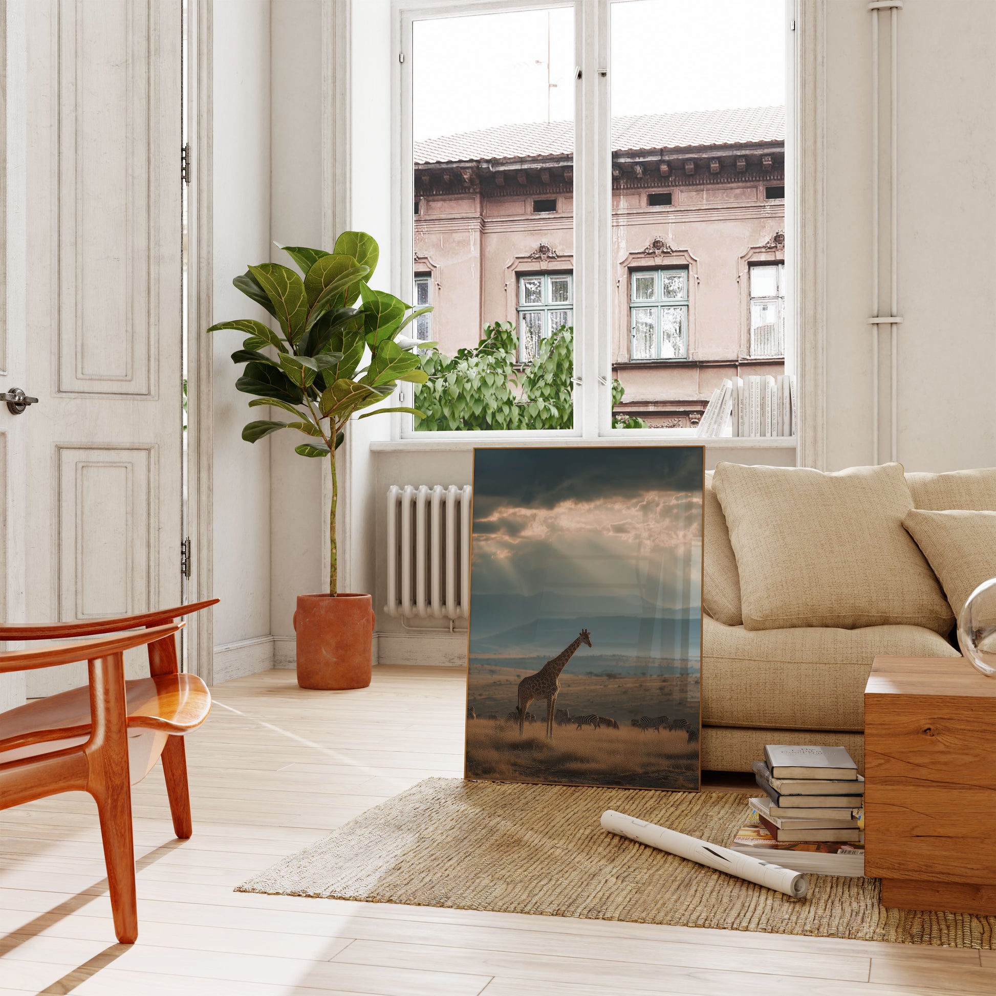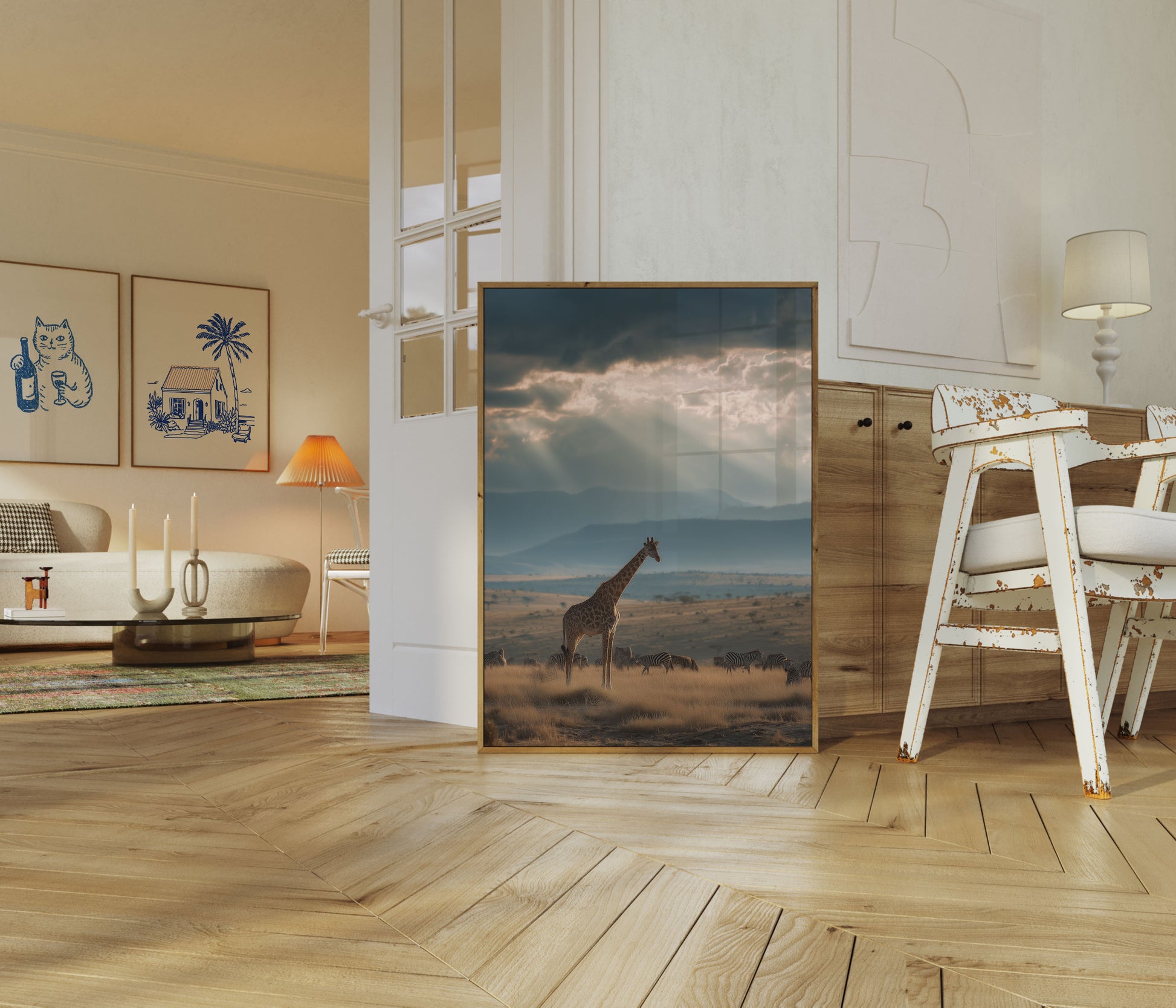 Admire la impresionante belleza de la fauna africana en este impresionante paisaje que presenta una jirafa solitaria que se yergue sobre un cielo dramático y un fondo montañoso. Las cebras pastan tranquilamente en las praderas doradas, creando una escena fascinante de armonía natural y naturaleza salvaje. La luz etérea que se abre paso entre las nubes de tormenta añade un toque mágico a este cautivador retrato de la vida silvestre.