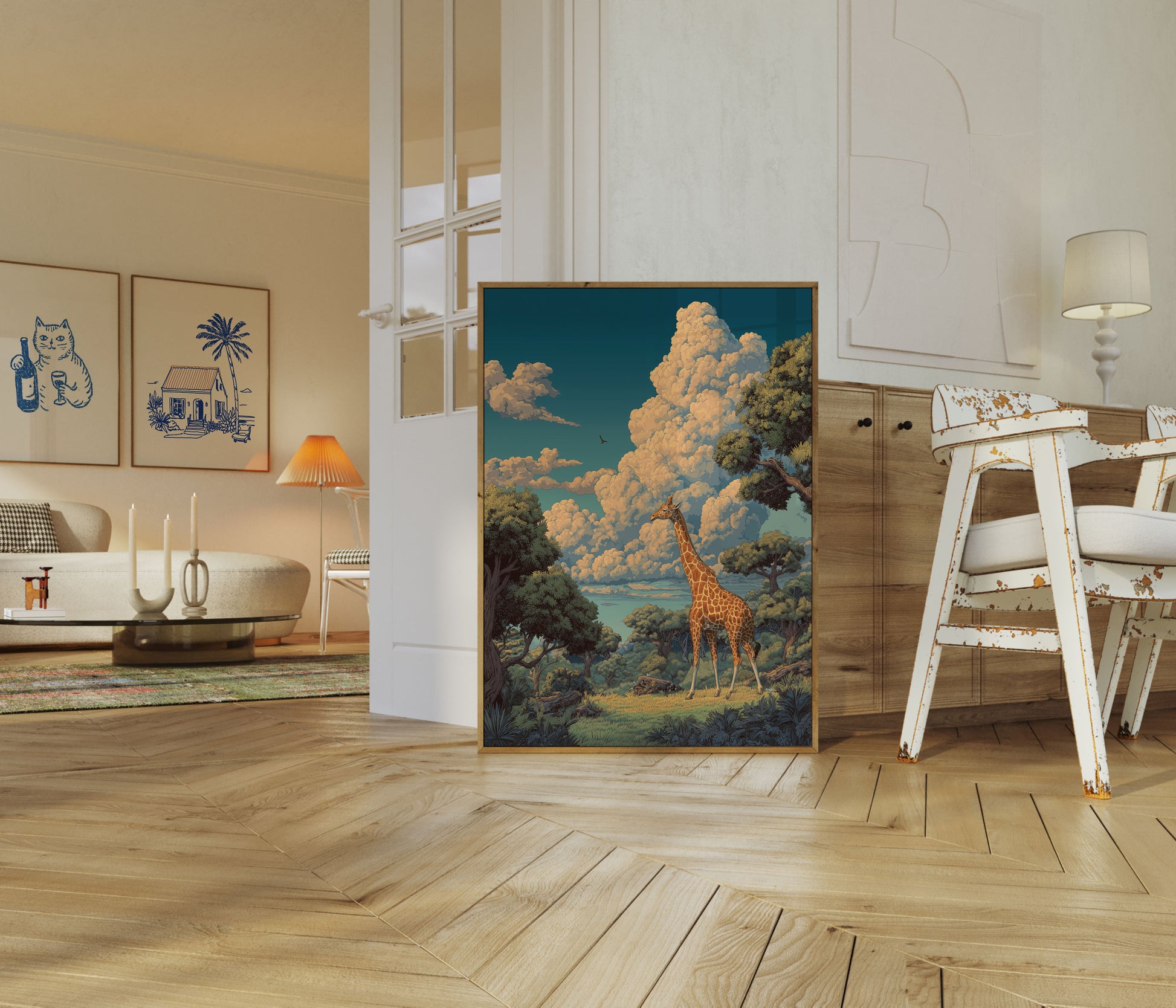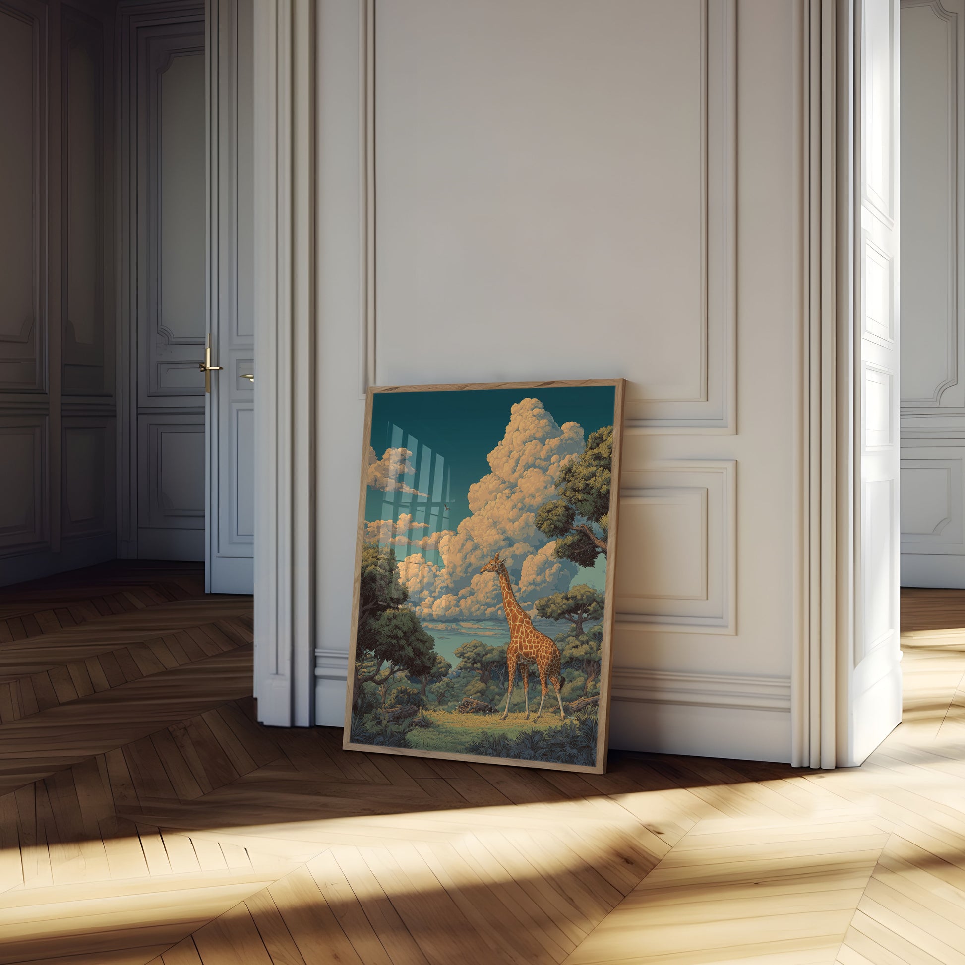 Experimente la impresionante belleza de la sabana africana en esta impresionante ilustración que presenta una jirafa solitaria con un fondo de imponentes cúmulos dorados. La rica y cálida paleta captura la mágica luz del atardecer, con frondosos árboles verdes que enmarcan un paisaje sereno que parece rebosar de belleza natural. Cada detalle de esta obra invita al espectador a un momento de tranquilidad salvaje, donde la jirafa se yergue como una silenciosa y elegante guardiana del paisaje.