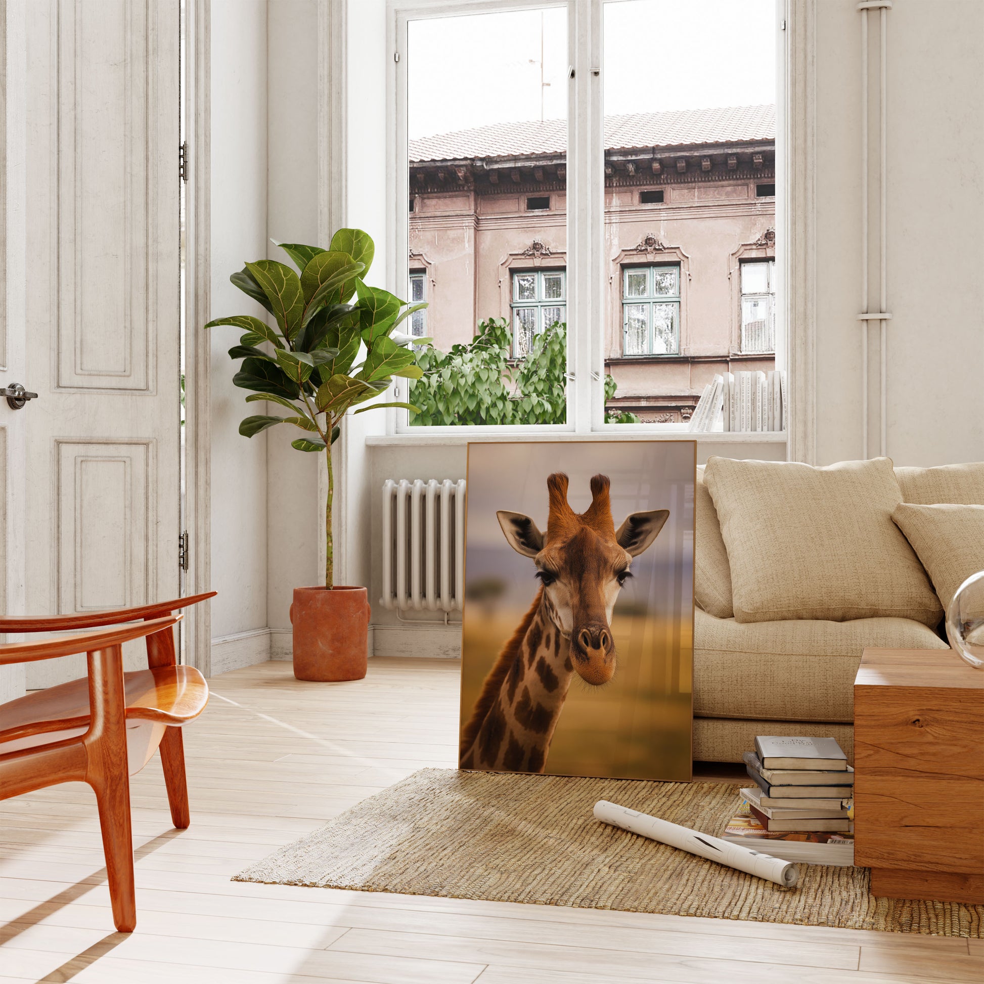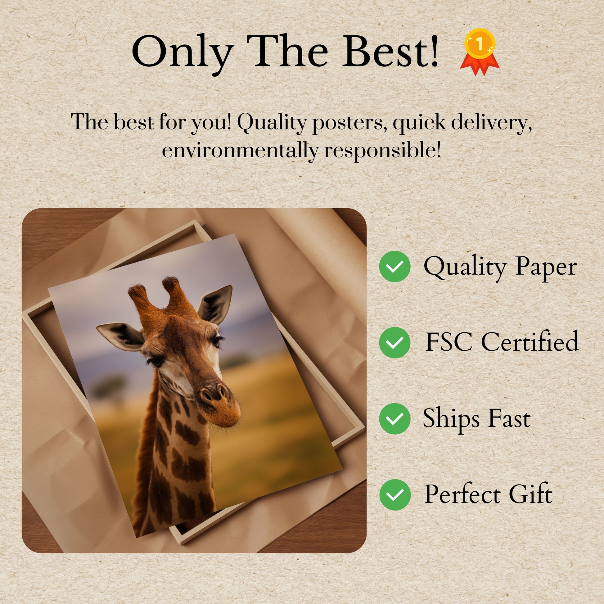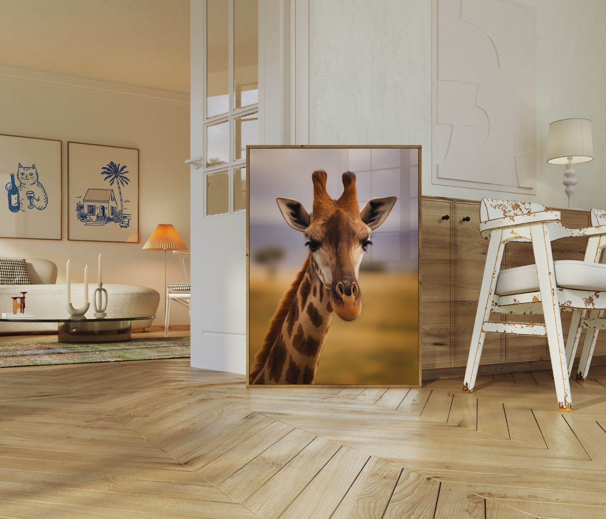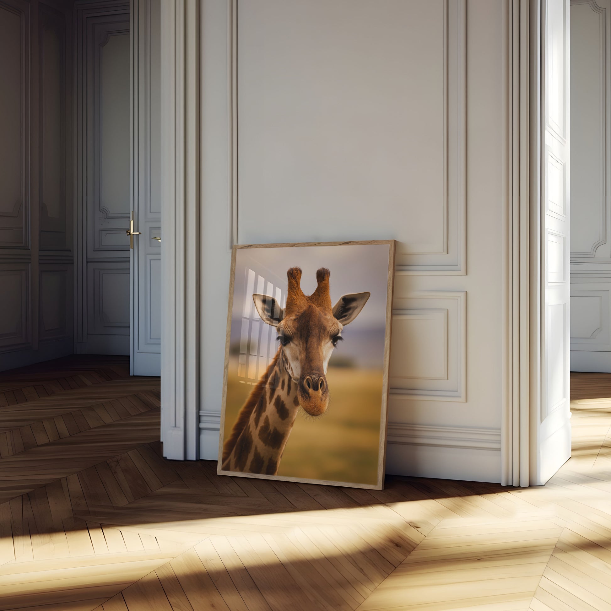 Adéntrese en la sabana dorada con este impresionante primer plano de una jirafa, que captura la belleza natural y los detalles íntimos de una de las criaturas más magníficas de la naturaleza. El cálido fondo soleado resalta el intenso pelaje marrón y crema de la jirafa, con sus ojos conmovedores y su singular patrón moteado que crea una conexión visual extraordinaria. Este póster lleva la serena elegancia de la naturaleza directamente a su hogar, invitando al espectador a detenerse y maravillarse con el espíritu apacible de este increíble animal.