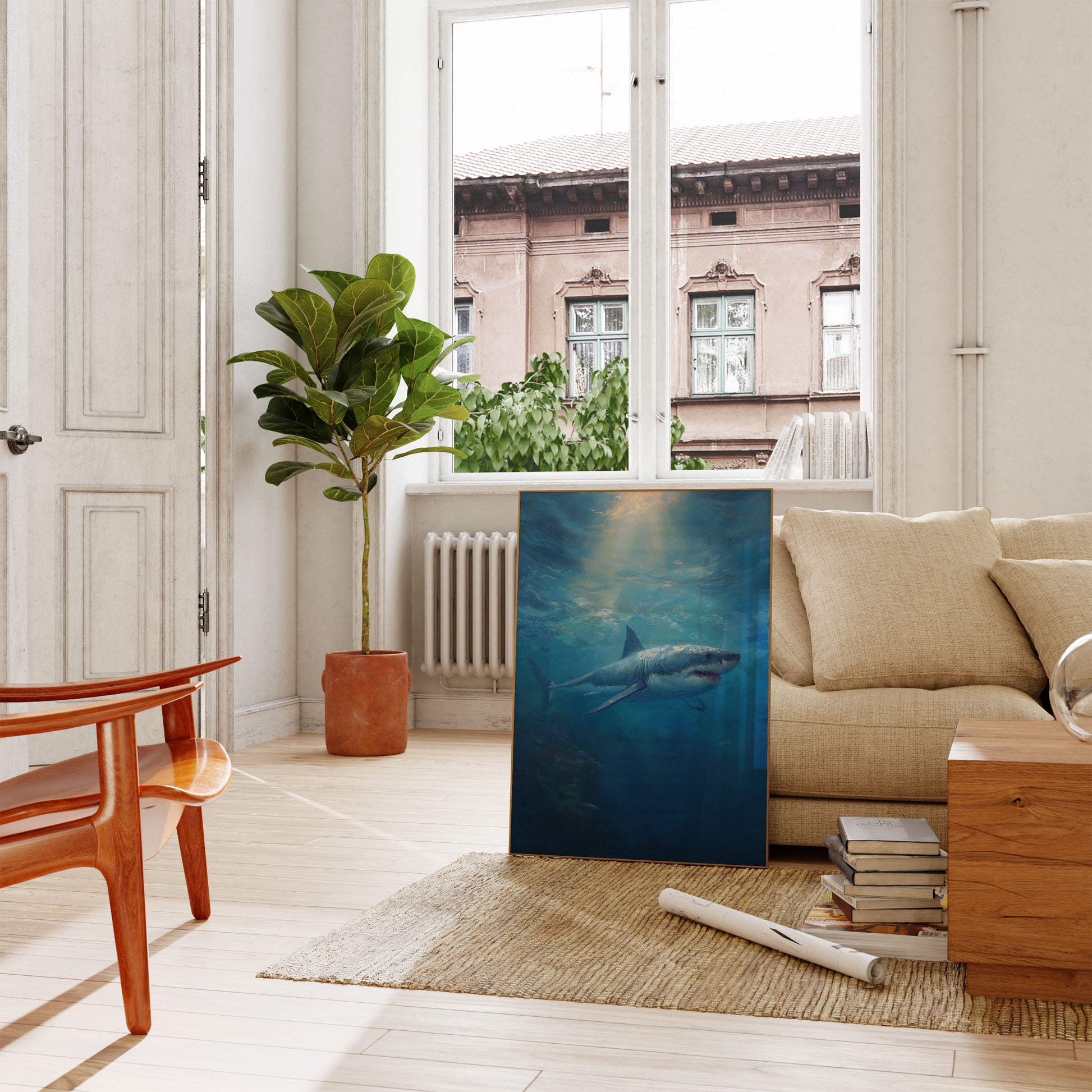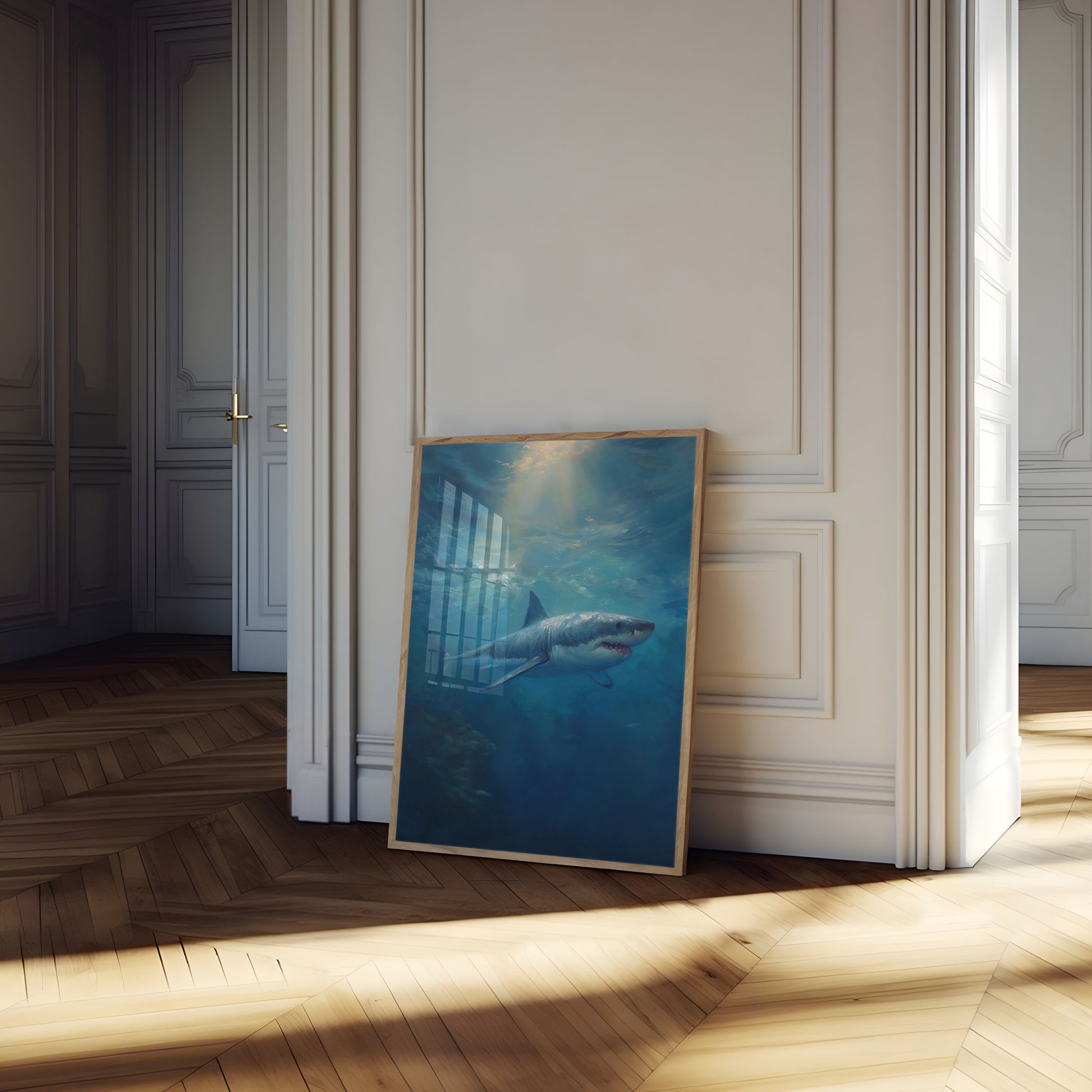 Sumérgete en las fascinantes profundidades del océano con esta impresionante escena submarina que presenta a un poderoso tiburón blanco. Bañada en etéreos tonos azules y una luz solar penetrante, la obra captura la belleza natural y la fuerza silenciosa de este magnífico depredador marino. Pinceladas suaves y texturizadas crean una atmósfera onírica que transforma este retrato marino en una experiencia visual impresionante.