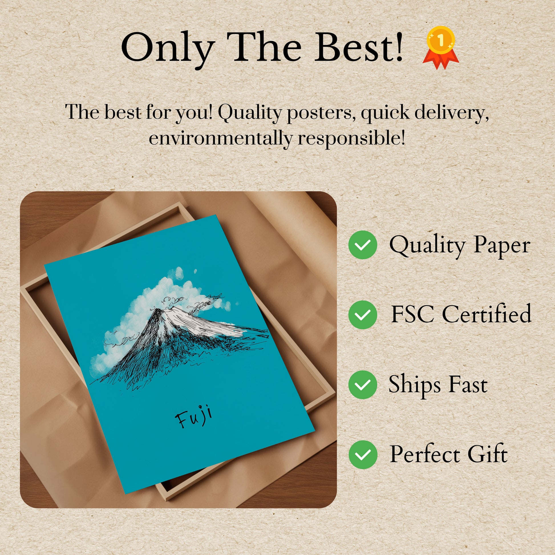 Captura la serena belleza de la montaña más emblemática de Japón con esta impresionante lámina artística del Monte Fuji. El boceto minimalista combina líneas audaces de tinta negra con un suave y ensoñador fondo turquesa, creando una representación impresionante del legendario pico volcánico. Delicadas nubes enmarcan la silueta perfecta de la montaña, evocando una sensación de tranquilidad y maravilla natural que transformará cualquier estancia.