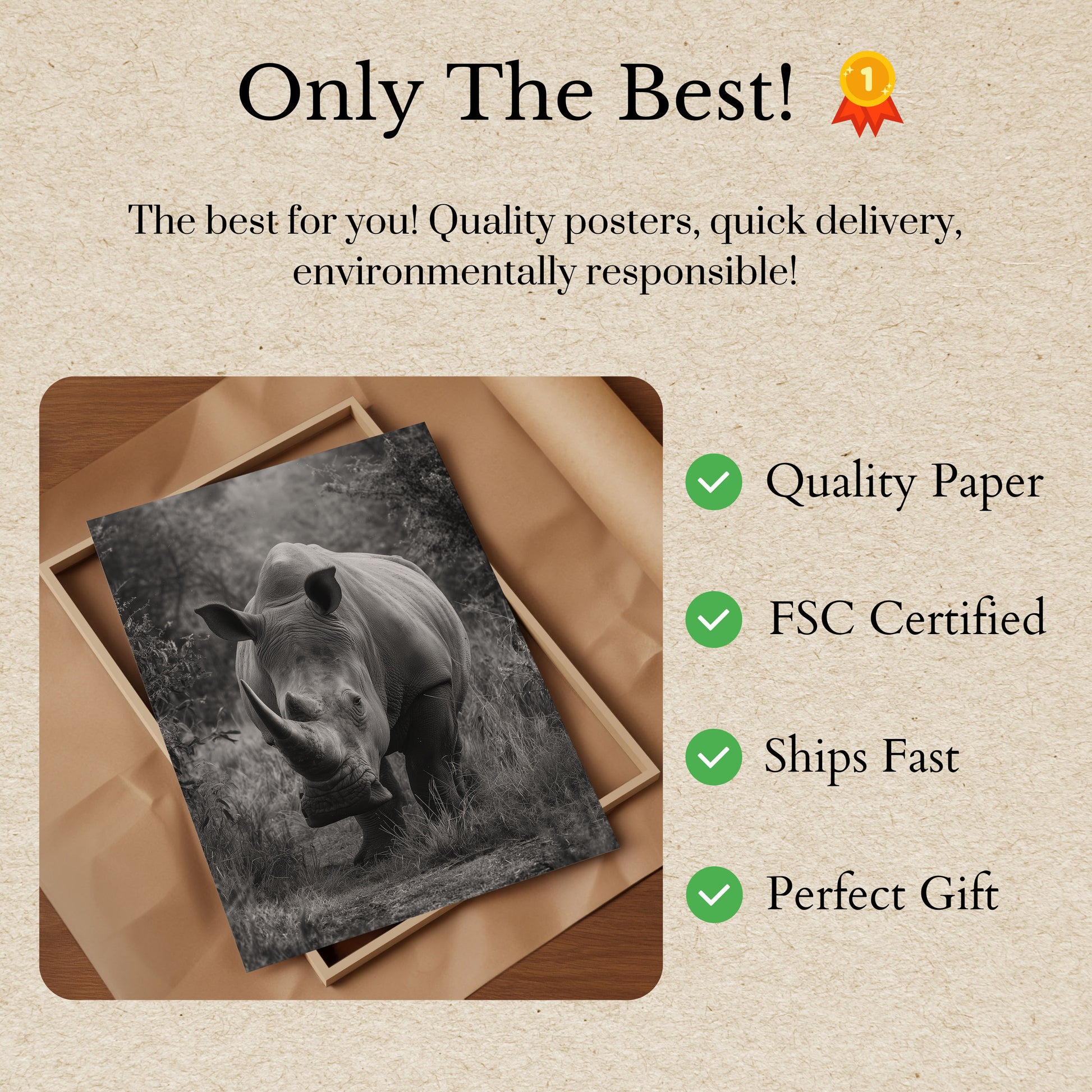 Experimente la fuerza pura y la impresionante belleza del rinoceronte africano en esta impresionante fotografía de vida silvestre en blanco y negro. Capturada con extraordinario detalle, el rinoceronte se yergue firme en una pradera neblinosa; su piel texturizada y su imponente figura revelan la magnífica fuerza de esta especie en peligro de extinción. El tratamiento monocromático resalta cada arruga, curva y contorno muscular, creando un retrato cautivador que evoca el espíritu indomable de la naturaleza.