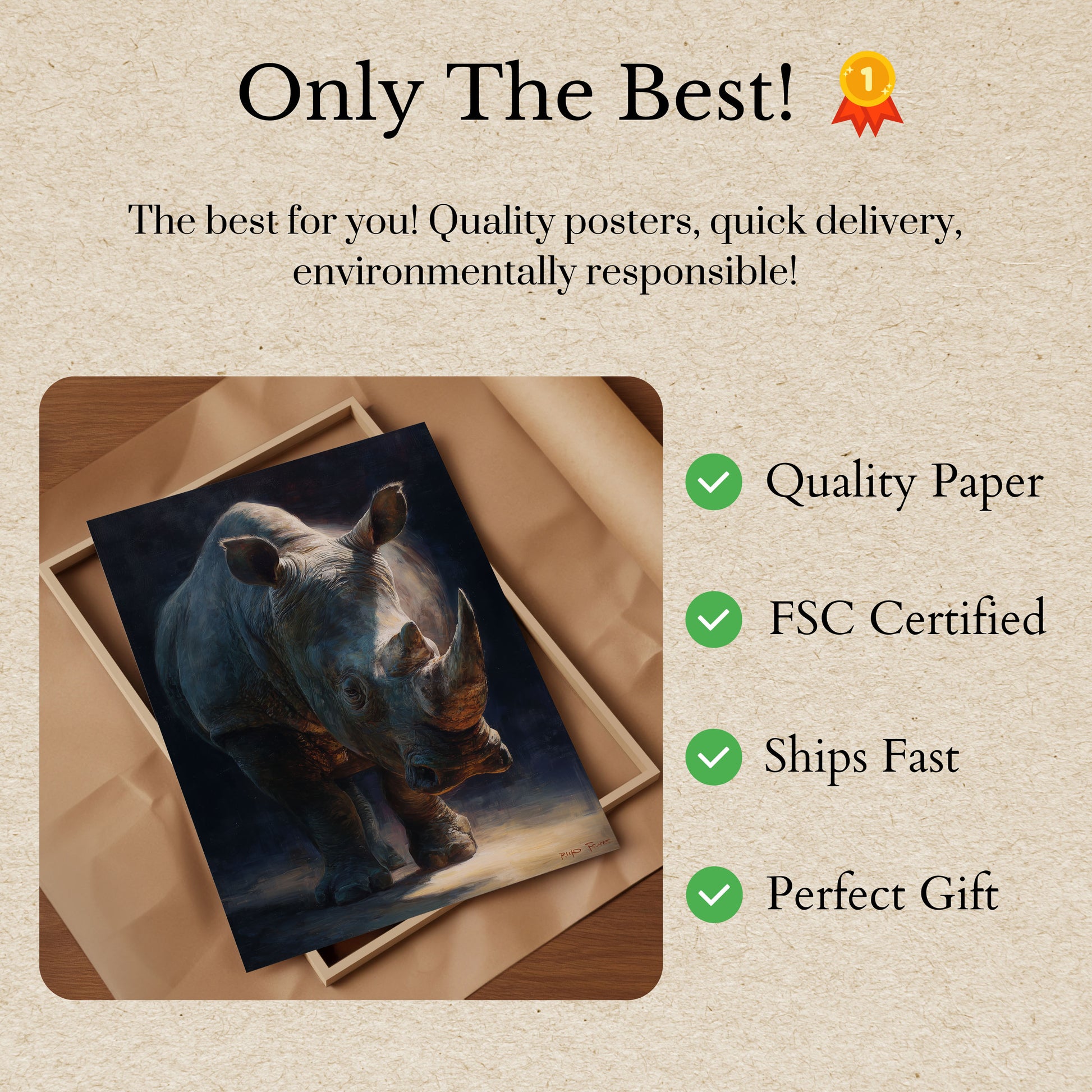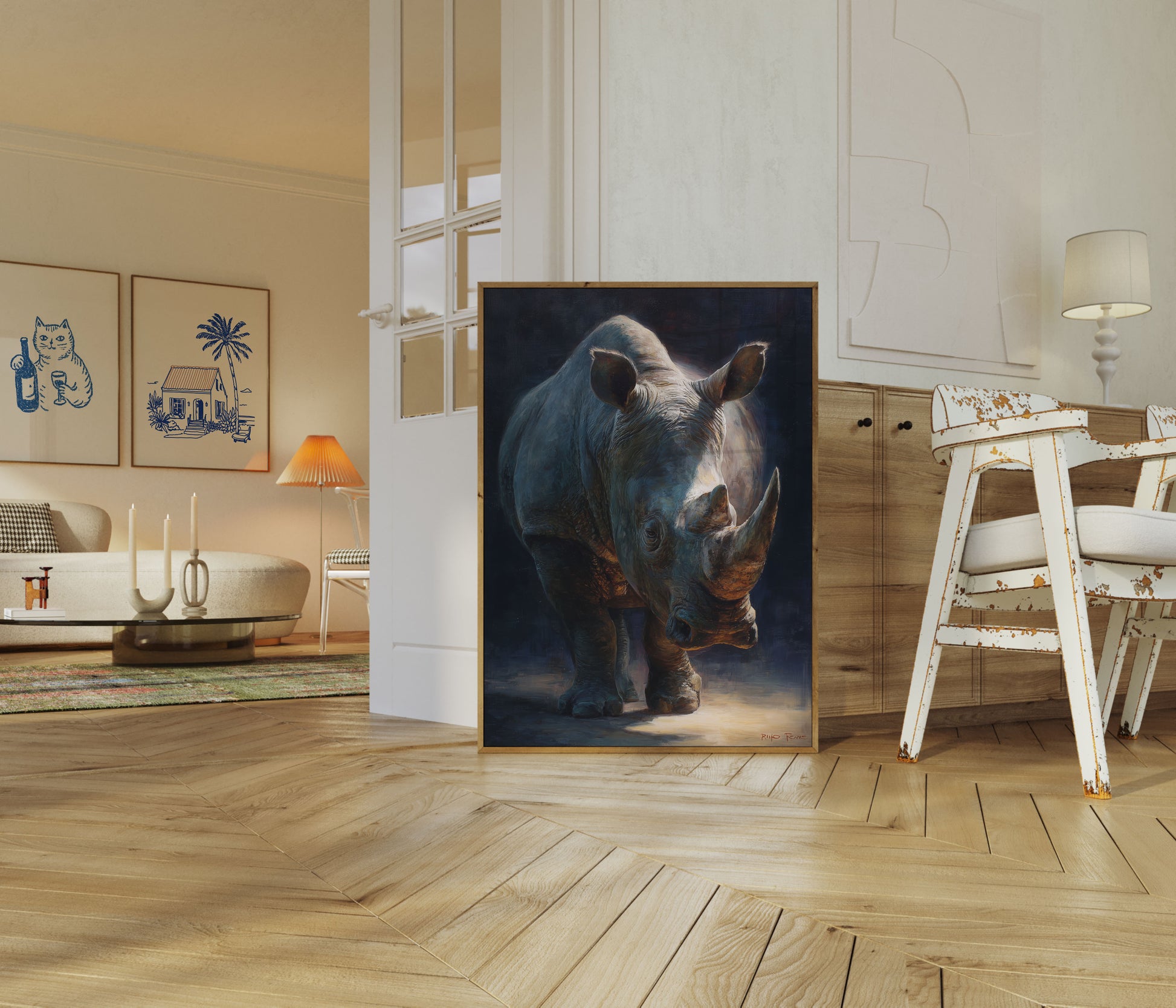 Sumérgete en la fuerza pura y el impresionante detalle de este impresionante retrato de rinoceronte. Capturado en una dramática interacción de azules profundos, marrones cálidos y reflejos luminosos, esta obra de arte da vida a la magnífica criatura con una extraordinaria profundidad emocional. El rinoceronte se yergue firme, su piel texturizada y su mirada penetrante revelan fuerza y vulnerabilidad contra un fondo misterioso y sombrío.