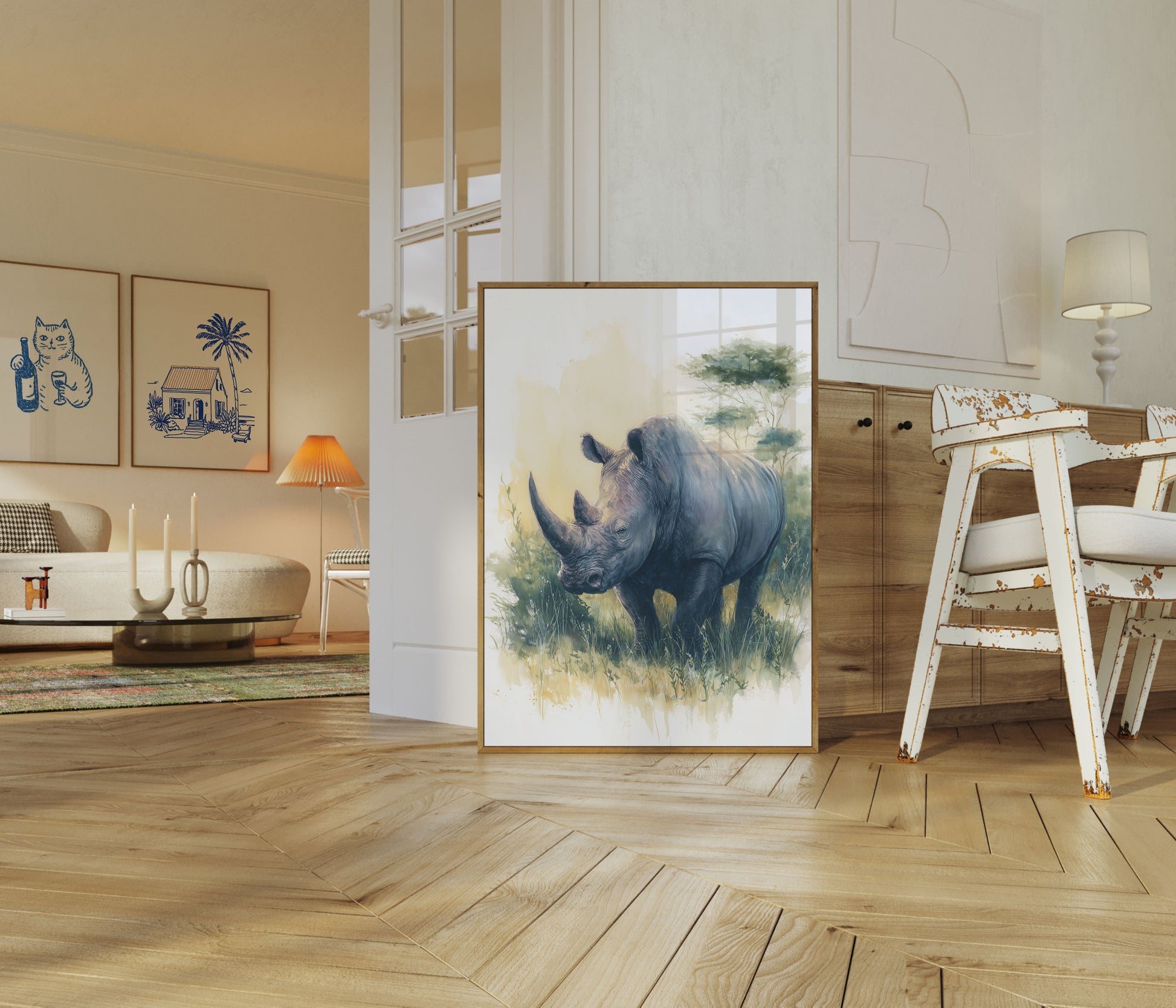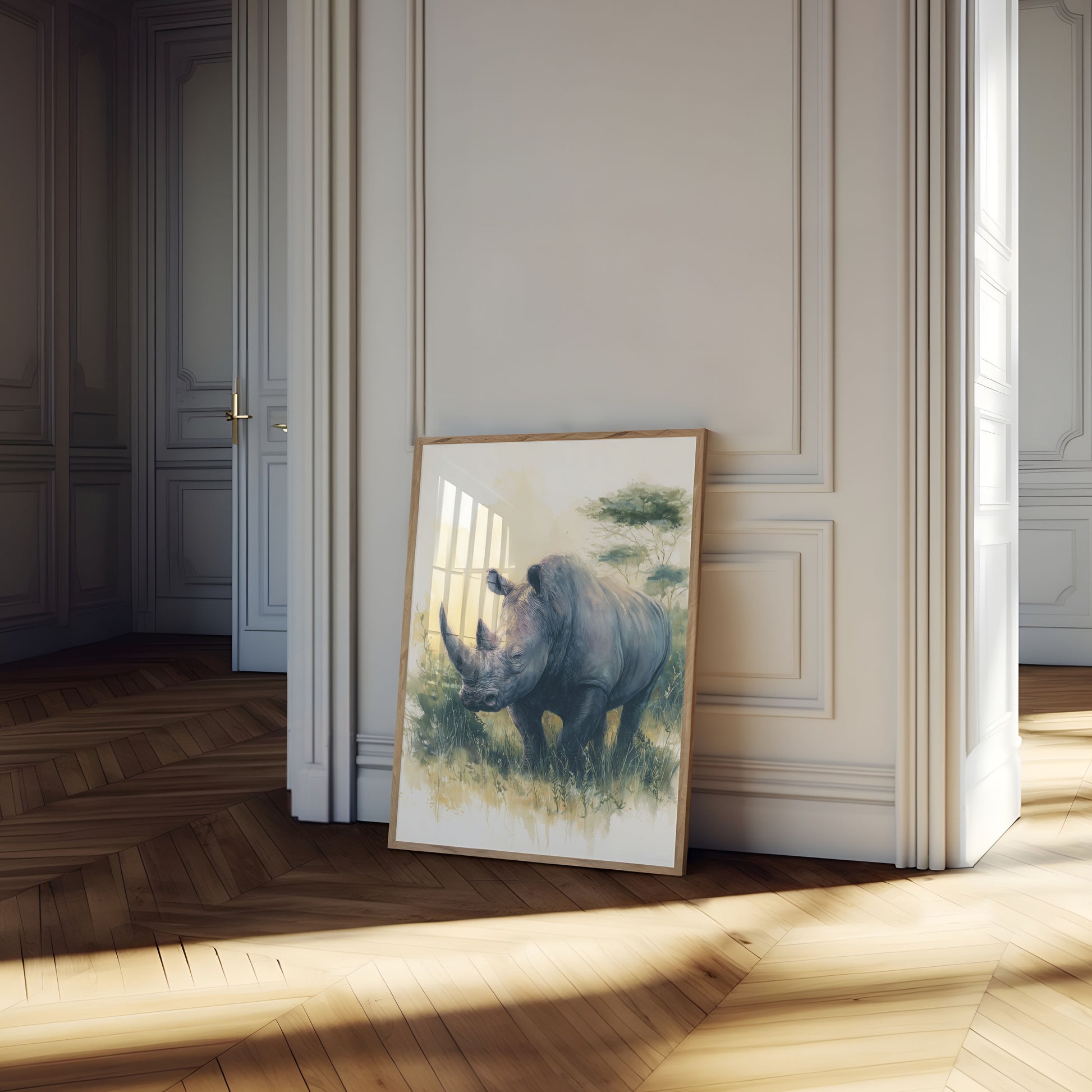 Sumérgete en la belleza natural de la fauna africana con este impresionante retrato de rinoceronte en acuarela. Azules suaves y cálidos tonos amarillos crean un paisaje de ensueño, capturando la esencia poderosa y vulnerable de esta magnífica criatura. Las delicadas pinceladas y el fondo etéreo te transportan a las serenas praderas donde deambula este increíble animal.