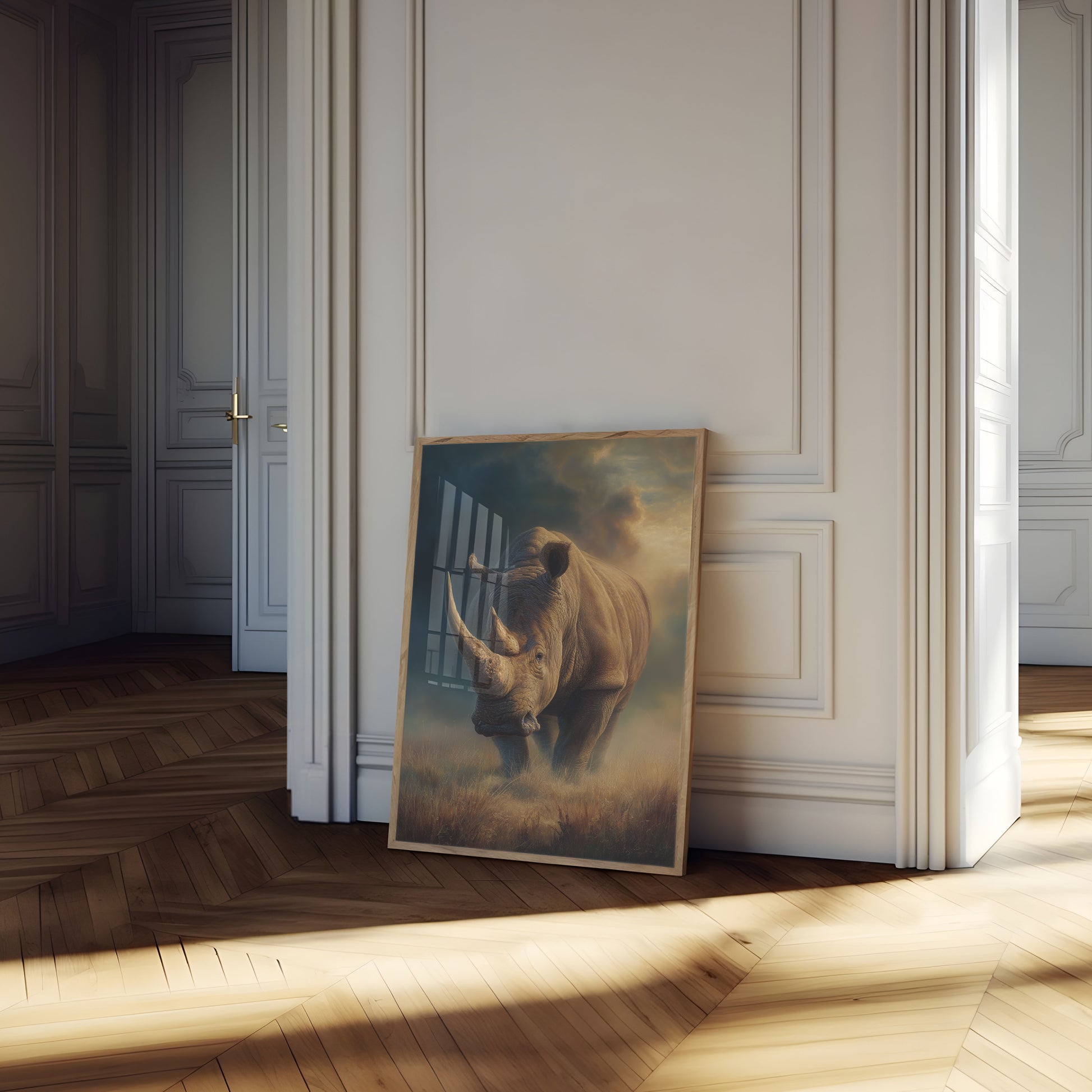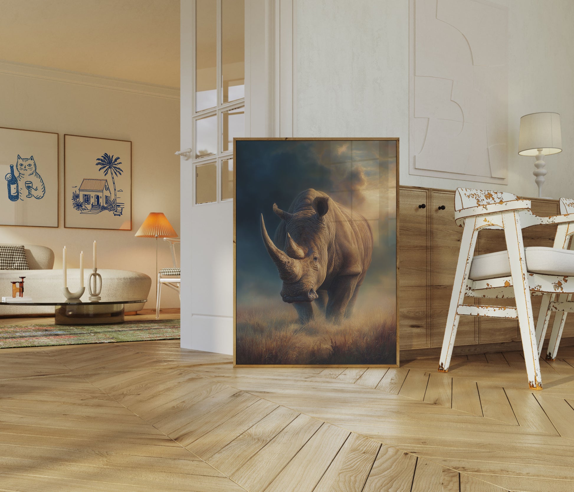 Sumérgete en la fuerza pura y la belleza sobrecogedora de esta impresionante obra de arte sobre rinocerontes. Con un cielo dramático y tenebroso como fondo, iluminado por una luz dorada, este retrato realista captura la increíble textura y fuerza de un rinoceronte en medio de praderas azotadas por el viento. Los intrincados detalles y la atmósfera luminosa crean una poderosa conexión emocional, invitando al espectador a apreciar la magnífica presencia de esta especie en peligro de extinción.