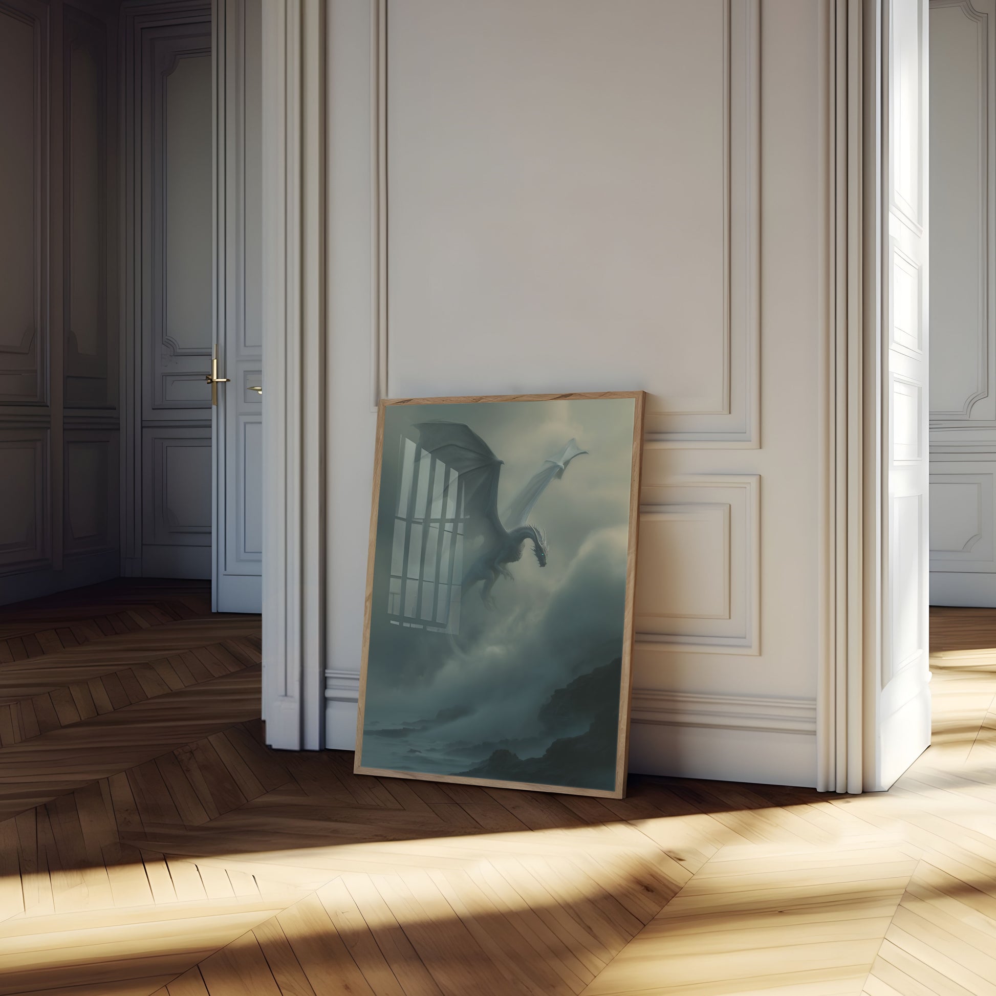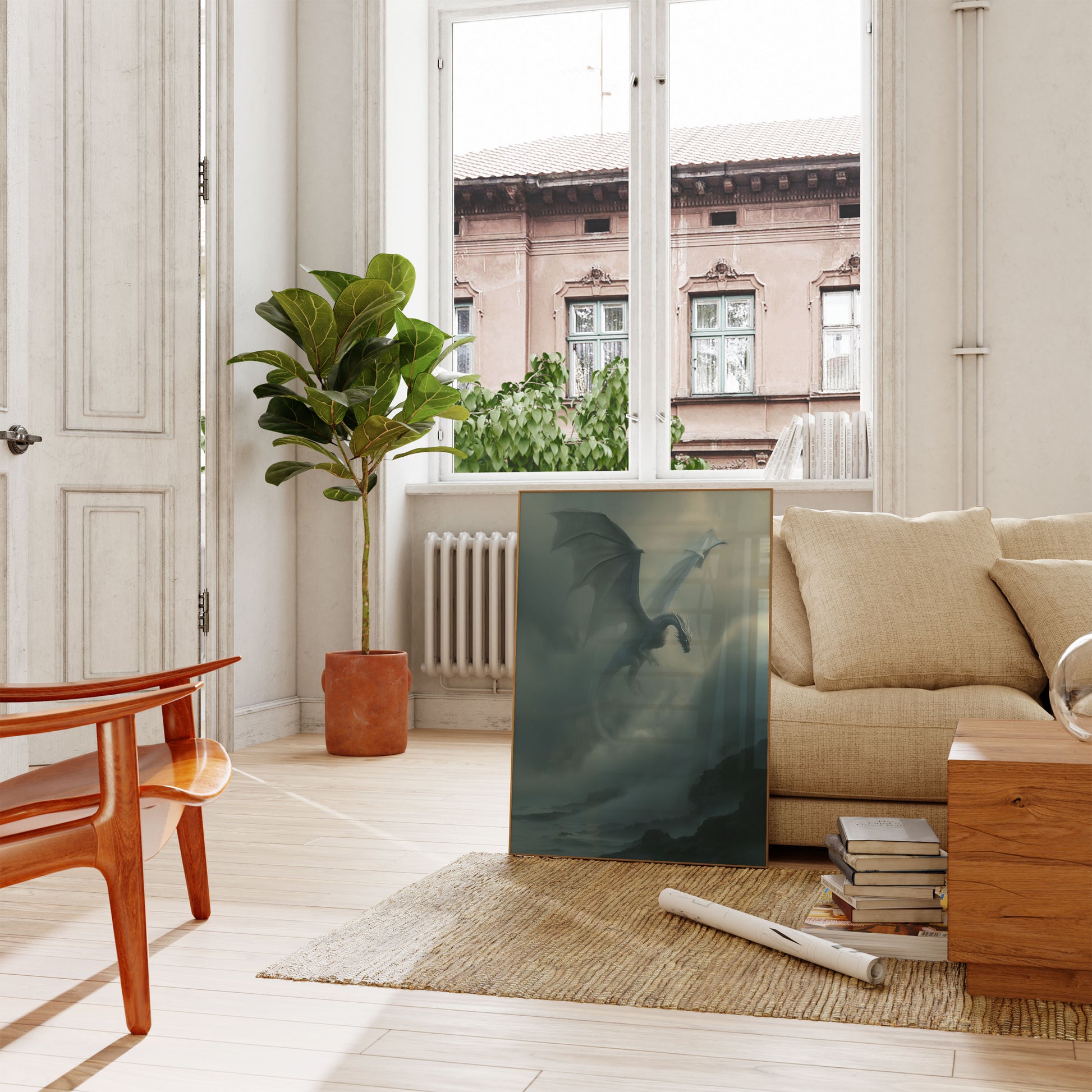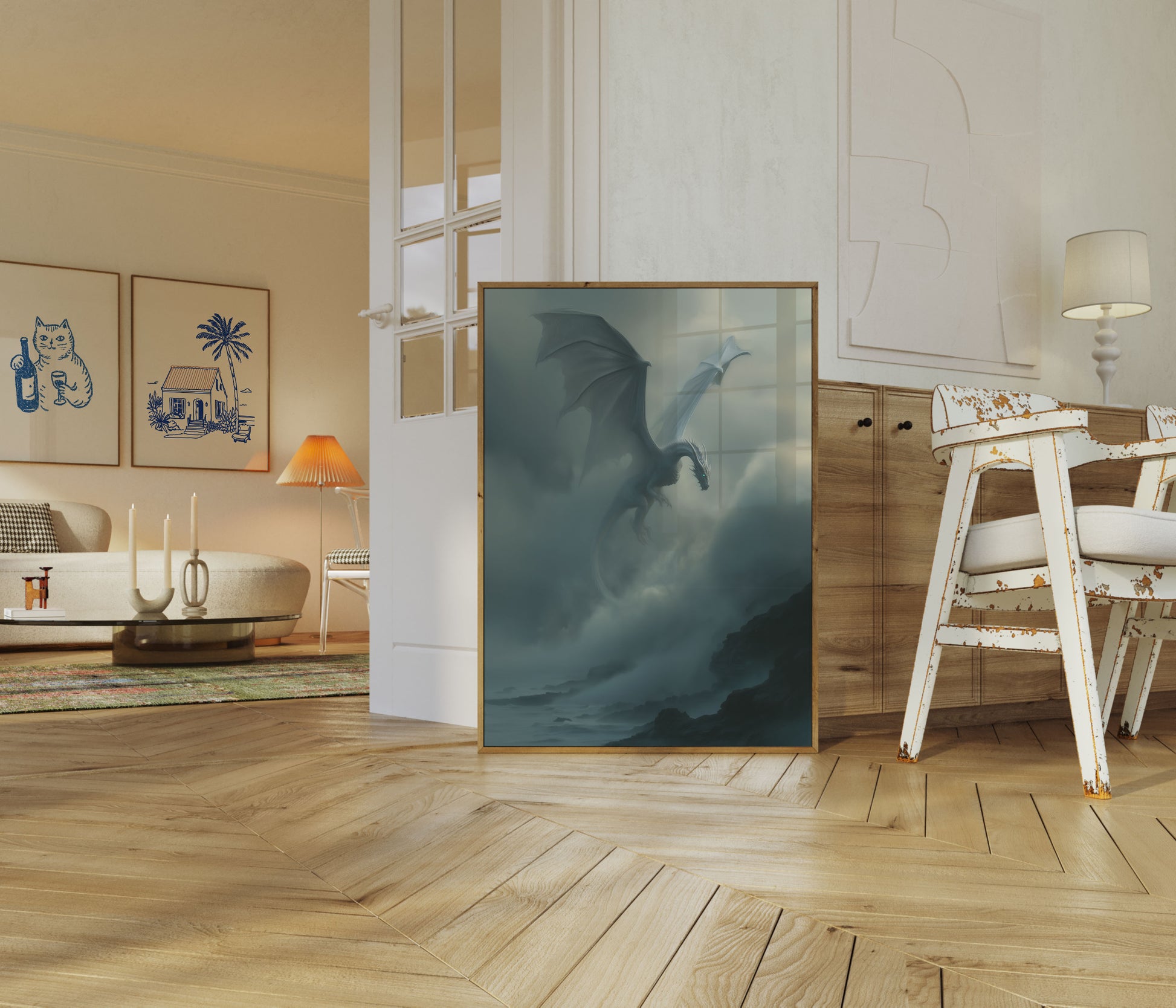 Un dragón de una belleza cautivadora emerge de entre las nubes grises y arremolinadas; su silueta oscura se recorta imponente contra un místico paisaje montañoso. Etérea y majestuosa, la criatura alada flota con penetrantes ojos azules, proyectando una atmósfera sobrenatural que combina fantasía y energía primigenia. La paleta de colores verde azulado y pizarra, tenue y melancólica, crea una sensación envolvente de misterio y magia ancestral.