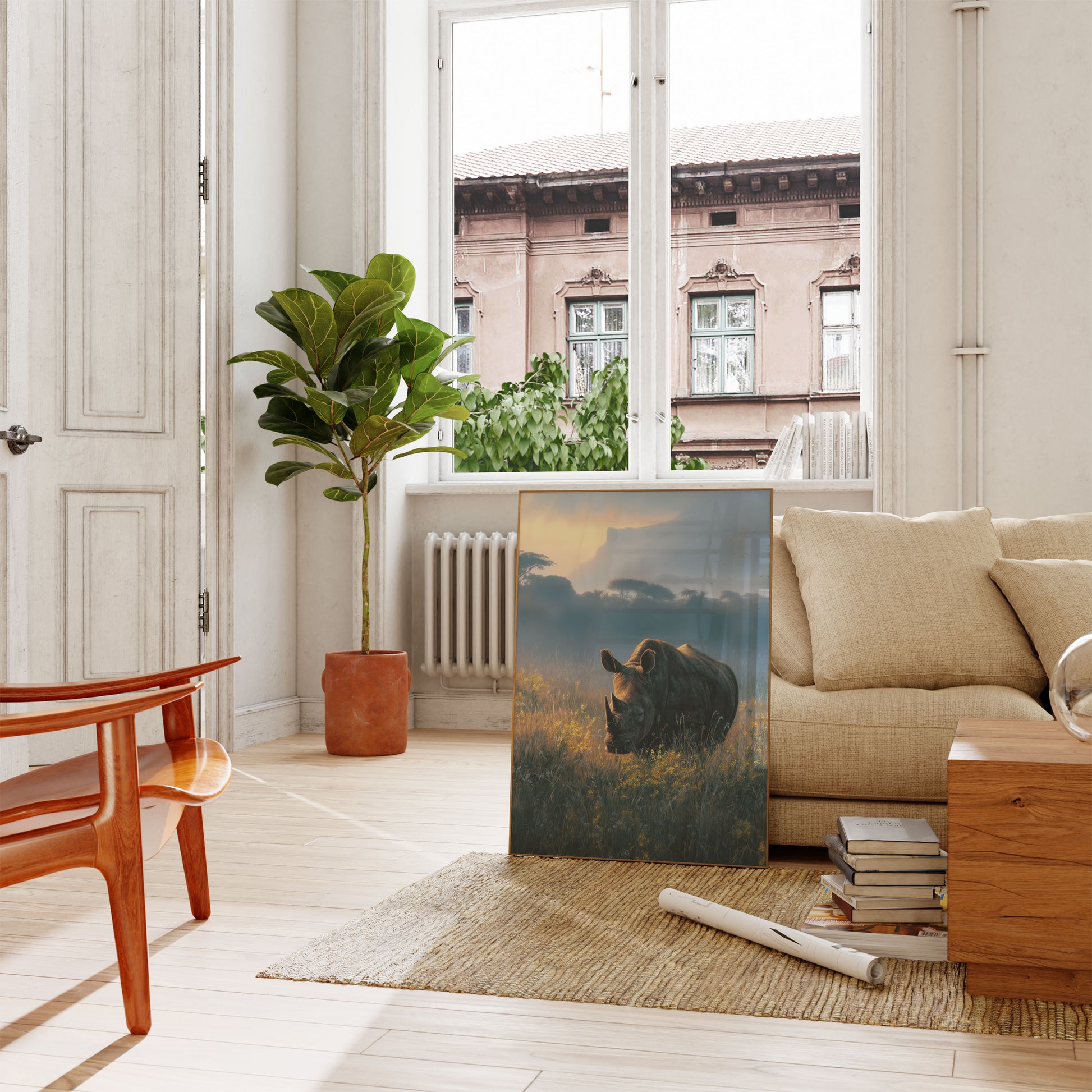 Sumérgete en la impresionante serenidad de un amanecer en la sabana africana con este impresionante retrato de rinoceronte. Una suave luz dorada se filtra a través de un paisaje brumoso, iluminando a un majestuoso rinoceronte rodeado de delicadas flores silvestres amarillas y hierbas ondulantes. La evocadora escena captura la belleza natural y la serena fuerza de esta magnífica criatura en un entorno etéreo y de ensueño.