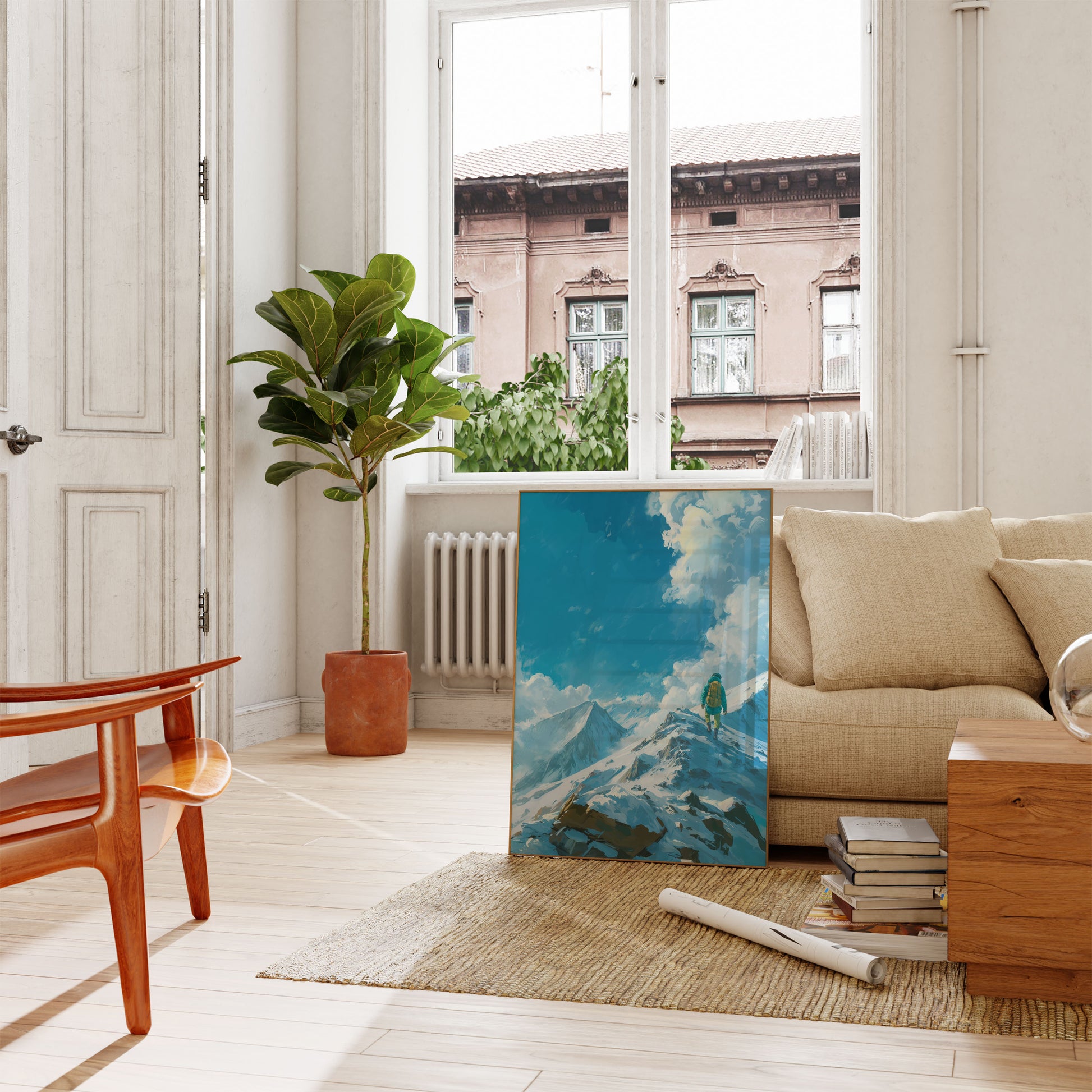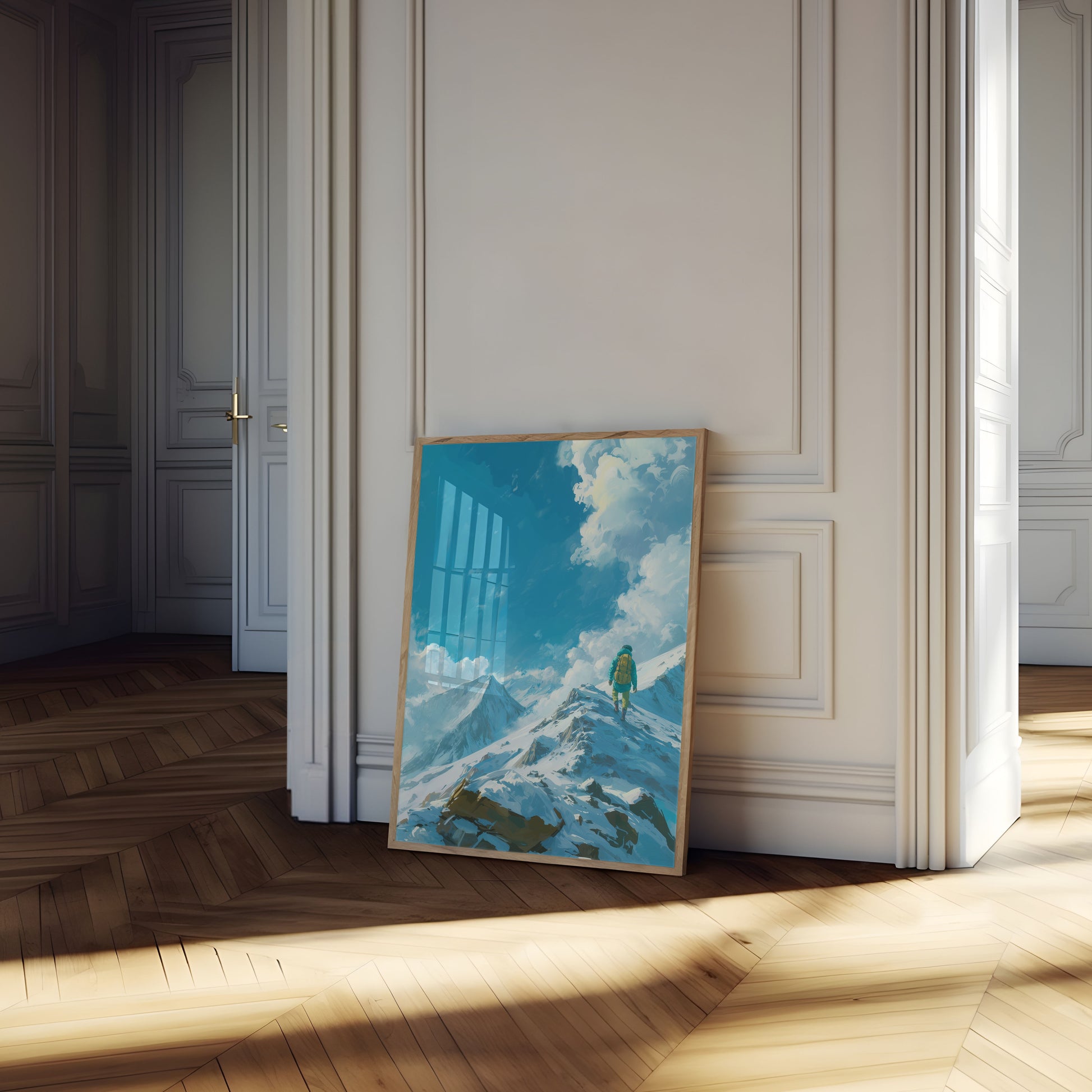 Sumérgete en la impresionante soledad de la aventura alpina con esta impresionante obra de arte de montañismo. Un explorador solitario, con una chaqueta amarilla vibrante, avanza con cuidado por una cresta nevada, eclipsado por majestuosos picos escarpados y nubes ondulantes que tiñen el cielo de fascinantes tonos azules y blancos. La imagen captura la belleza natural, el aislamiento y la profunda determinación humana frente al paisaje más desafiante de la naturaleza.