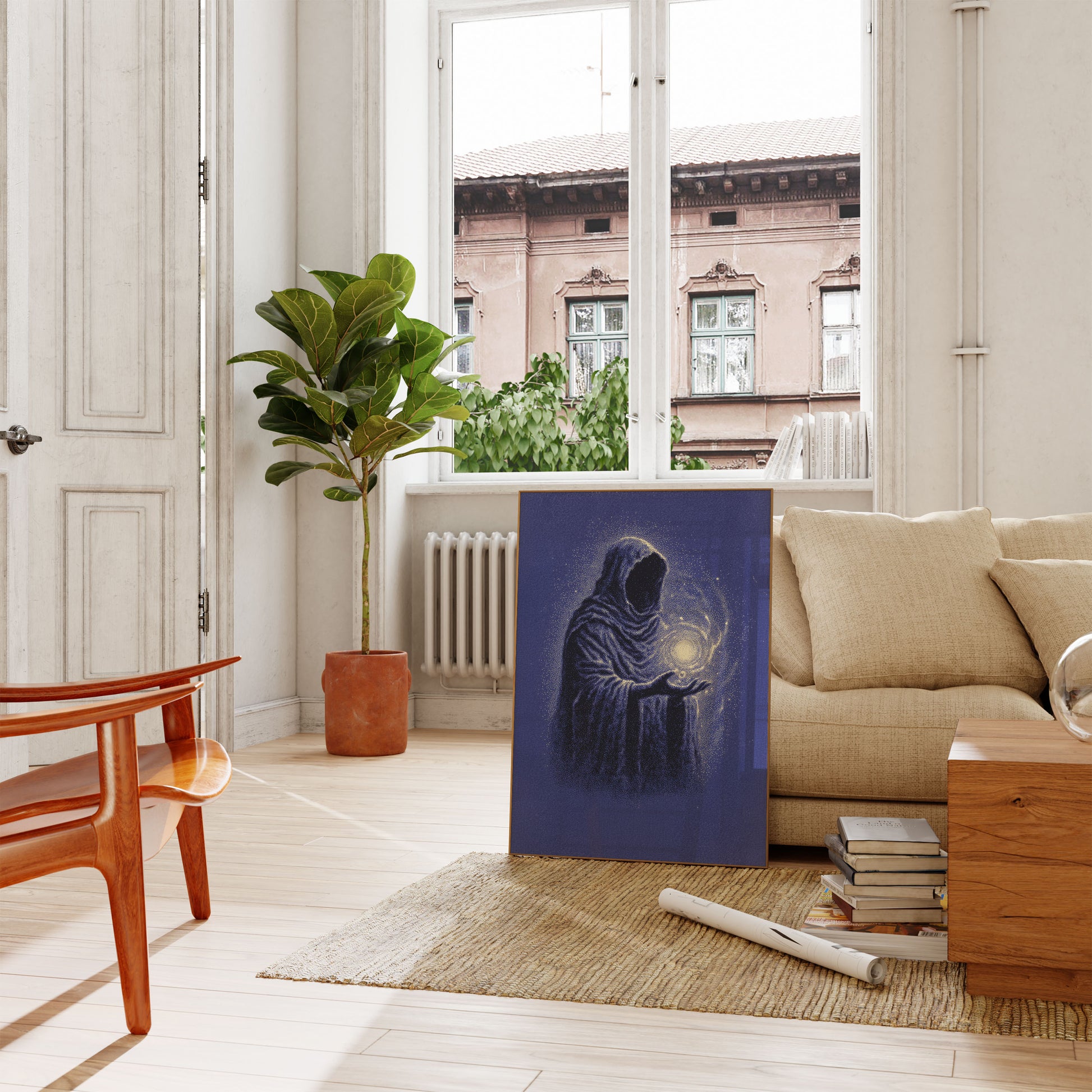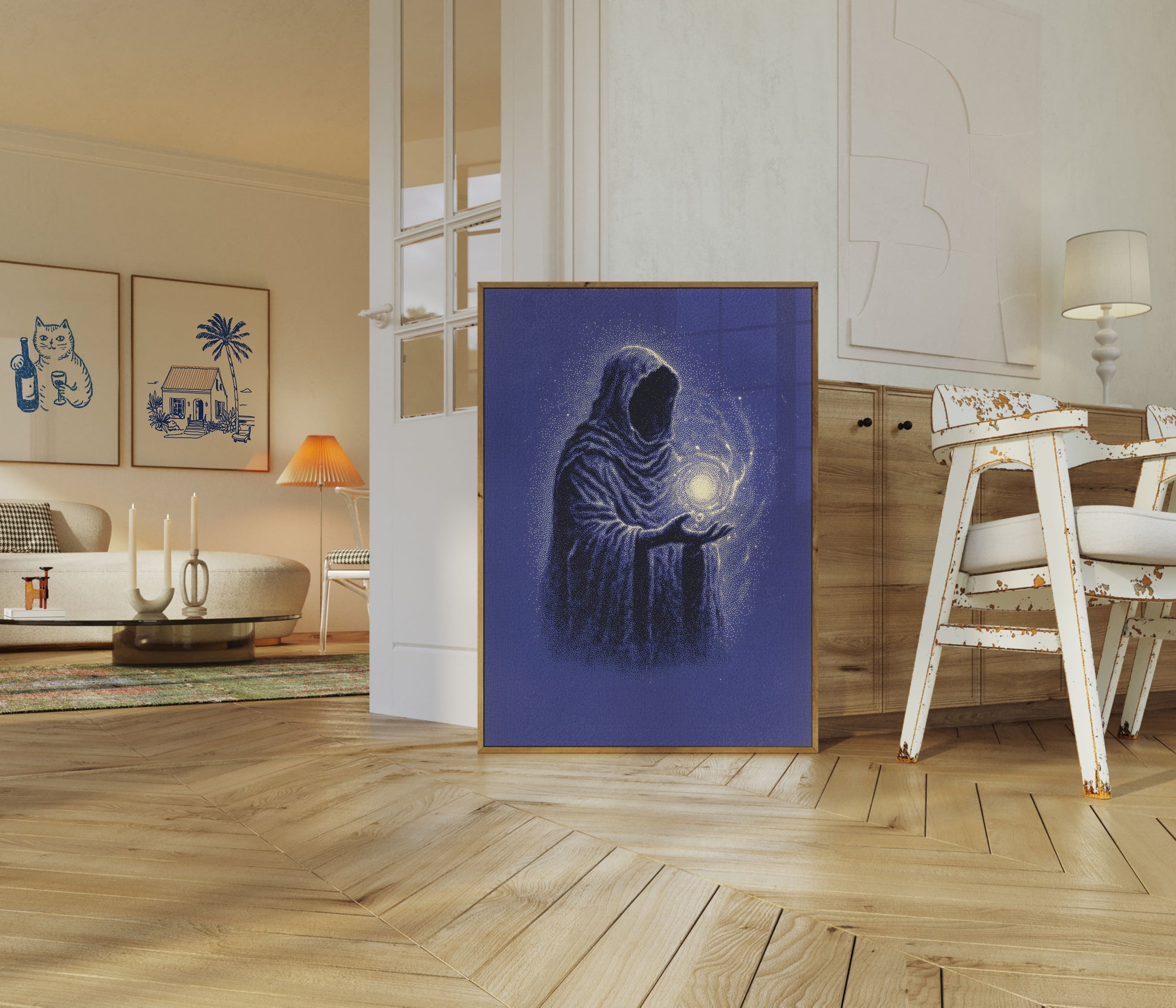 Esta cautivadora obra de arte retrata una figura envuelta en ropajes contemplando una esfera brillante de luz contra un cielo nocturno estrellado. La imagen combina elementos de misterio y asombro, con las prendas ondulantes de la figura representadas en azules profundos y negros que parecen disolverse en el fondo cósmico. La luz dorada que emana de la esfera sostenida crea un contraste impactante, simbolizando esperanza, magia o iluminación espiritual mientras irradia hacia afuera en partículas centelleantes que se mezclan sin fisuras con las estrellas circundantes. Perfecto para cualquiera que ame temas celestiales, espacios de meditación o arte atmosférico surrealista.